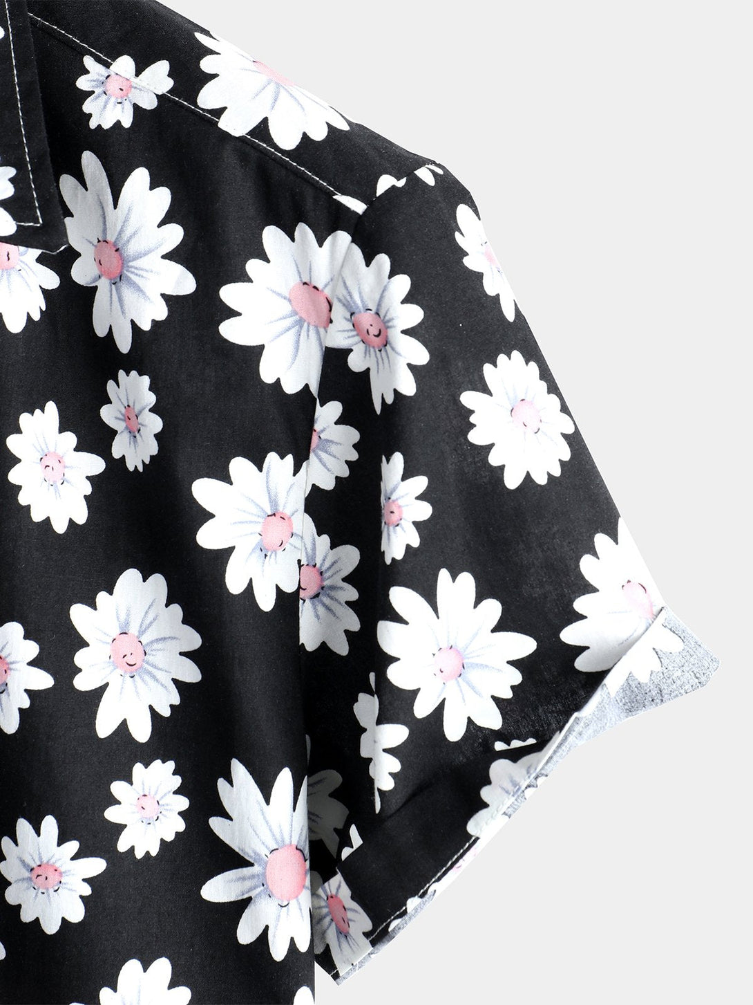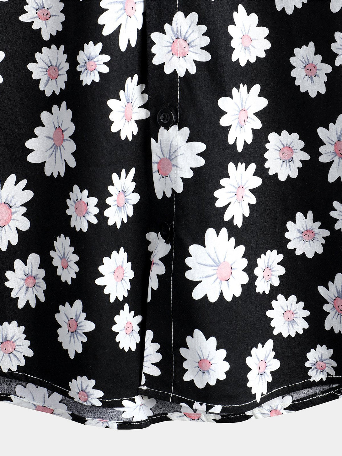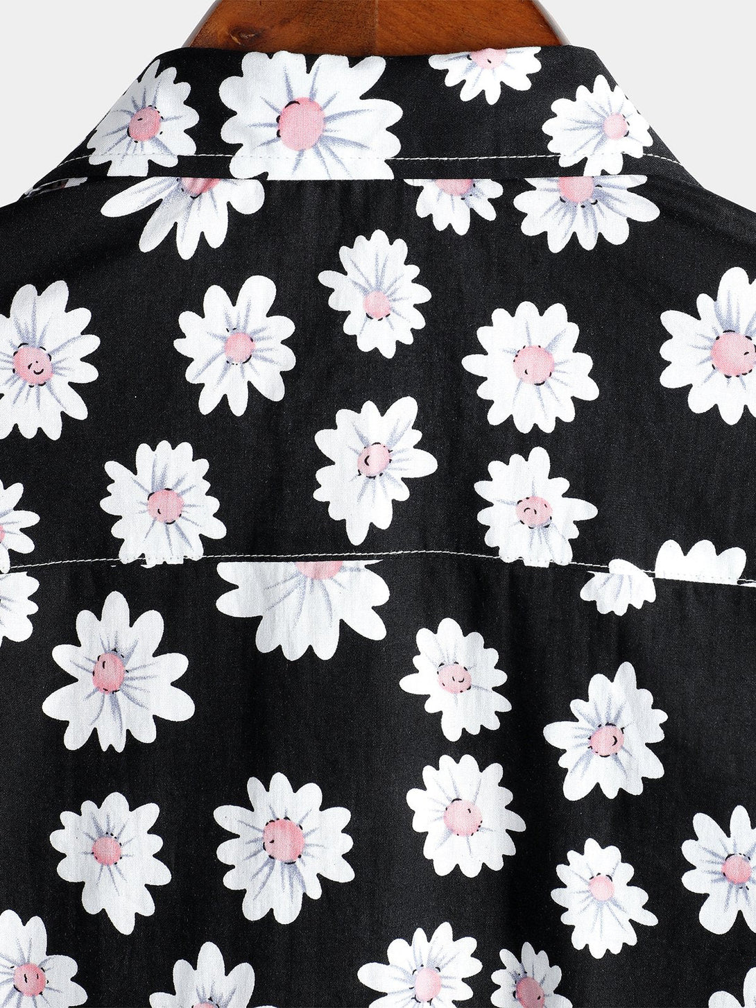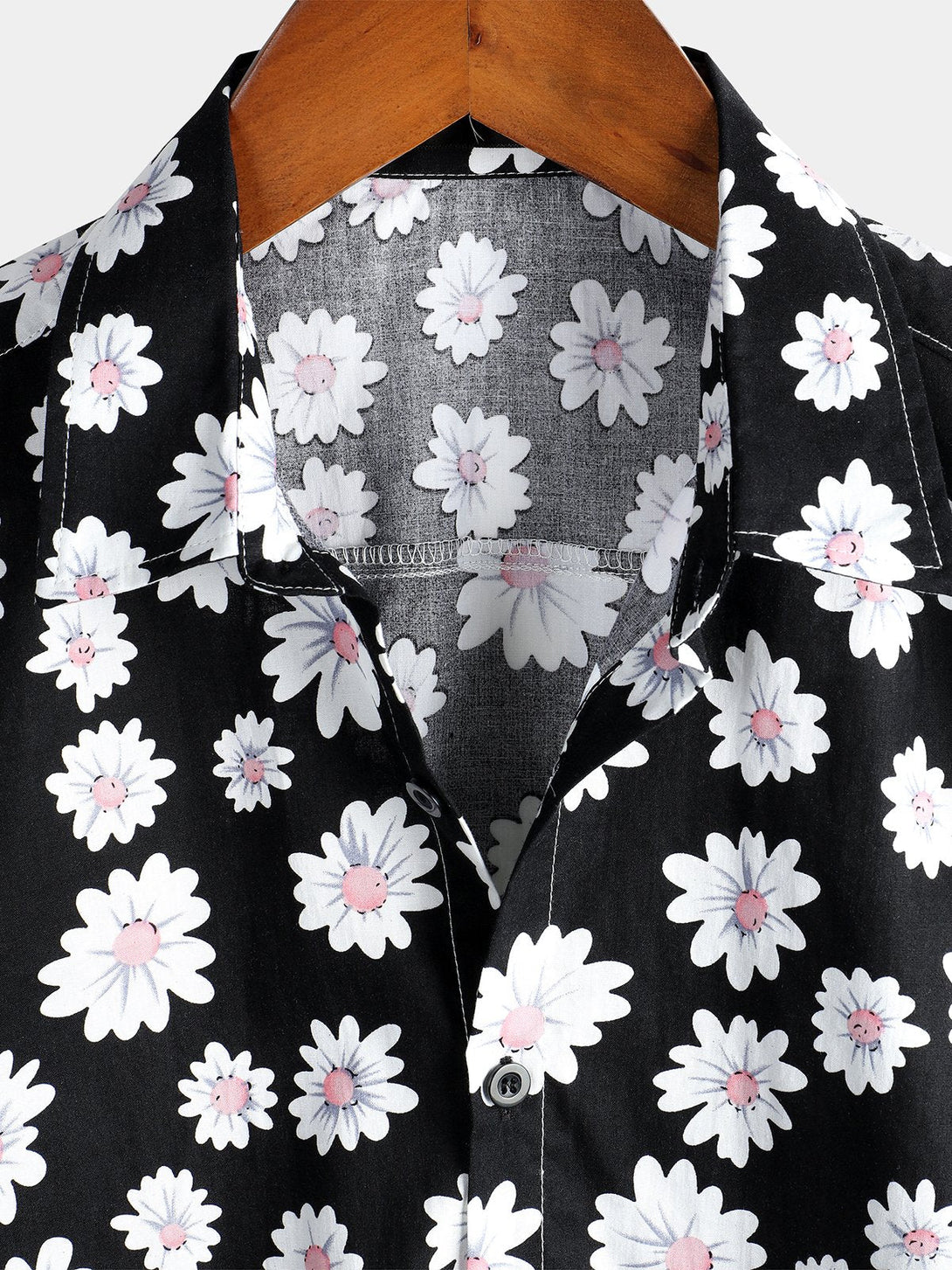 Black Men's Shirt Made Of Tropical Hawaiian Cotton With Floral And Daisy Print
