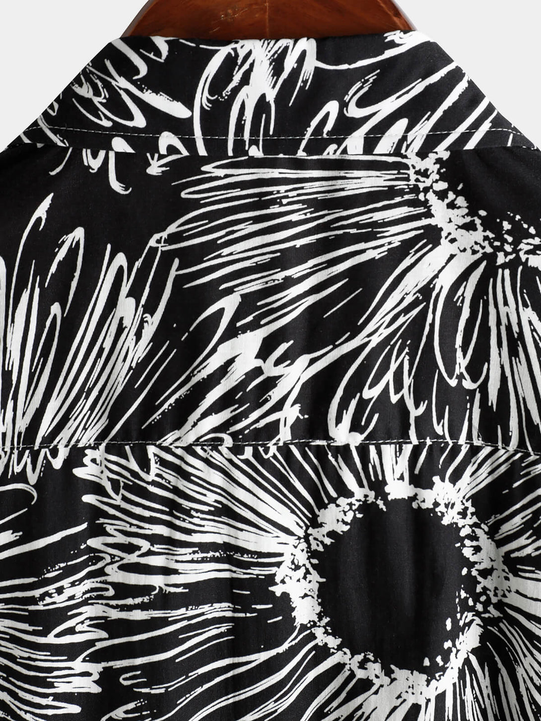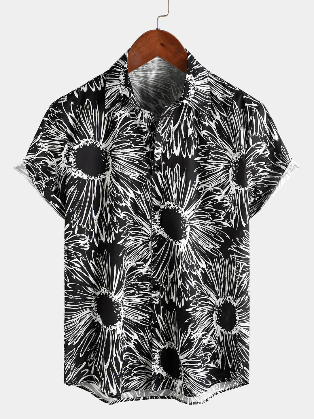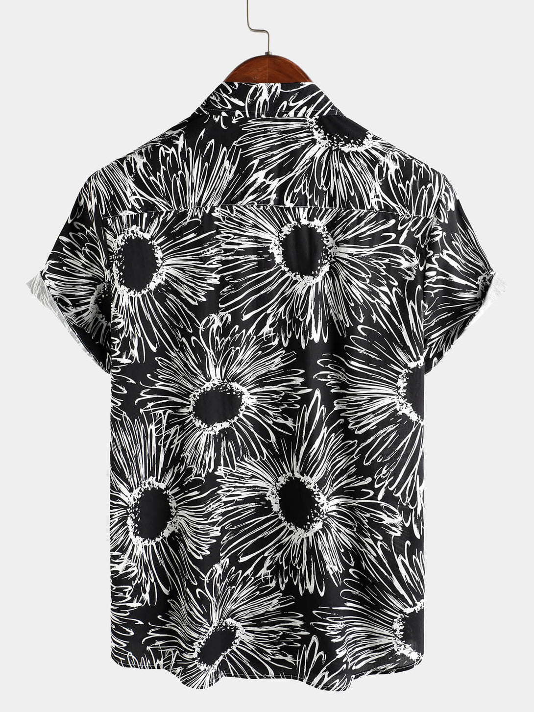 Men's Short-Sleeved Button-Down Shirt Made Of 100% Cotton With Sunflower Print And Black Floral Pattern