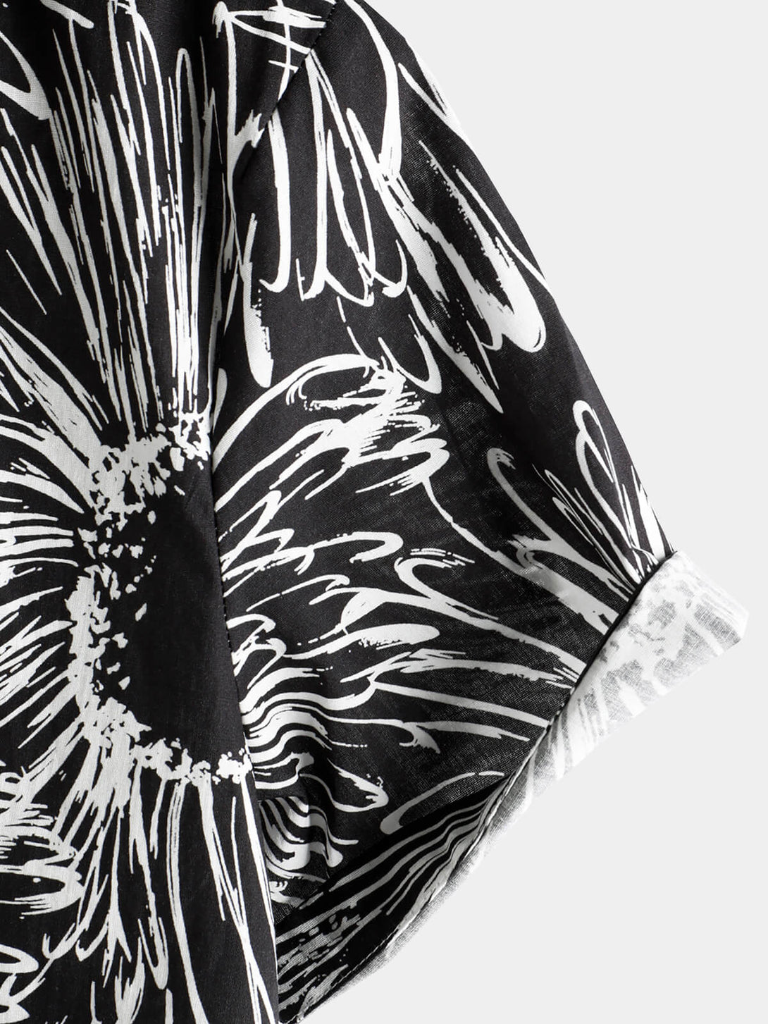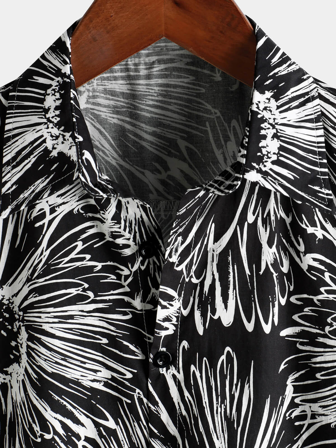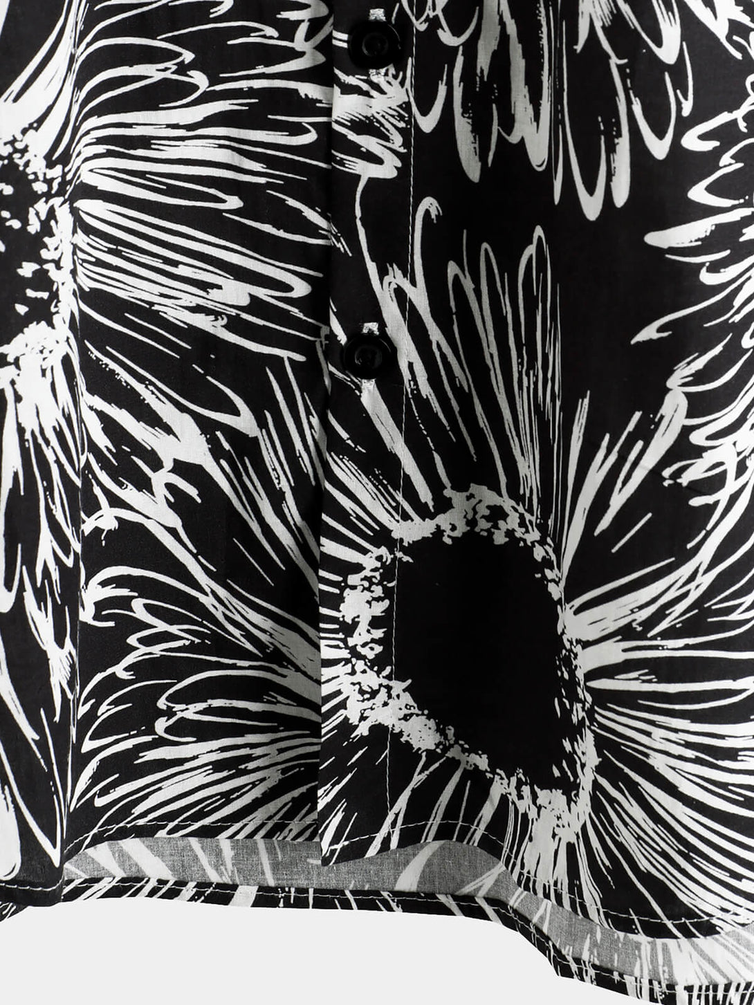 Men's Short-Sleeved Button-Down Shirt Made Of 100% Cotton With Sunflower Print And Black Floral Pattern