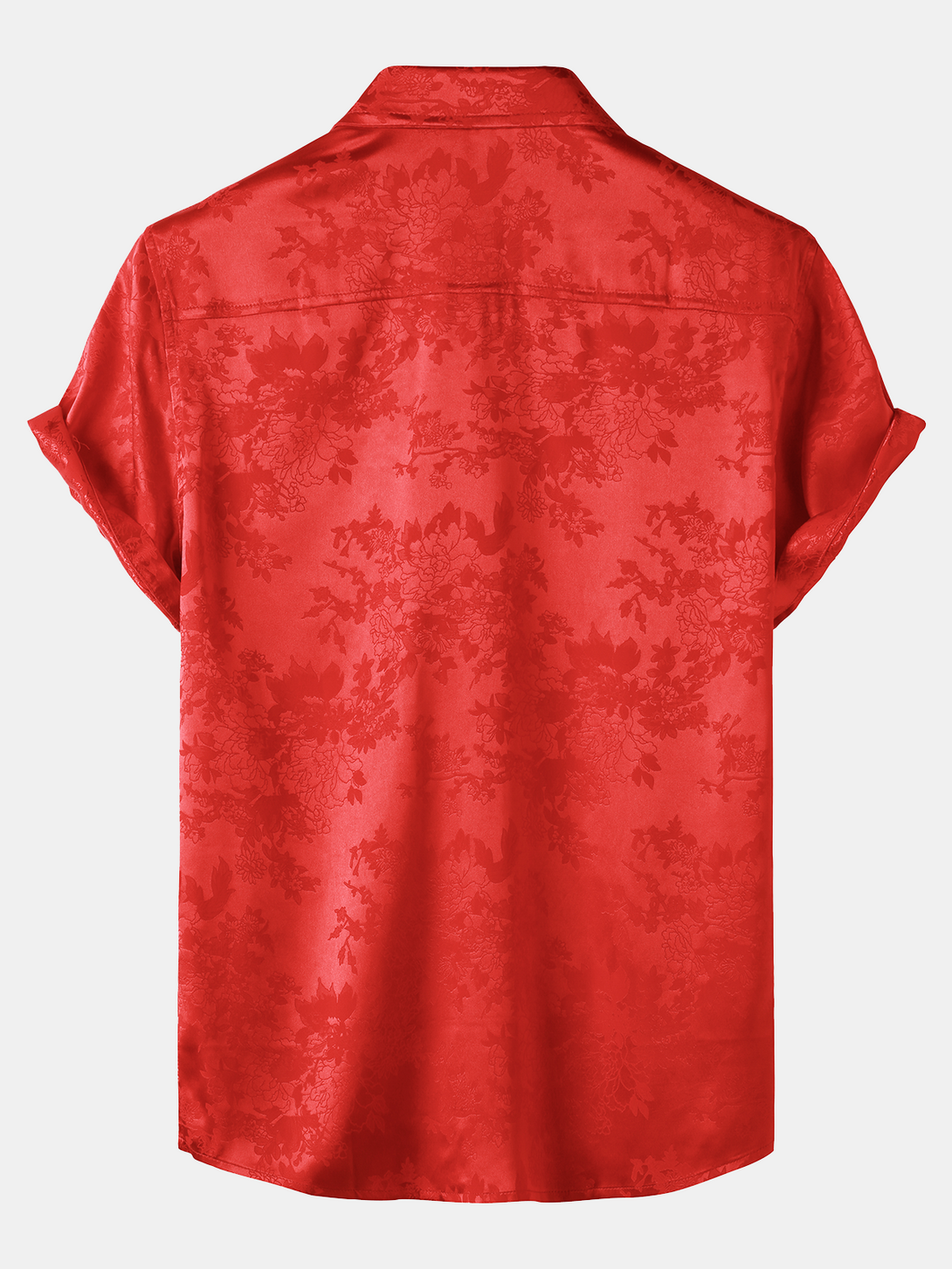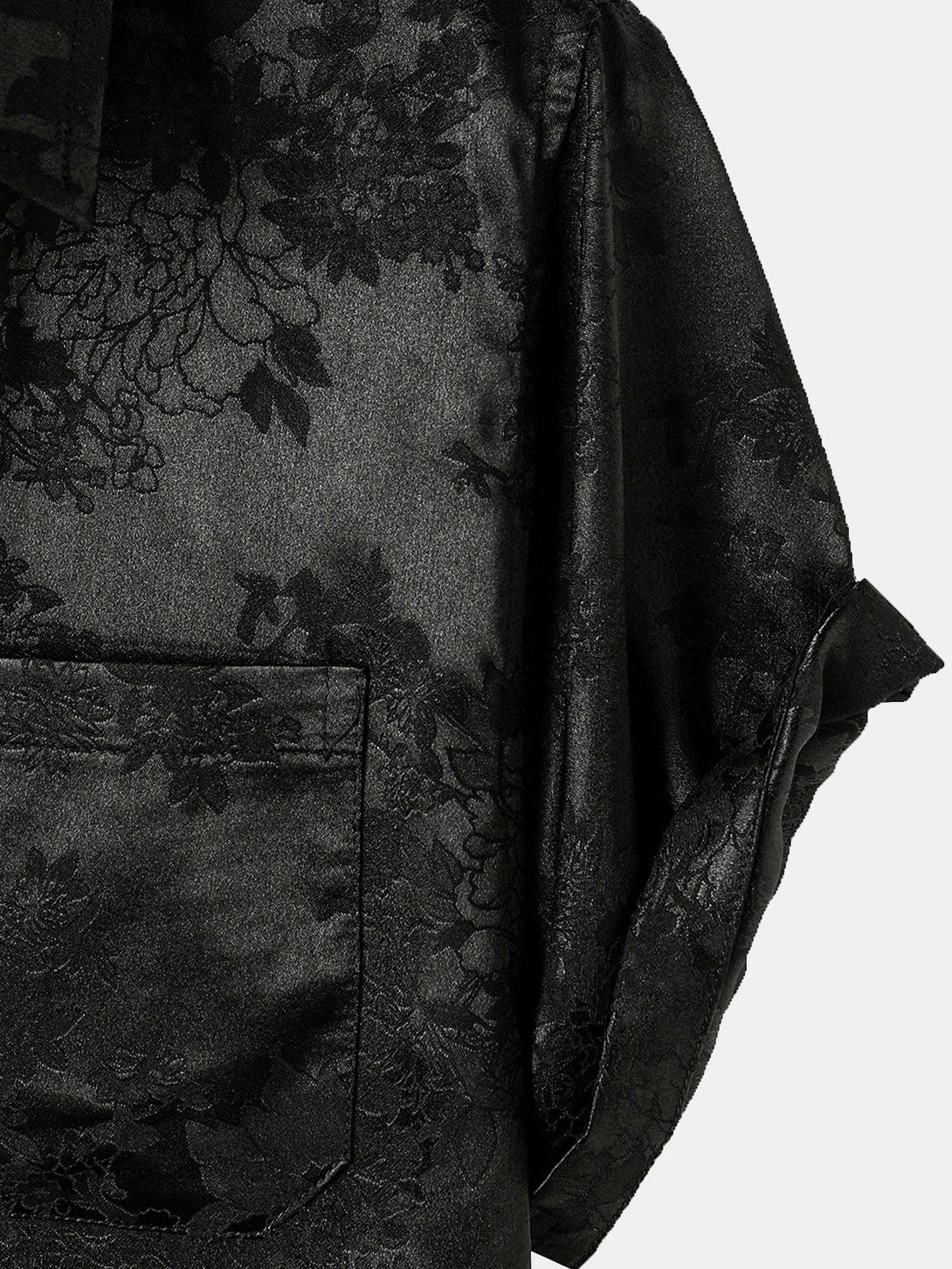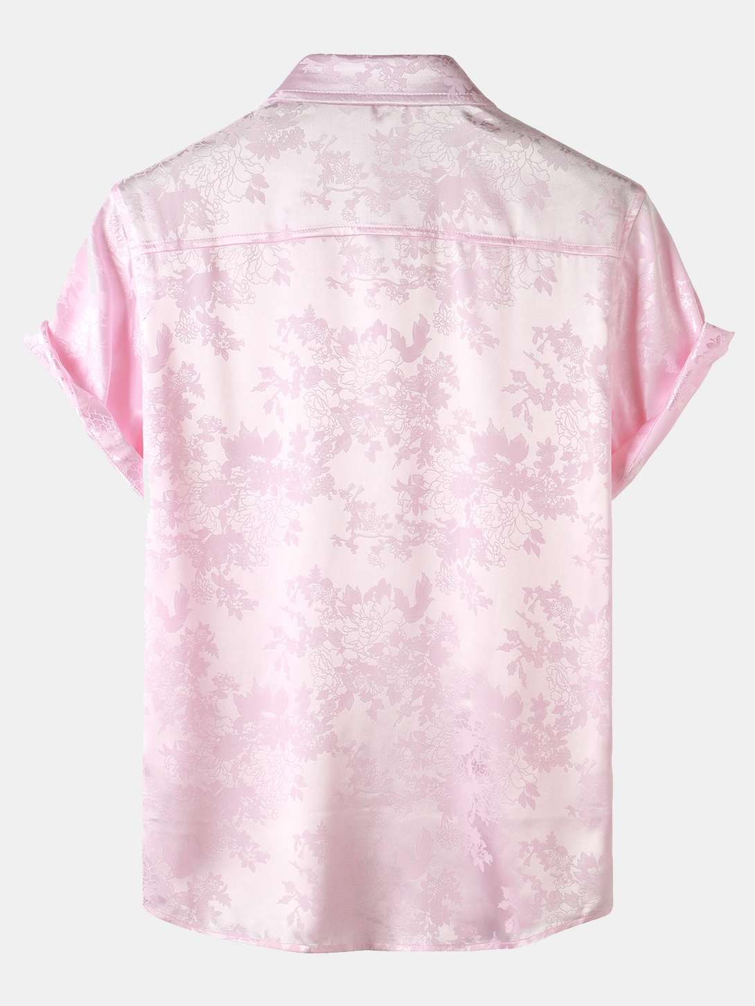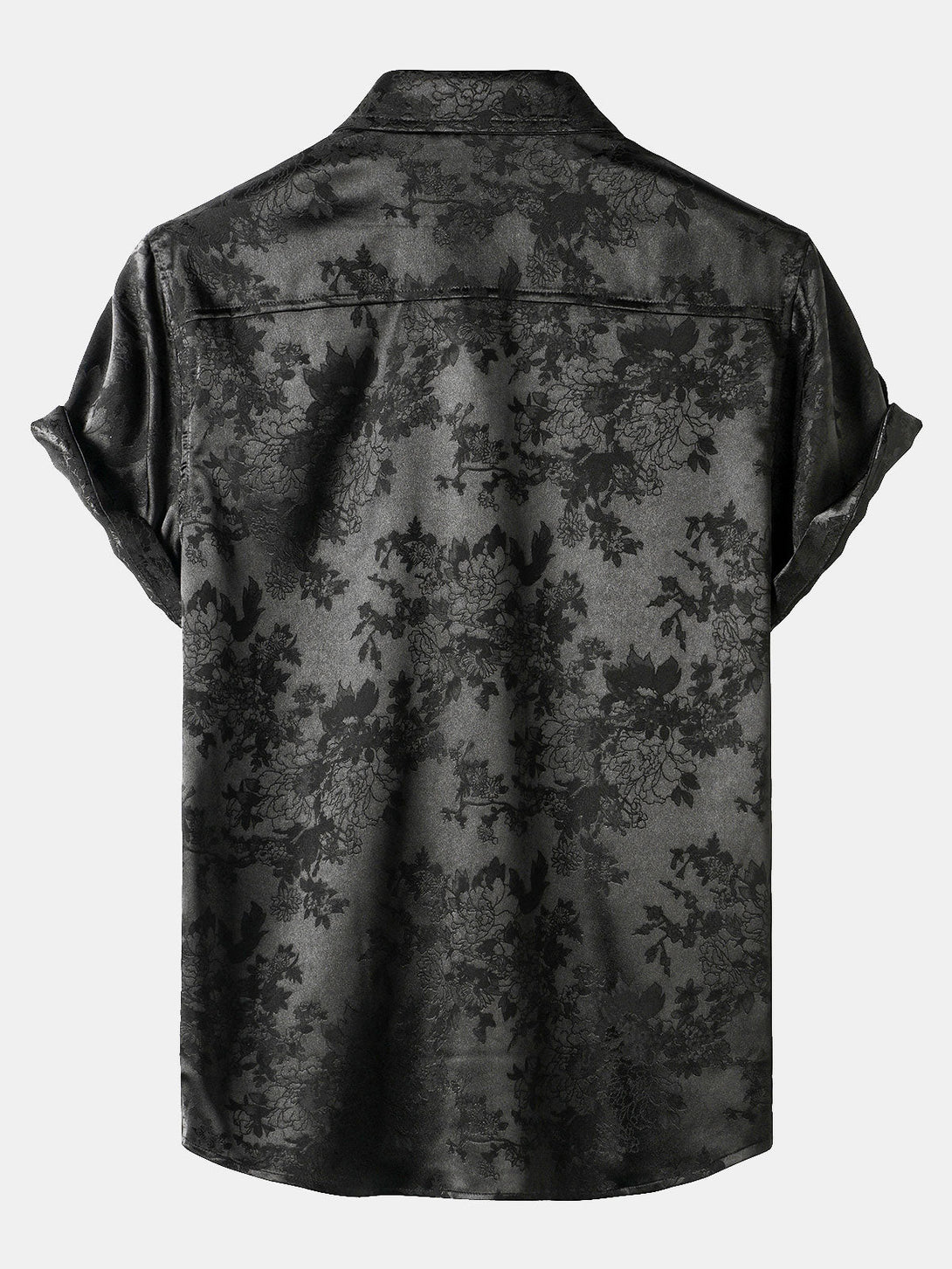 Casual Men's Jacquard Silk Satin Shirt With Floral Pockets And Short Sleeves