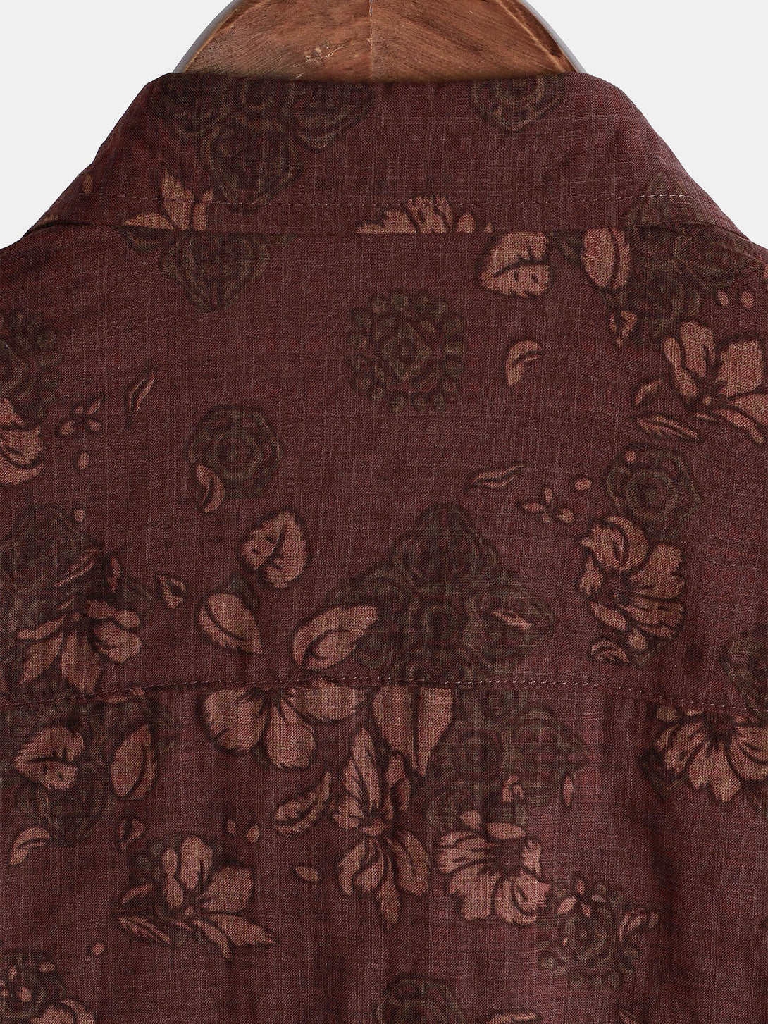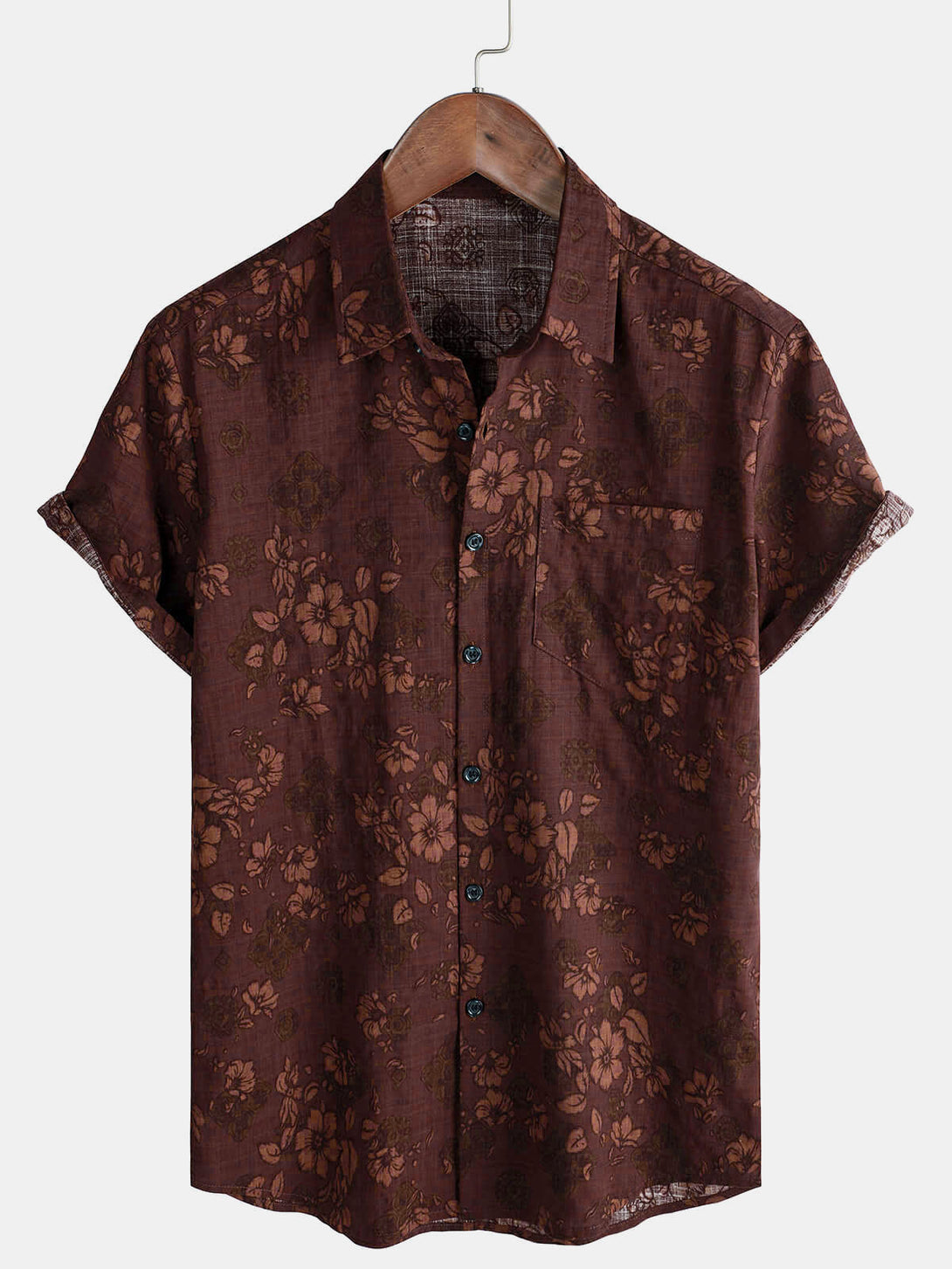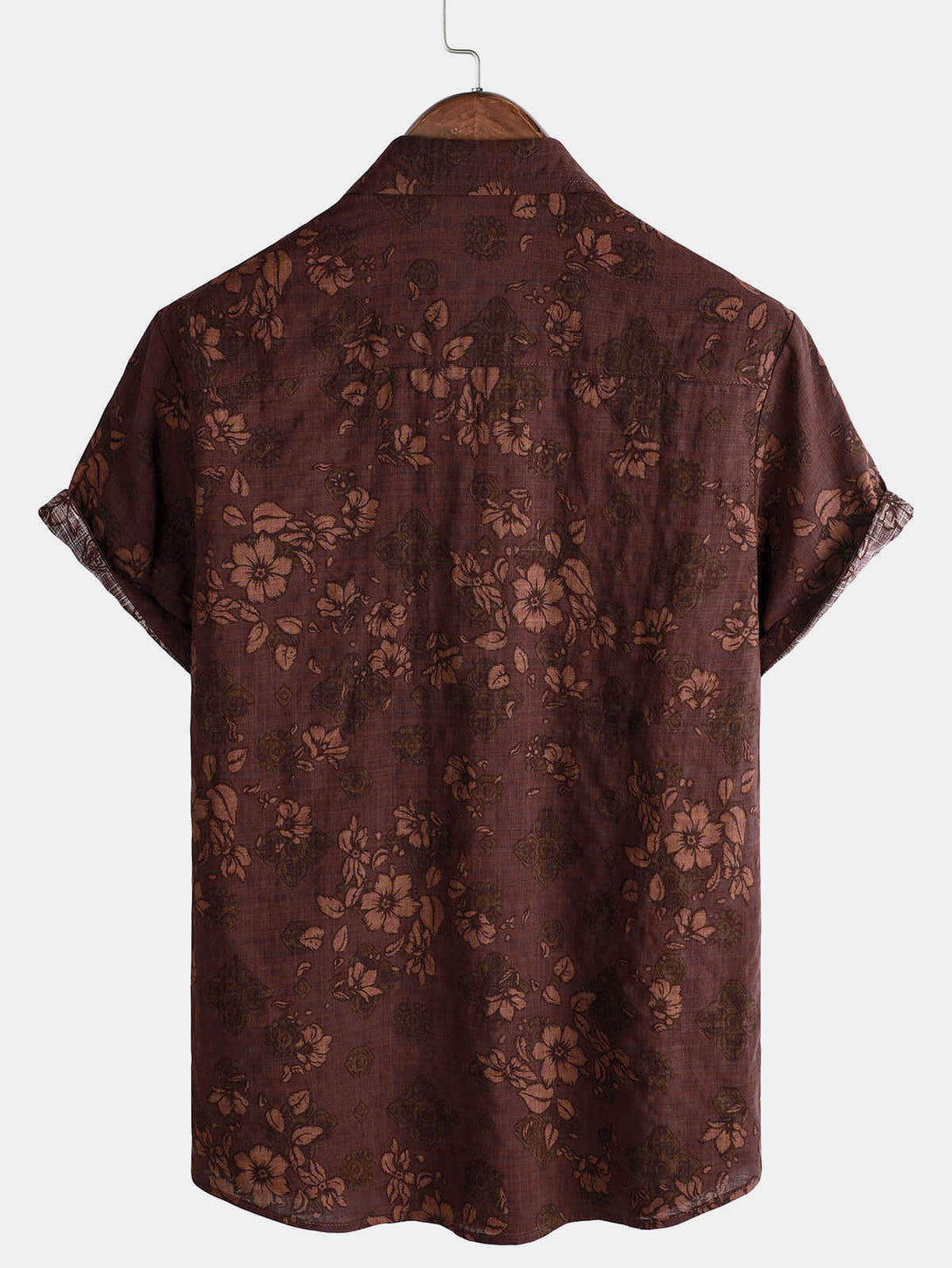 Men's Floral Print Holiday Casual Summer Red Short Sleeve Button Down Shirt