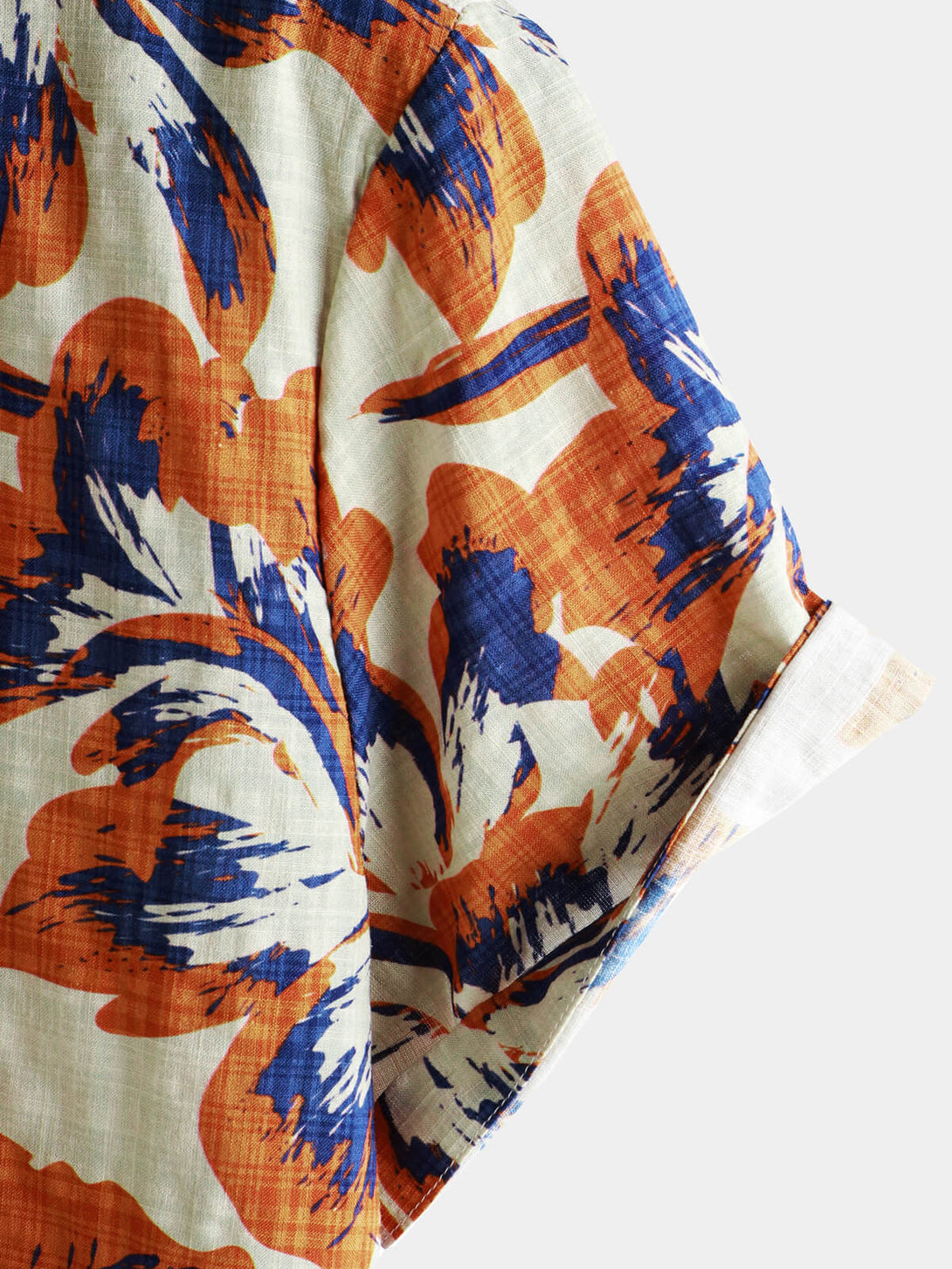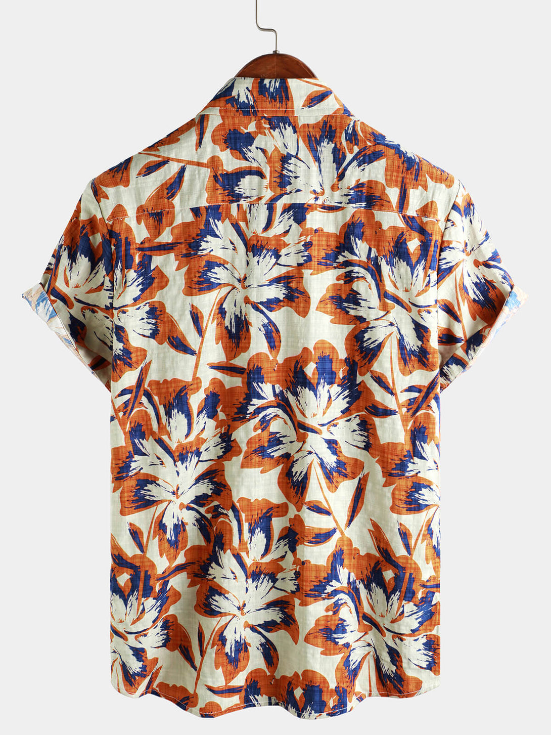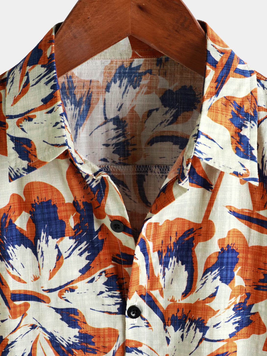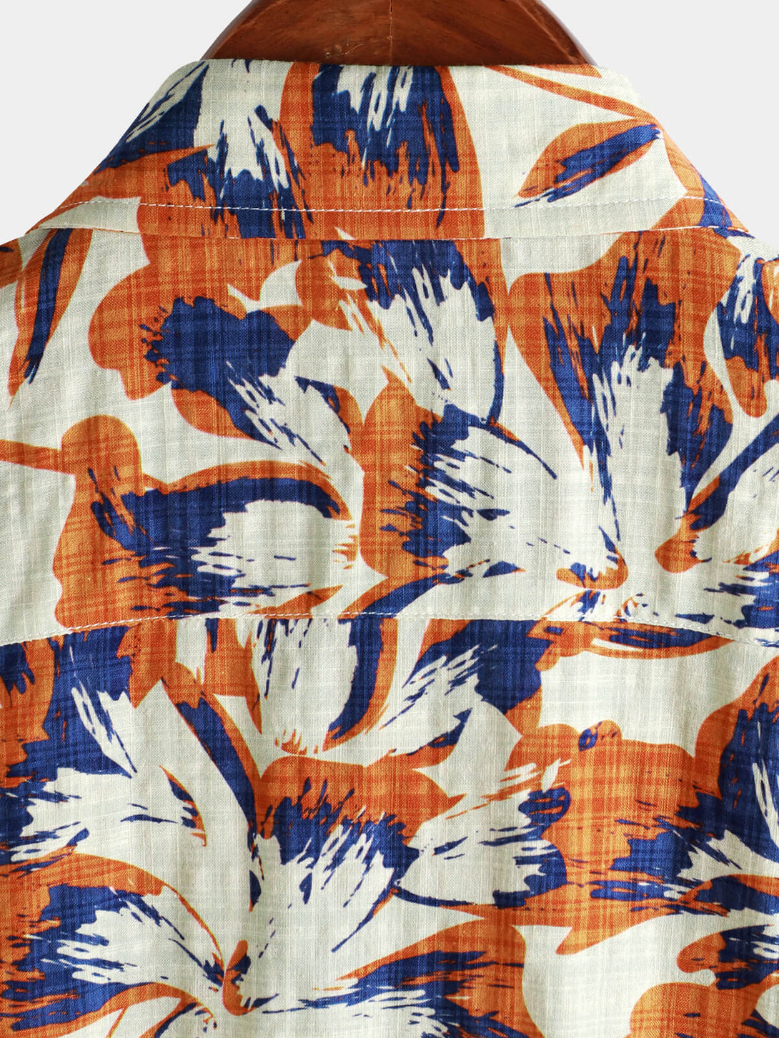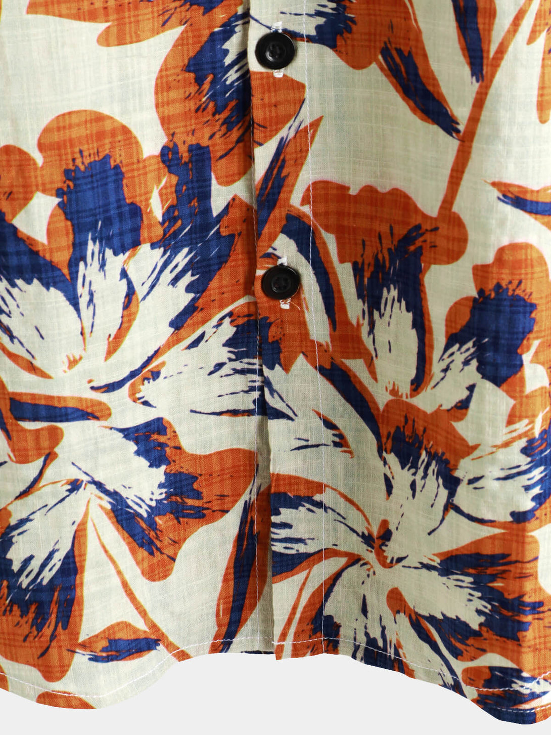 Men's Shirt With Retro Floral Pattern In Orange, Short Sleeves And Buttons