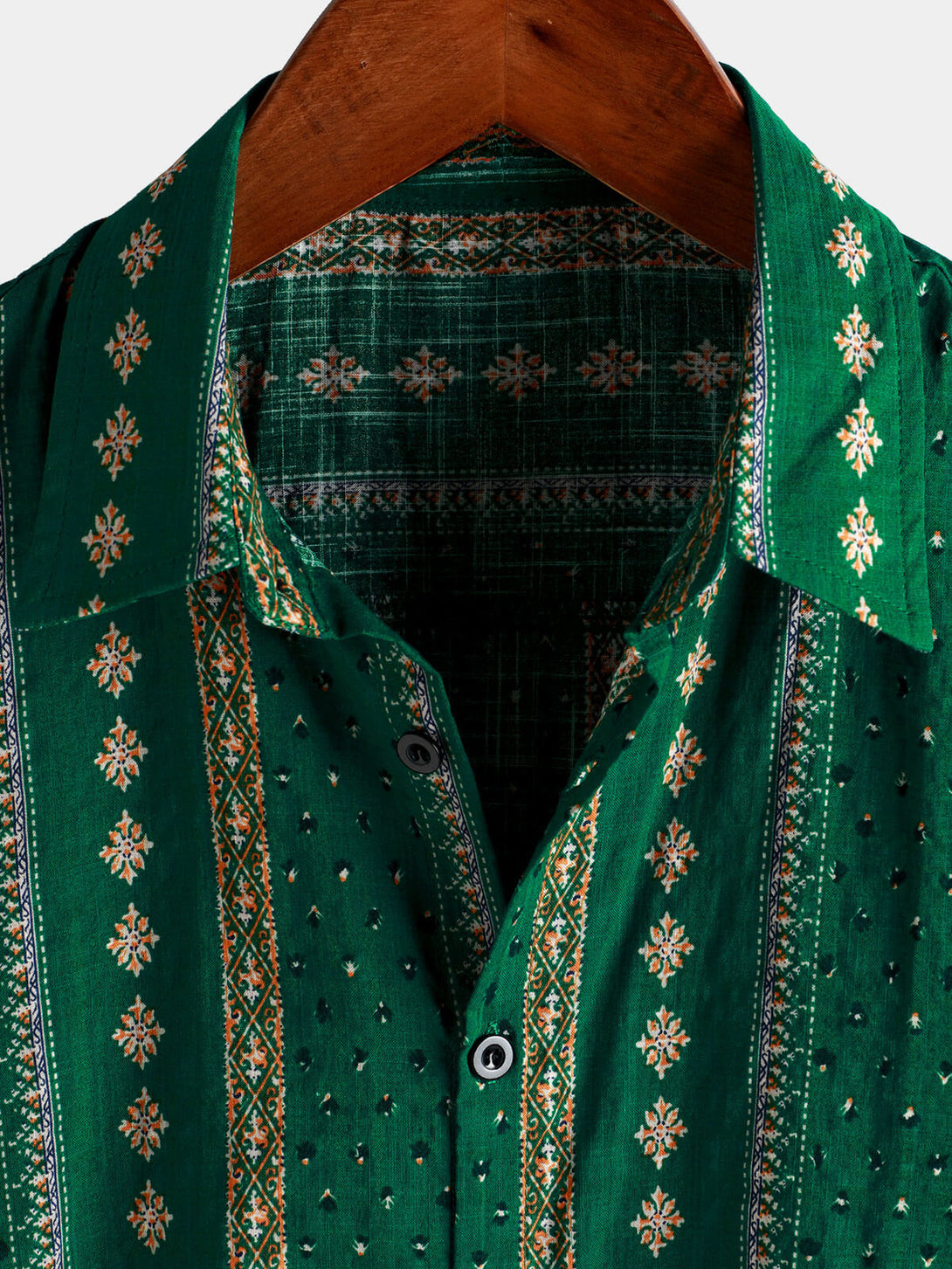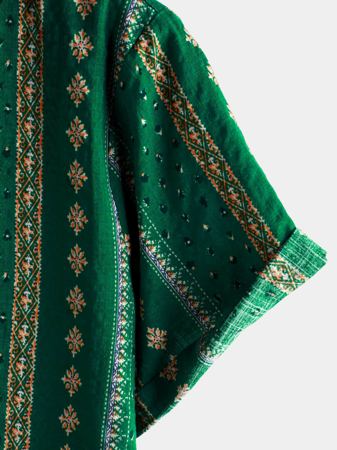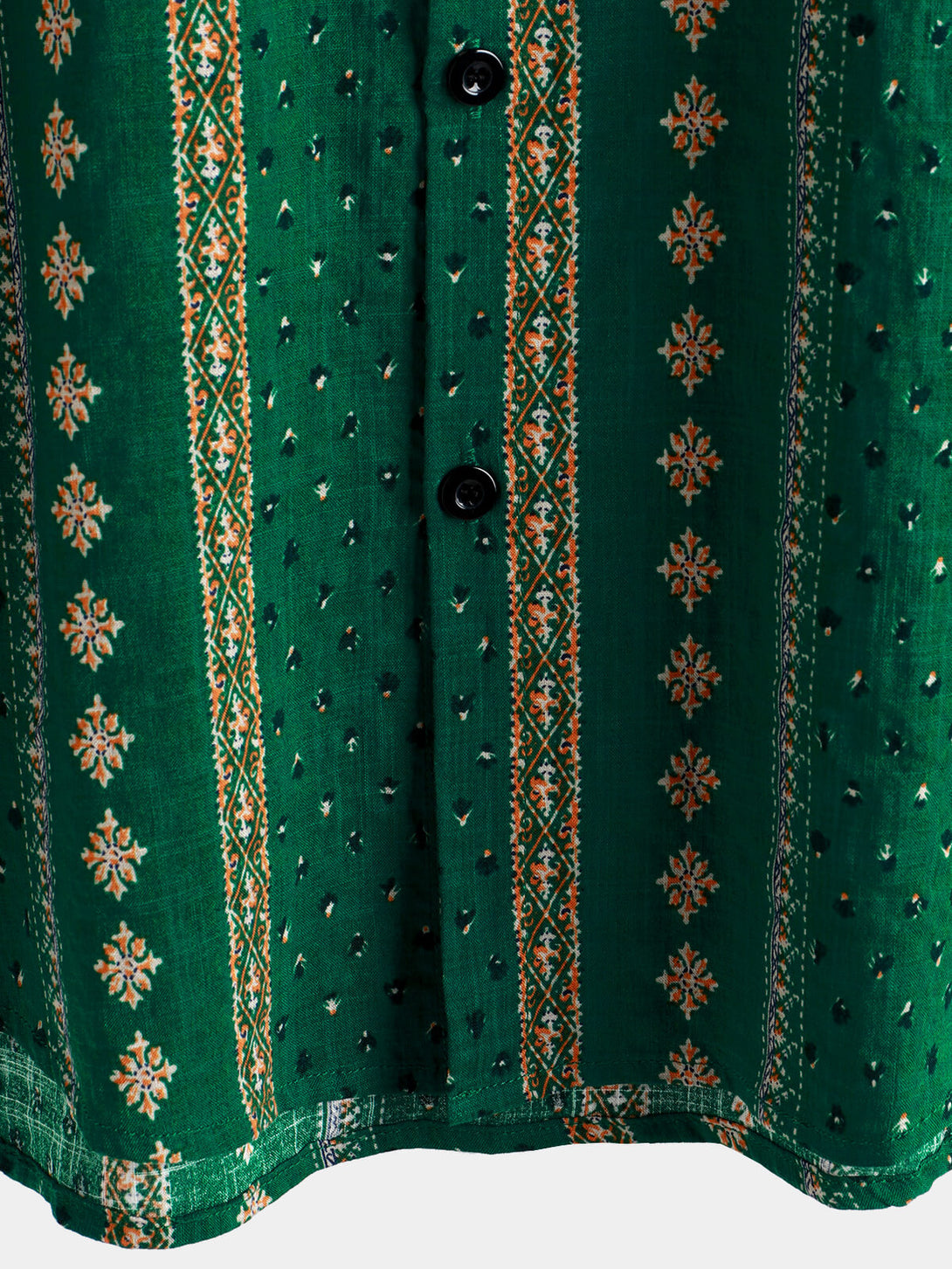 Men's Retro Shirt With Green Stripes And Buttons In 70S Style, Short Sleeves