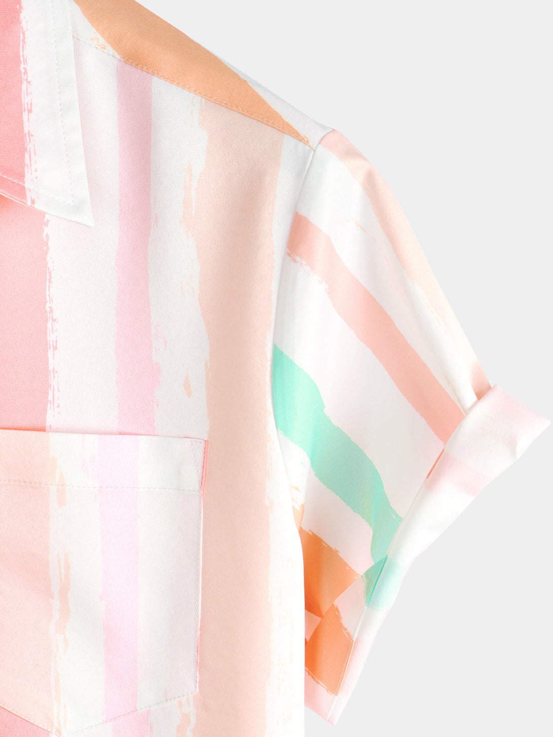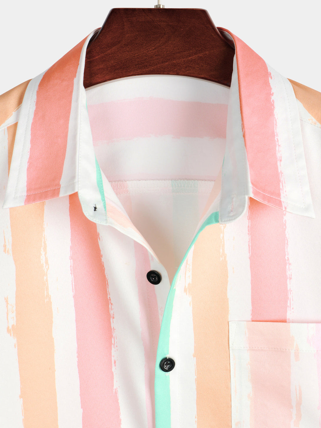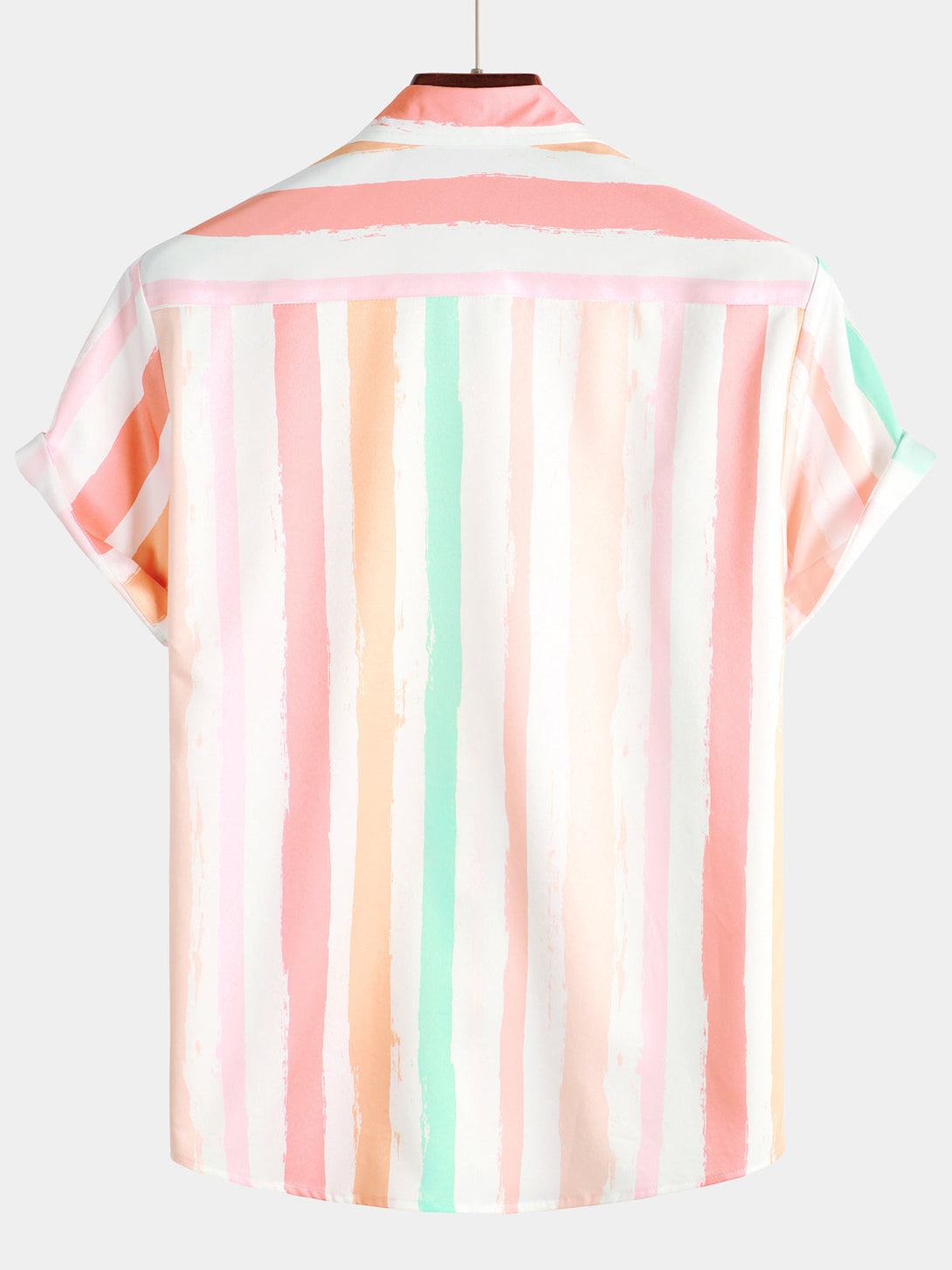 Men's Summer Pink And White Vertical Striped Pocket Button Short Sleeve Rainbow Shirt