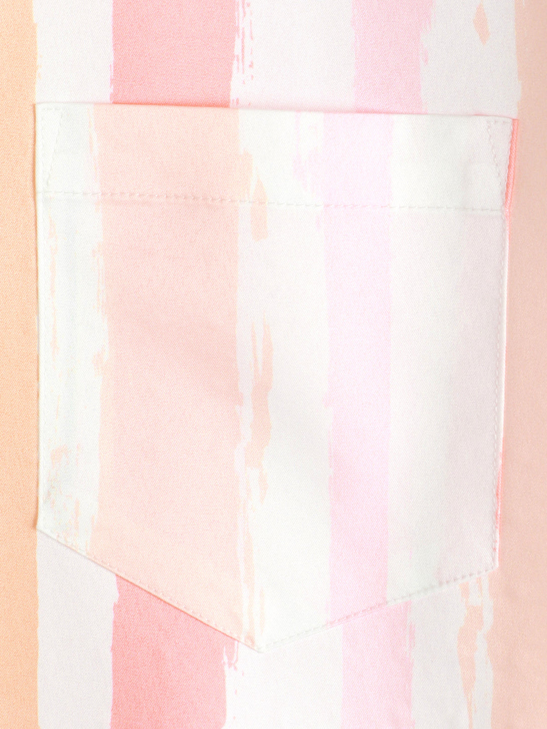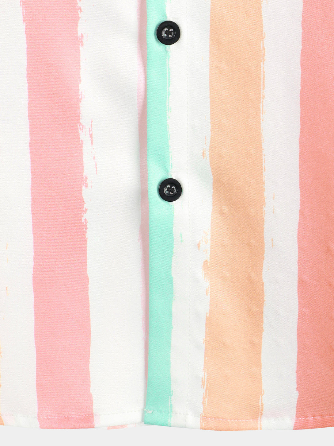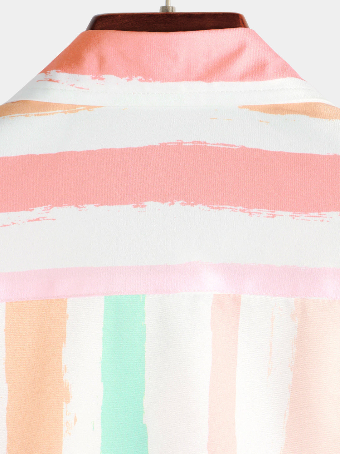 Men's Summer Pink And White Vertical Striped Pocket Button Short Sleeve Rainbow Shirt