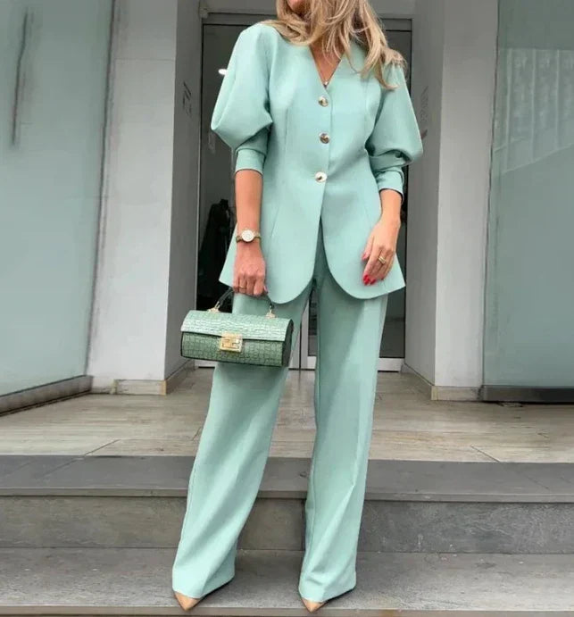 Relaxed Fit: The Angela set features a loose suit coat and matching trousers for comfort and style. The relaxed fit allows for freedom of movement and a polished look.