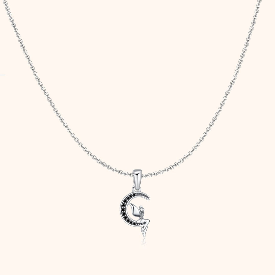 Crescent moon and fairy necklace with small decorative black zircons around the moon, made of sterling silver (S925).