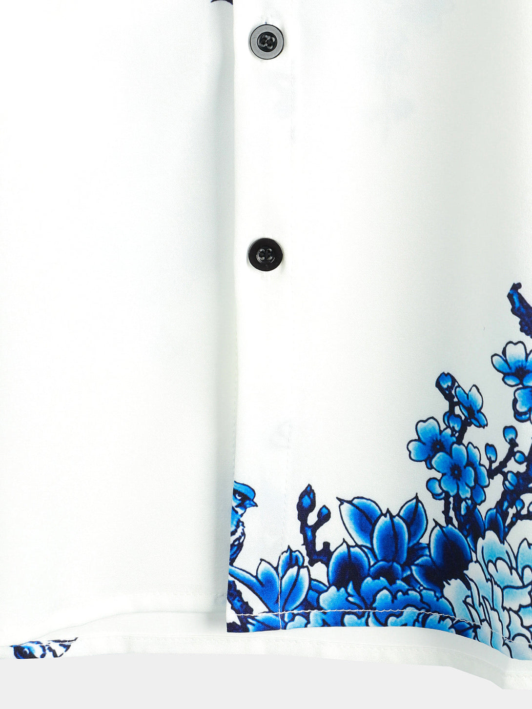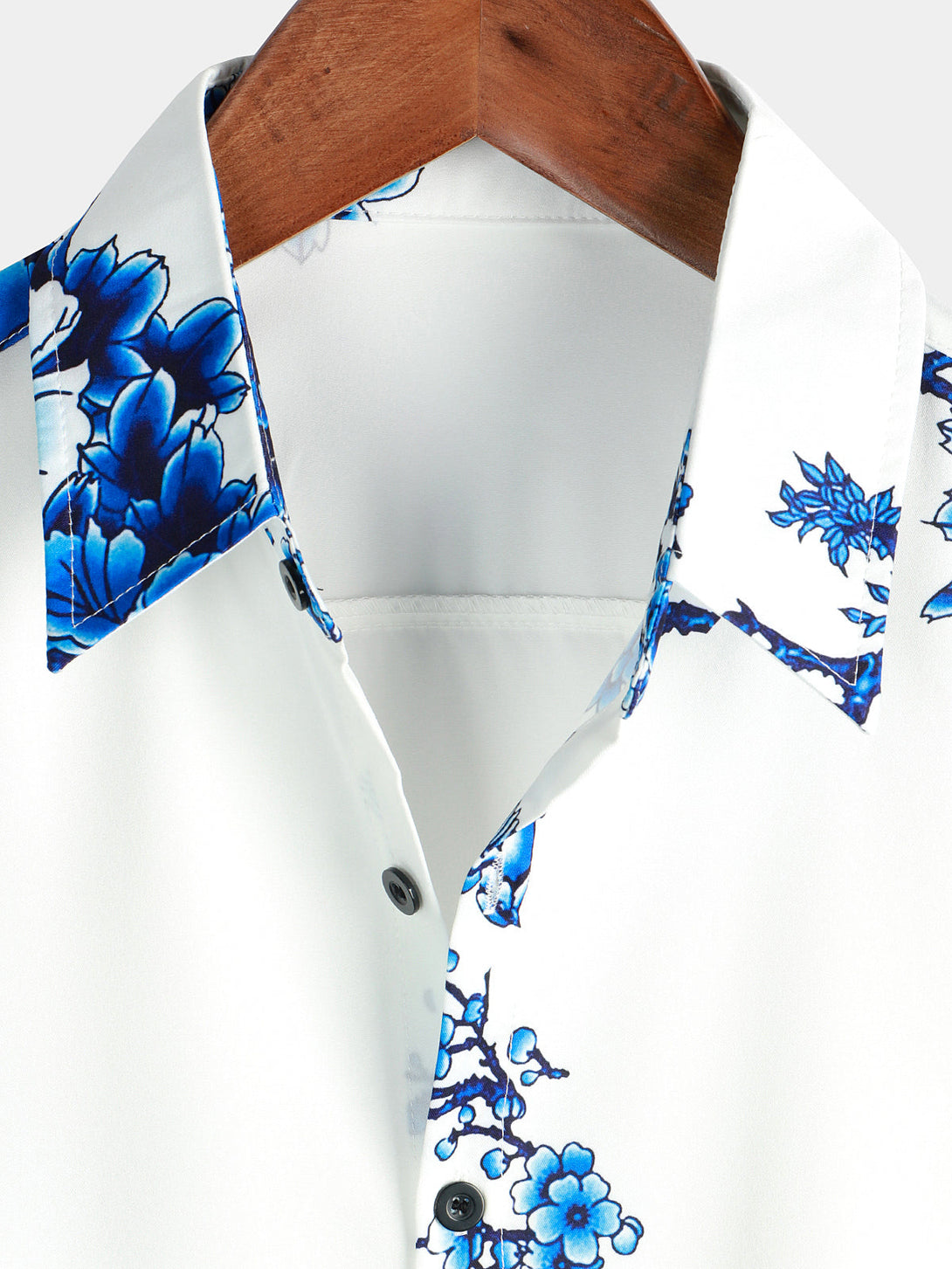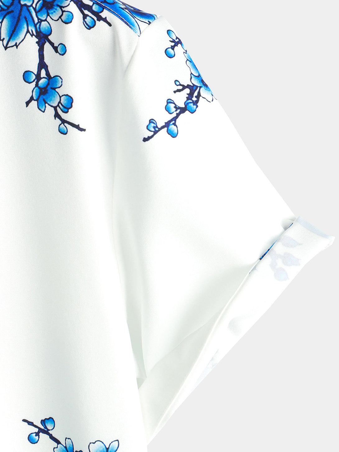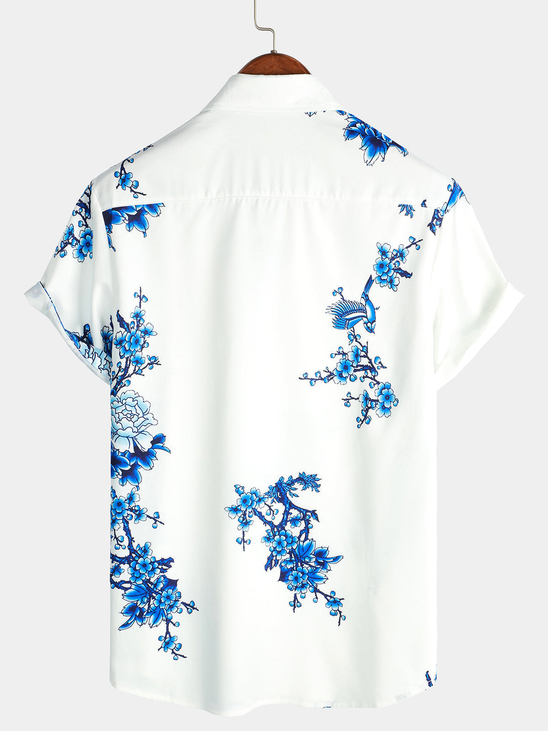 Blue Casual Short-Sleeved Men's Shirt With Floral Pattern And Buttons