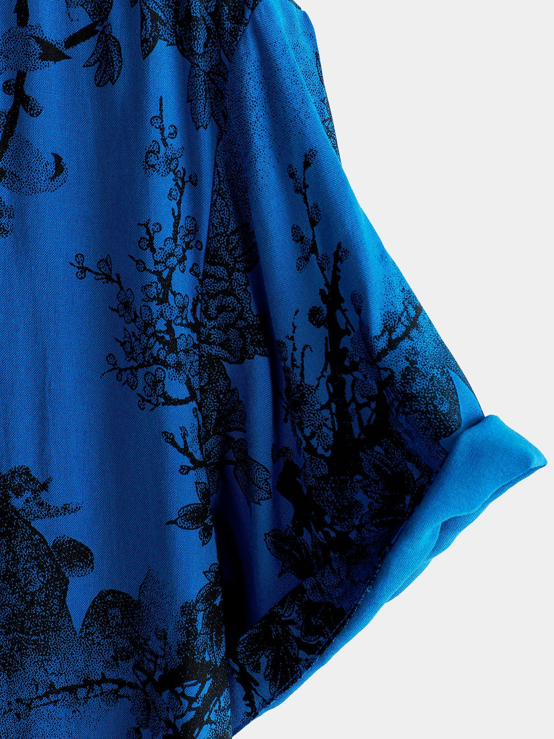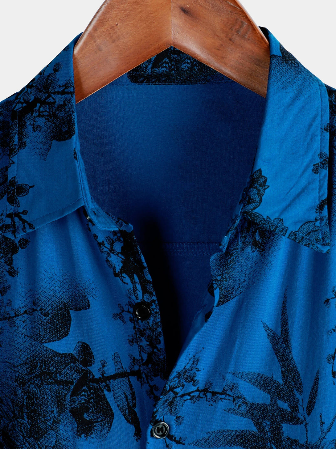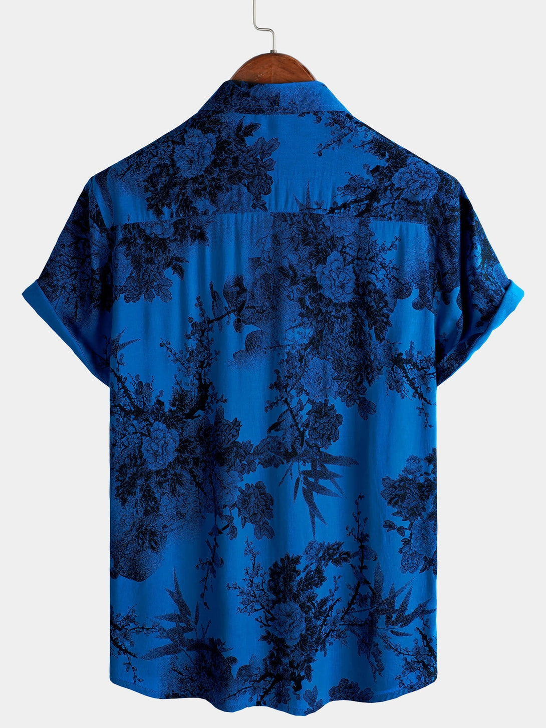 Men's Blue Vintage Floral Print Summer Vacation Hawaiian Breathable Button-Down Short-Sleeved Shirt