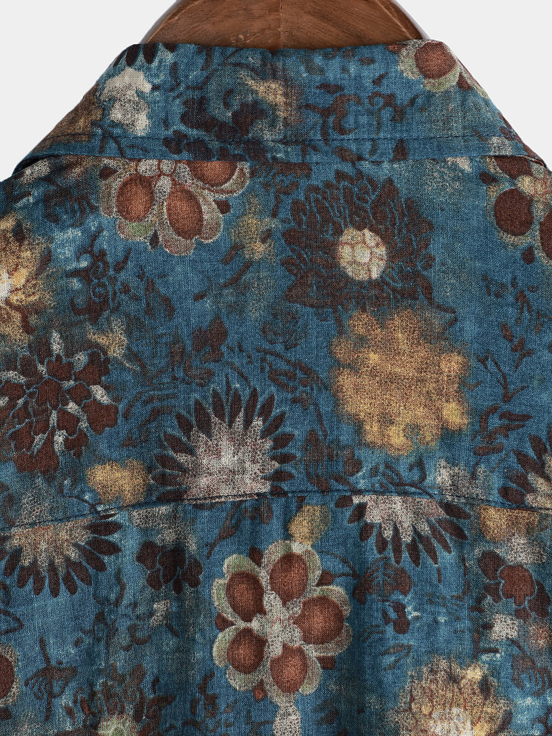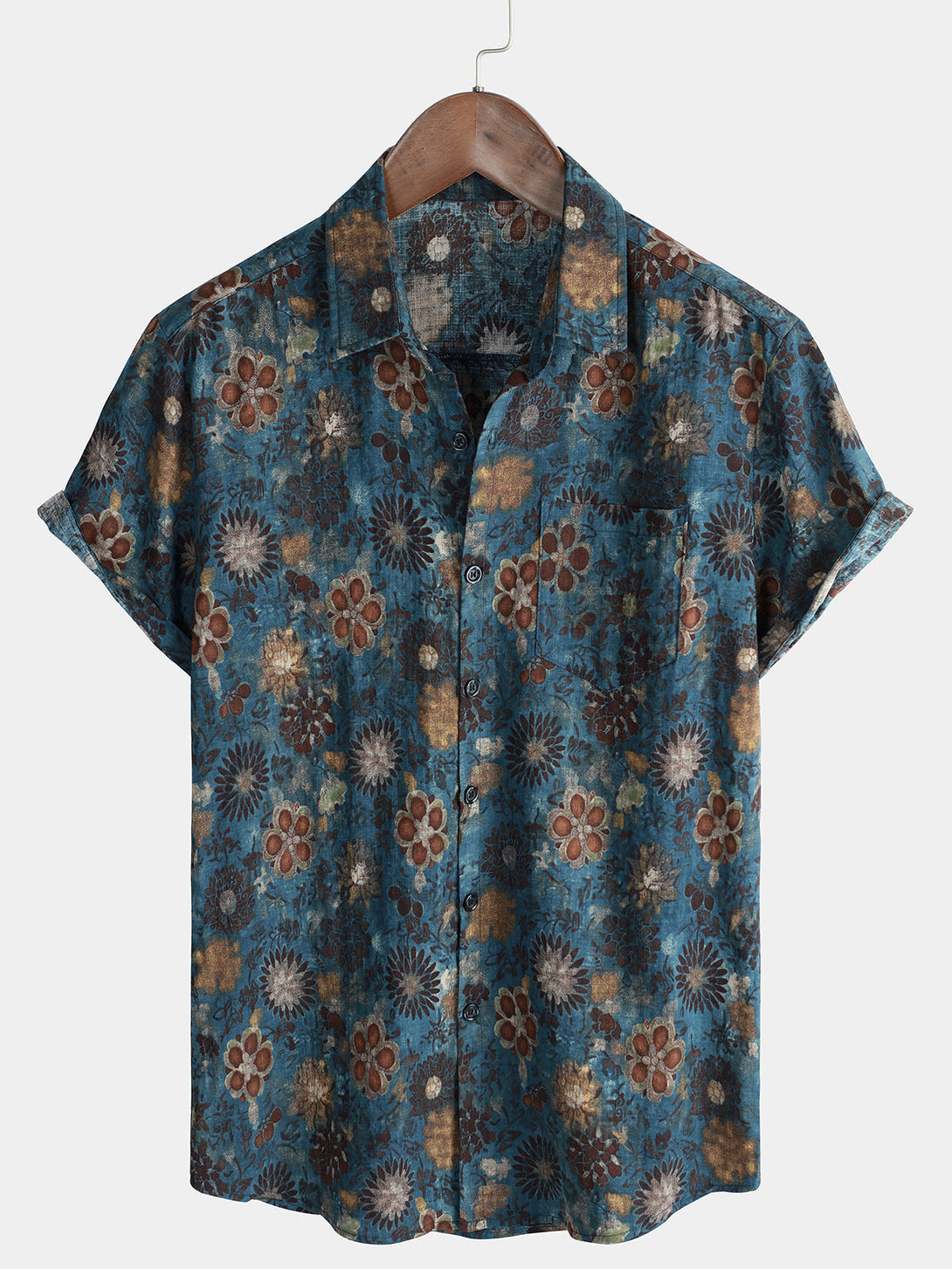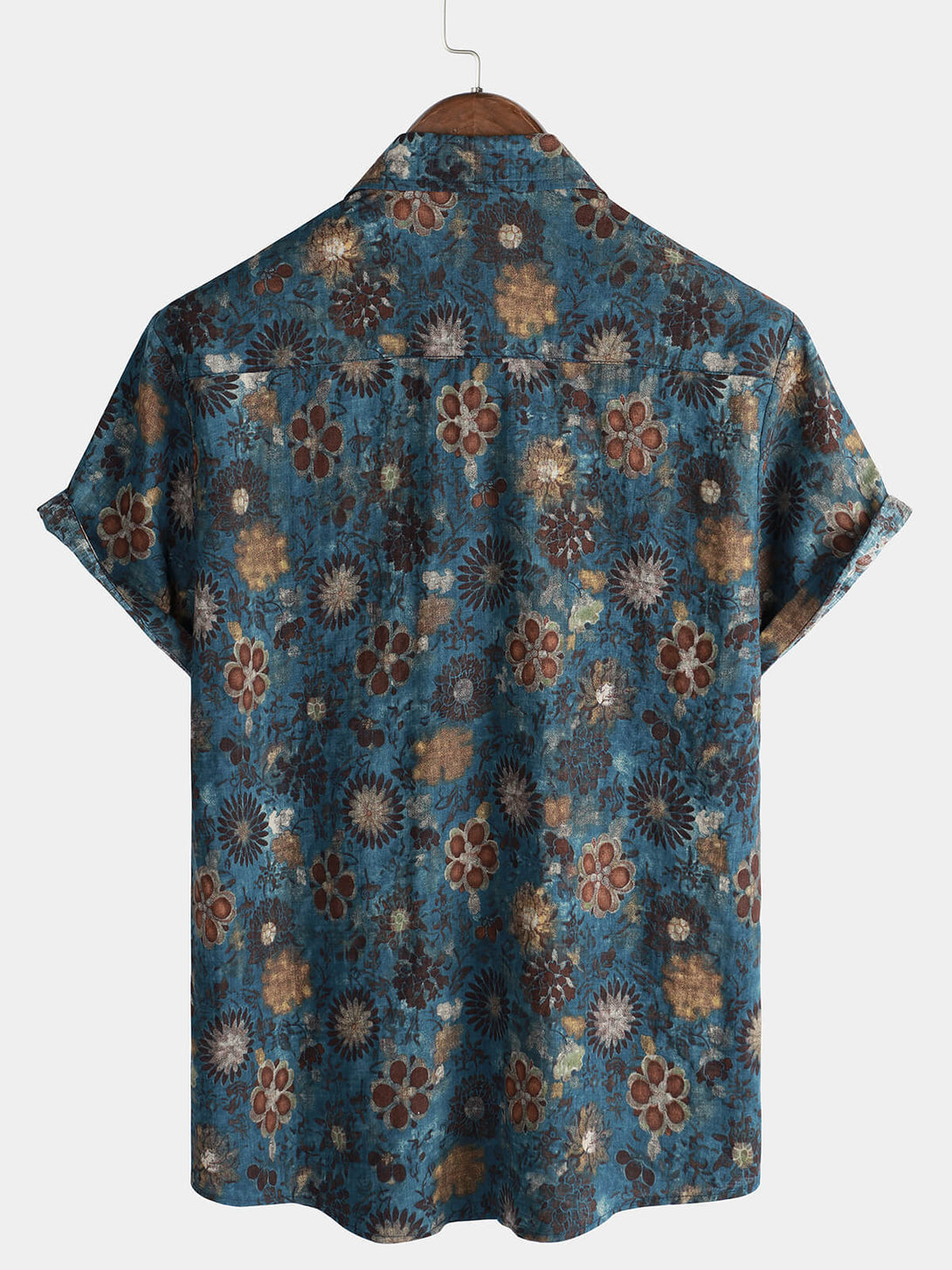 Casual Short-Sleeved Men's Shirt With Vintage Floral Print In Blue