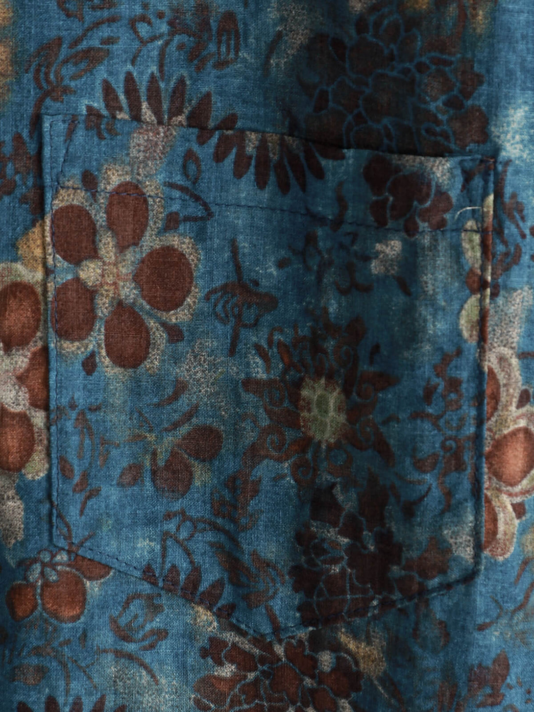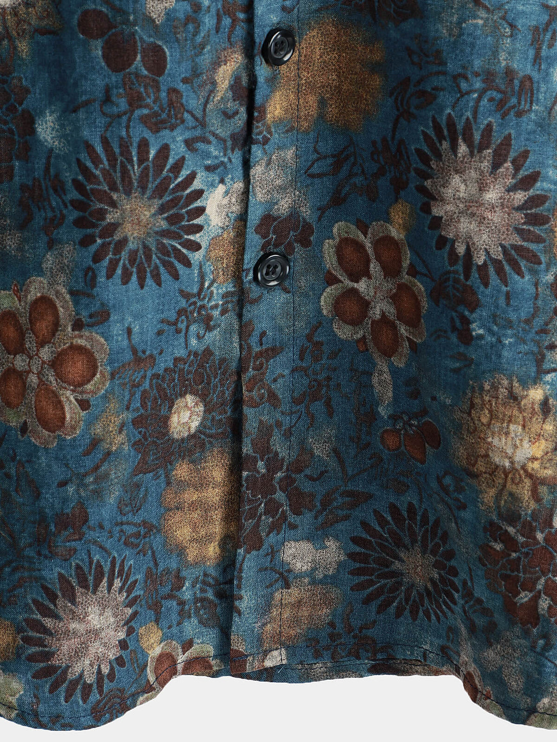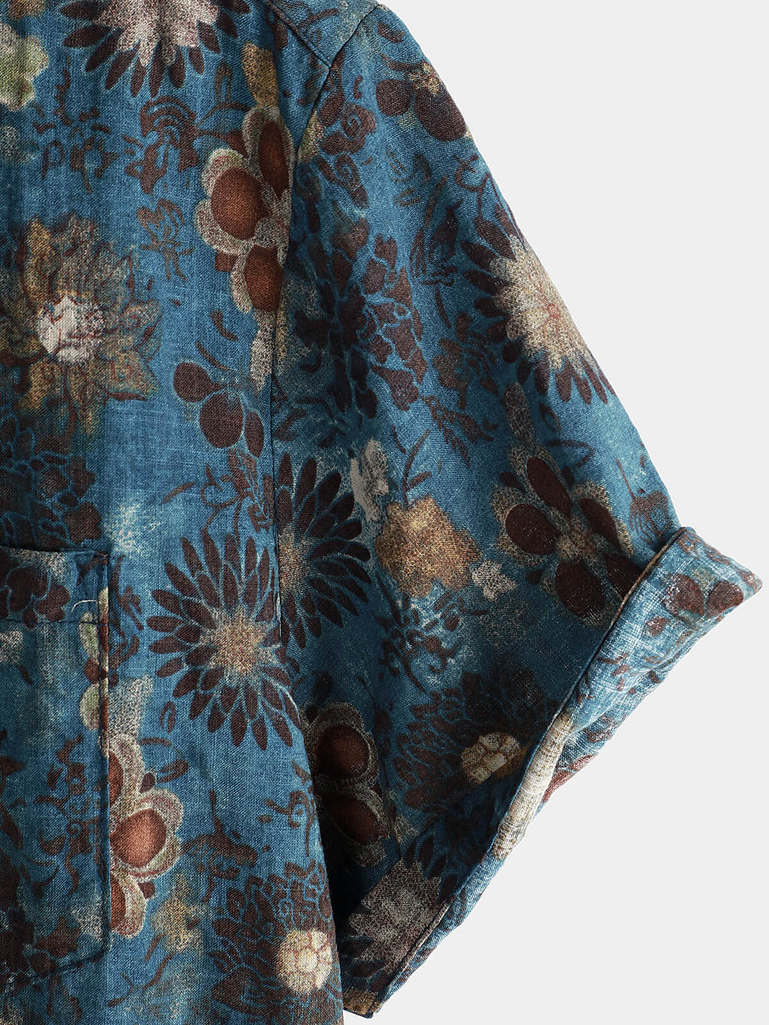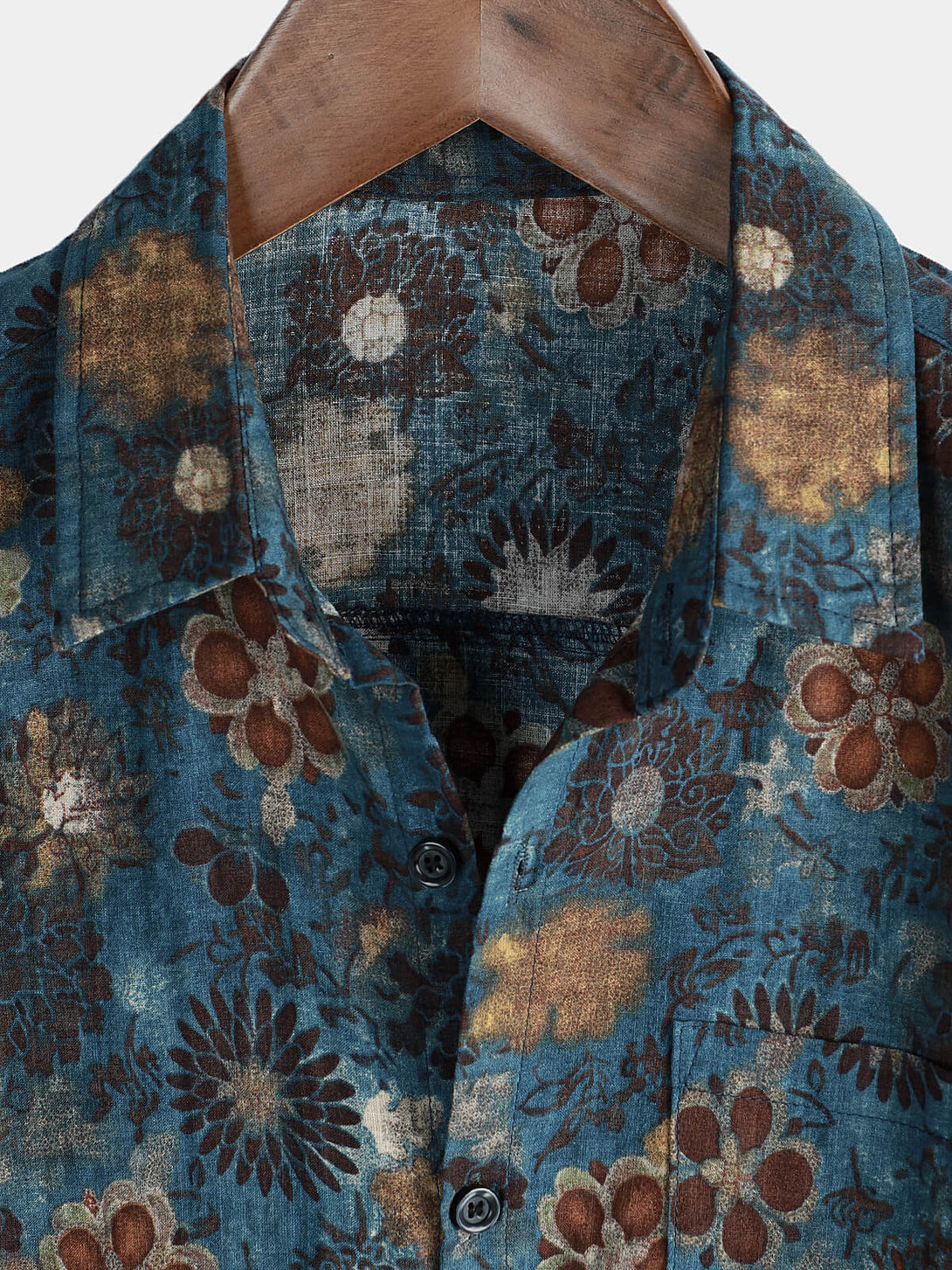 Casual Short-Sleeved Men's Shirt With Vintage Floral Print In Blue