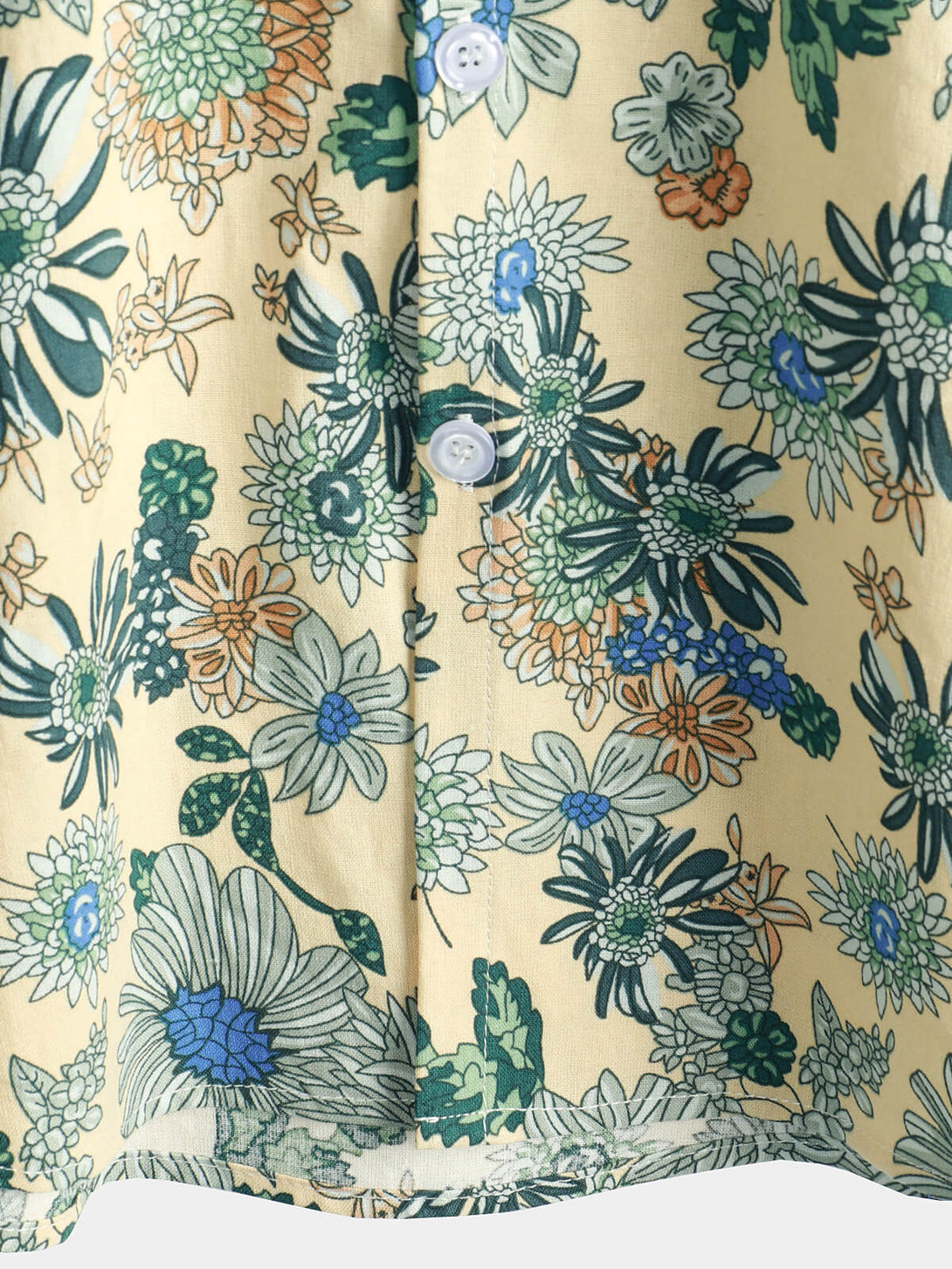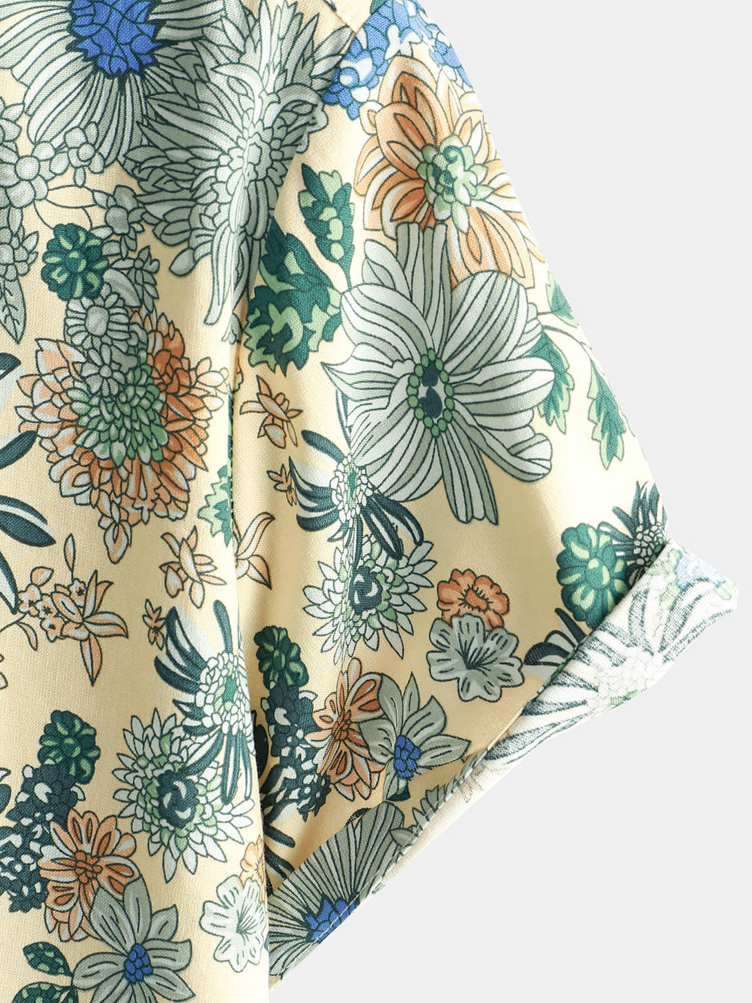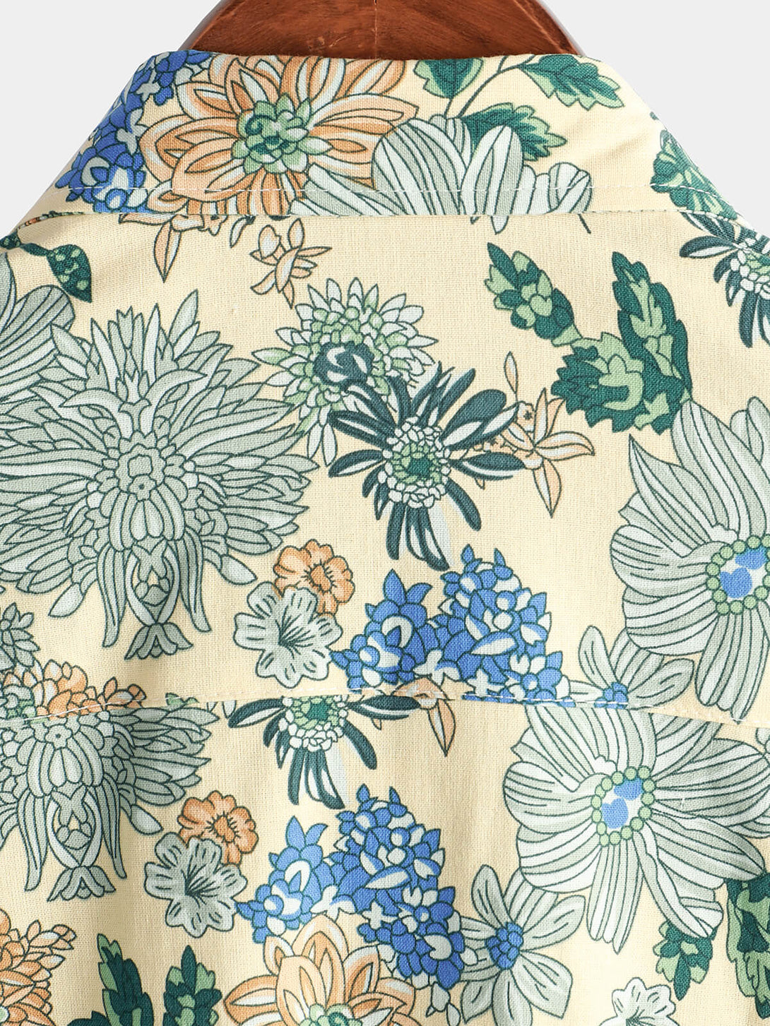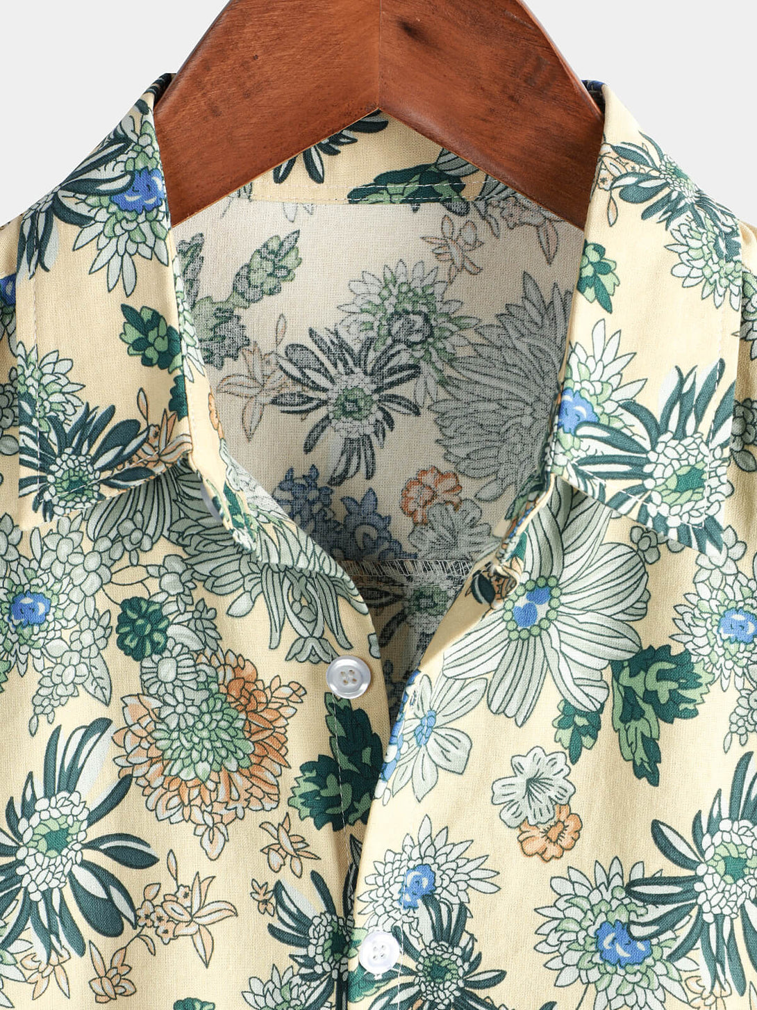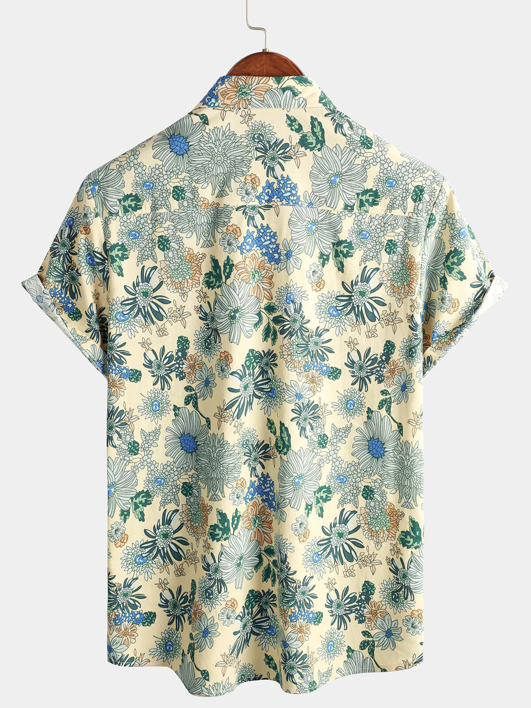 Men's Vintage Green Floral Print Cotton Shirt Retro Casual Button Down Cool Beach Short Sleeve Shirt