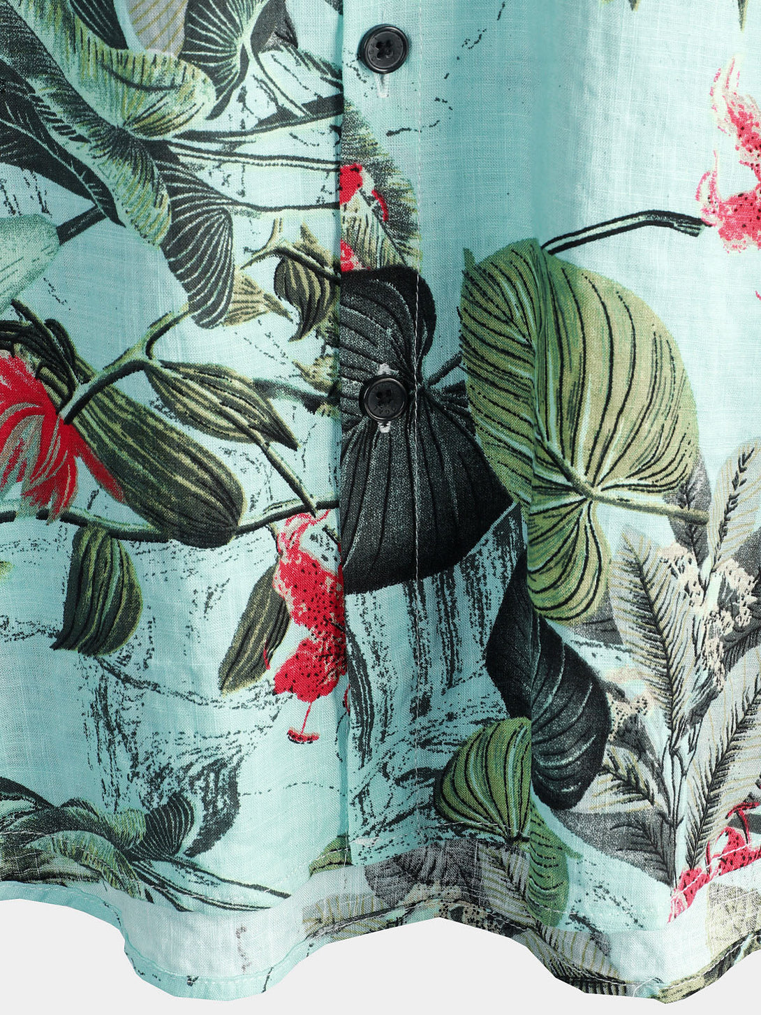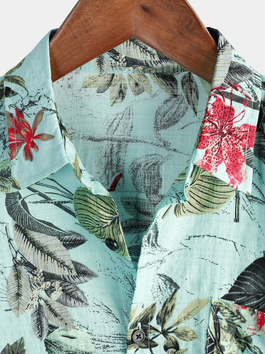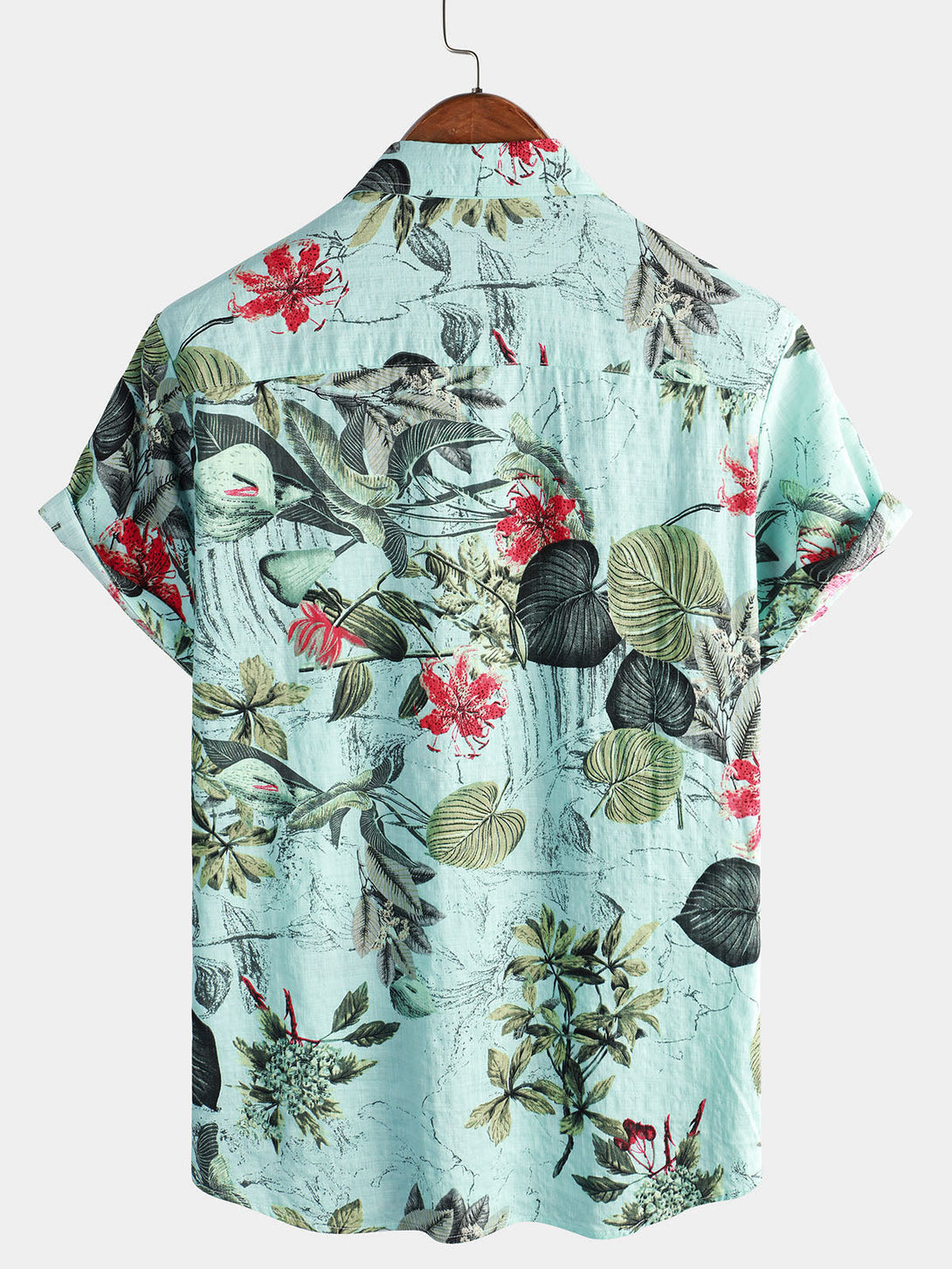 Men's Cotton Shirt With Floral Pattern, Tropical Green Hawaiian Plant, Short Sleeve, With Buttons