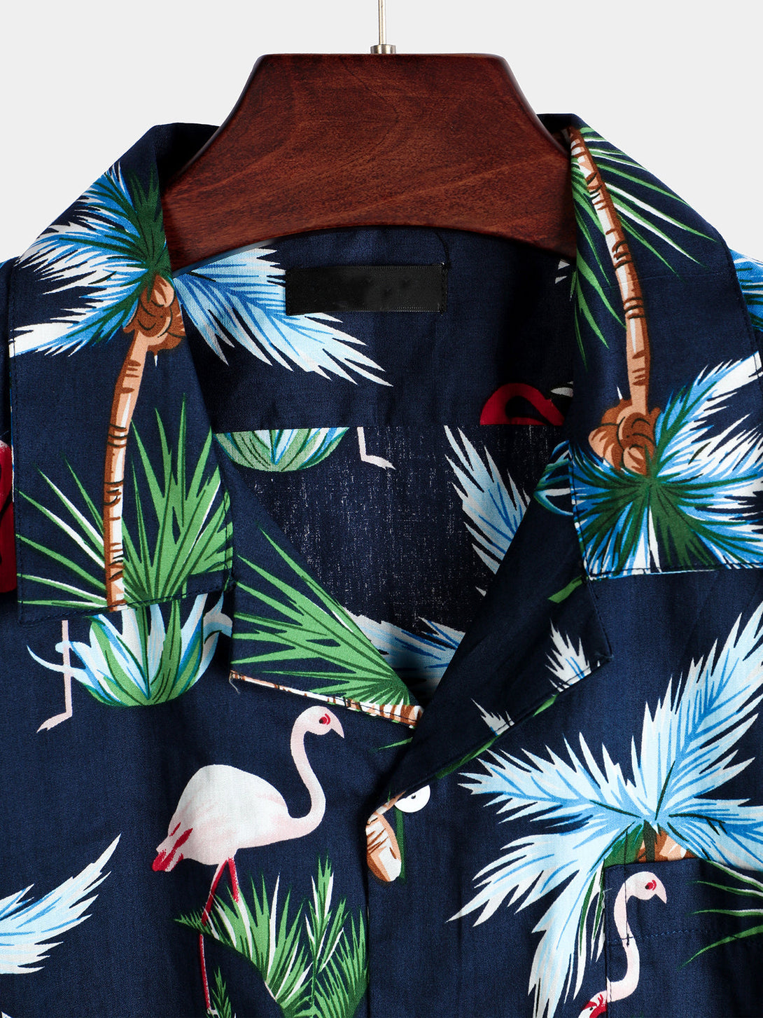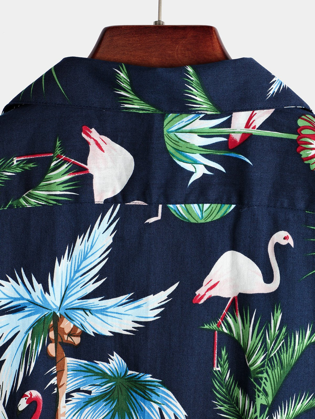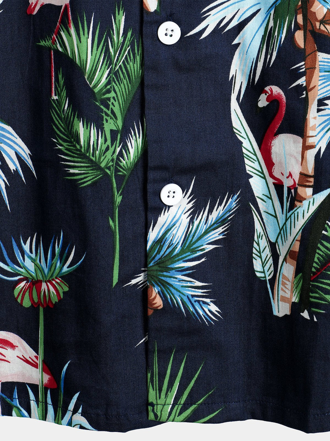 Men's Navy Blue Hawaiian Short-Sleeved Cotton Shirt With Flamingo Print