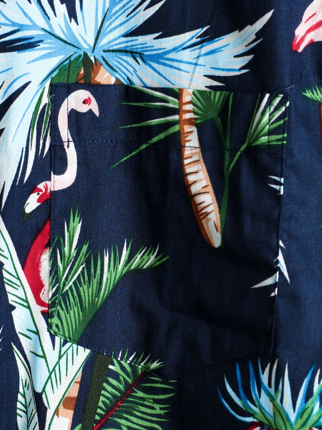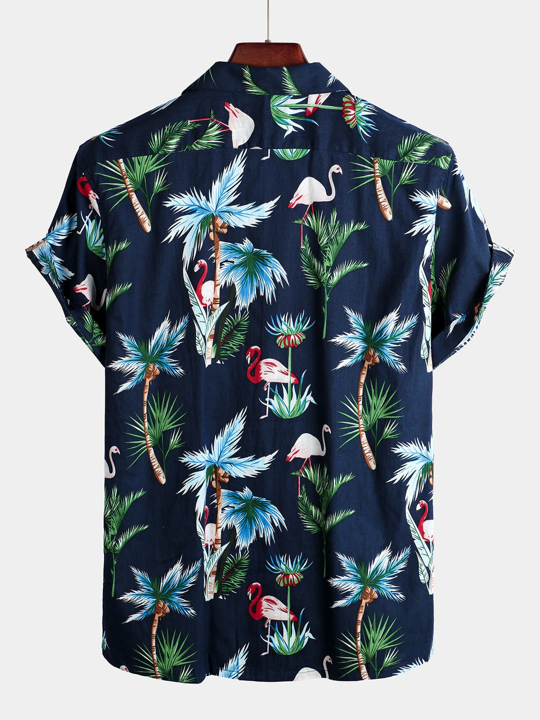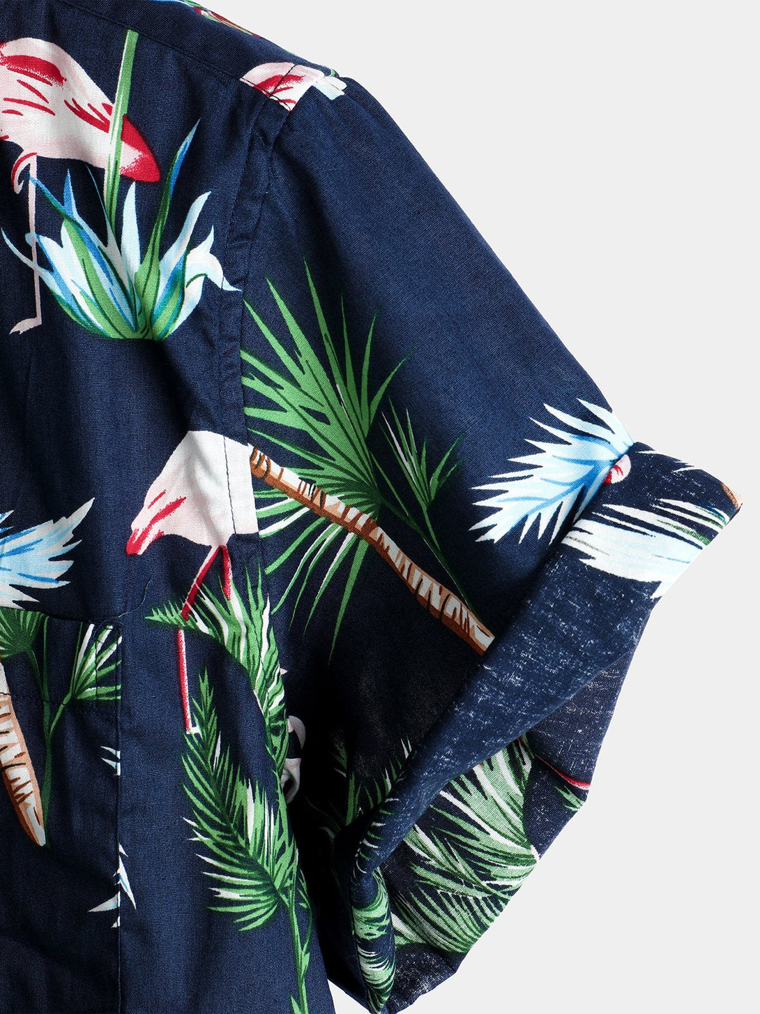 Men's Navy Blue Hawaiian Short-Sleeved Cotton Shirt With Flamingo Print