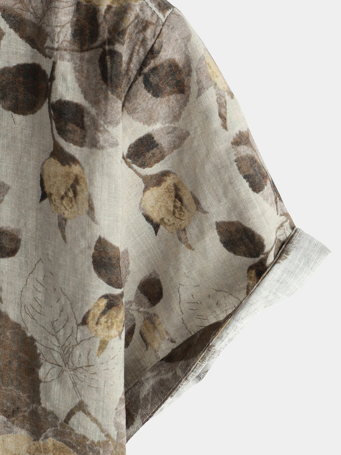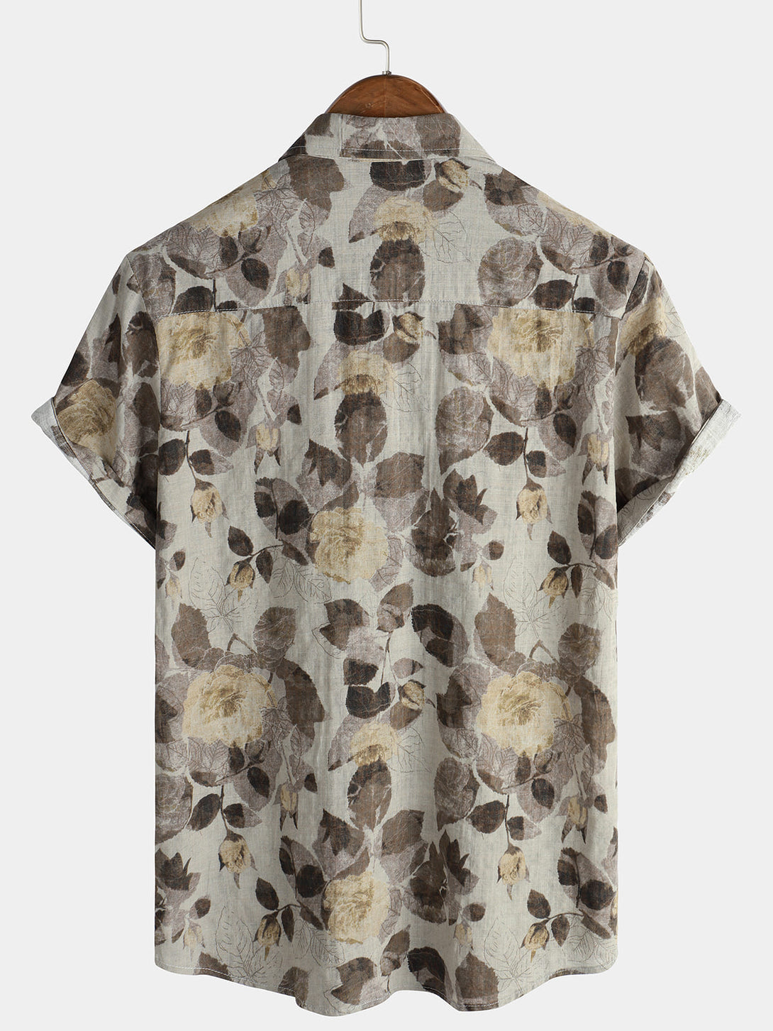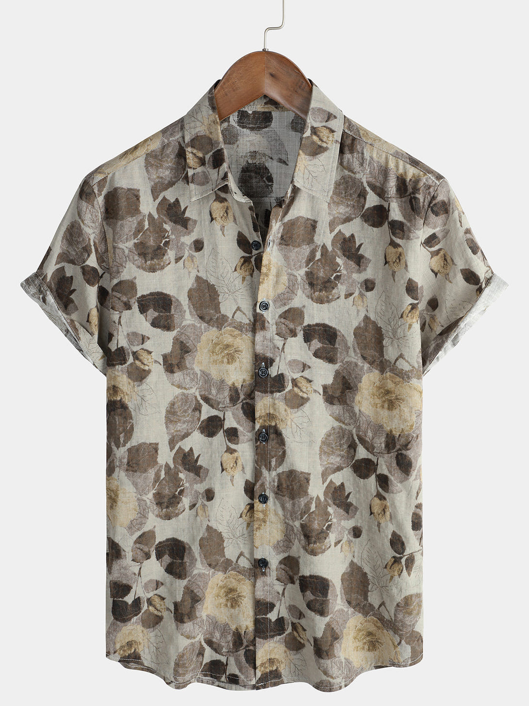 Men's Floral Print Vintage Short Sleeve Retro Beach Cotton Button Down Shirt