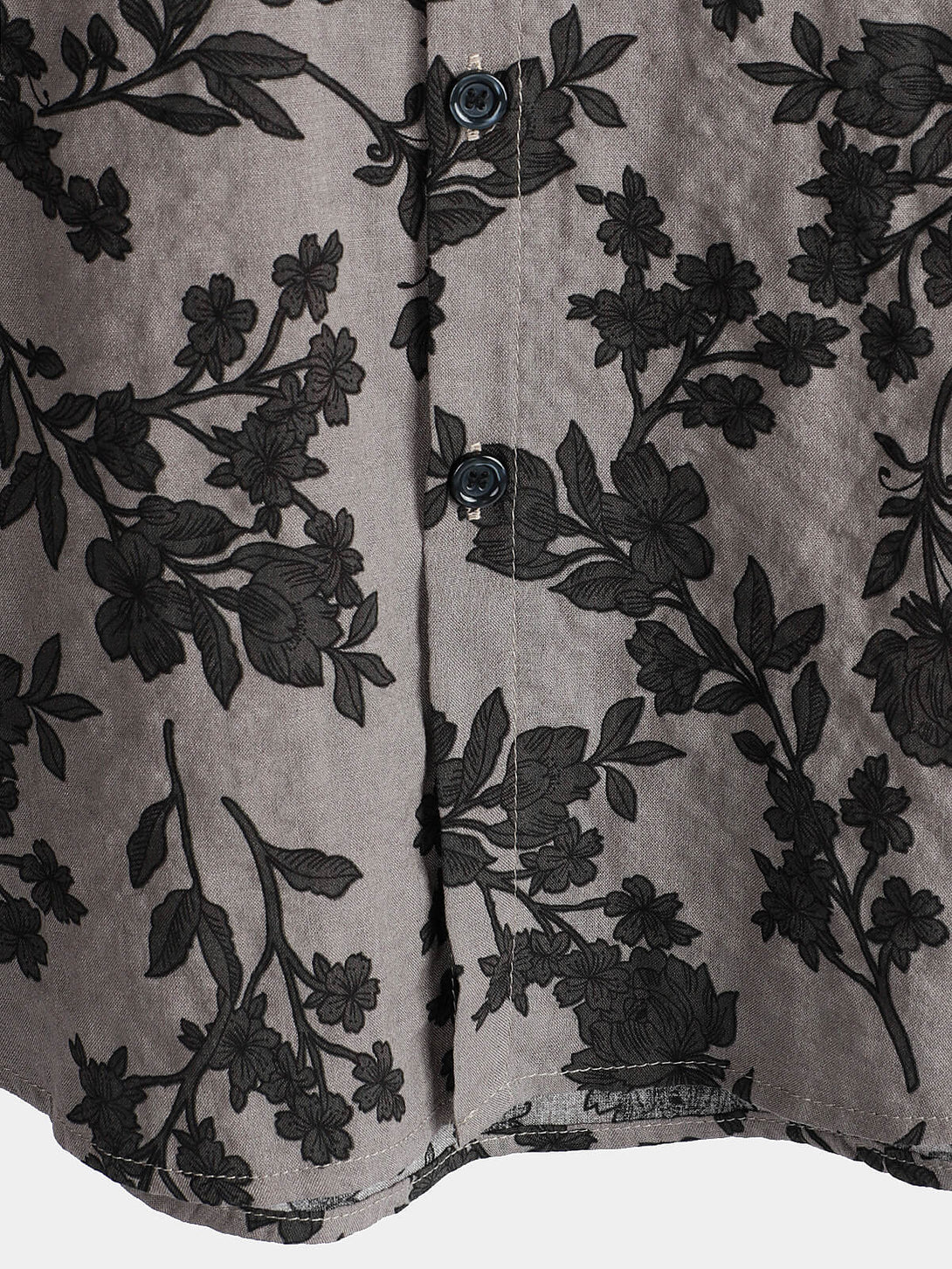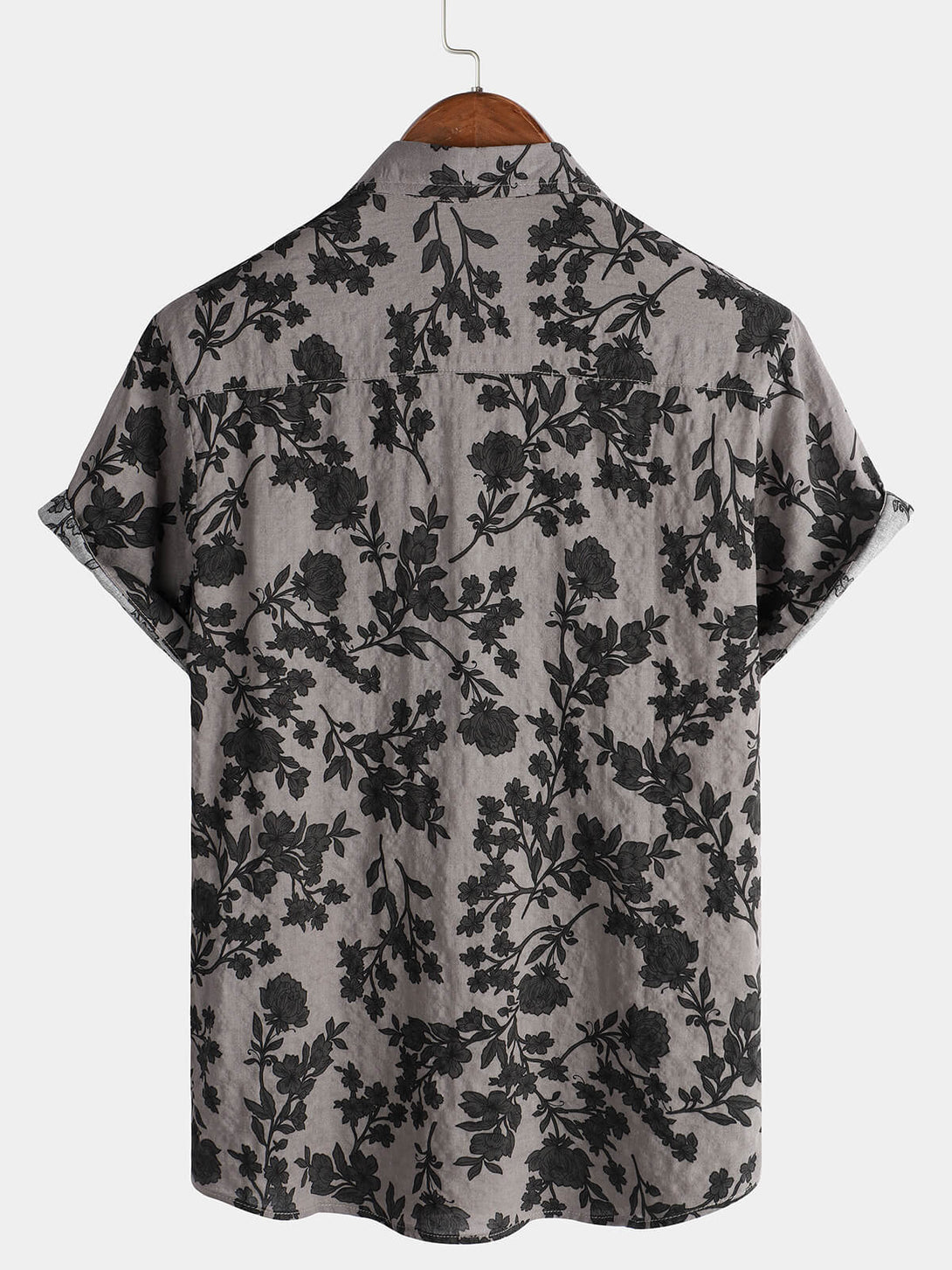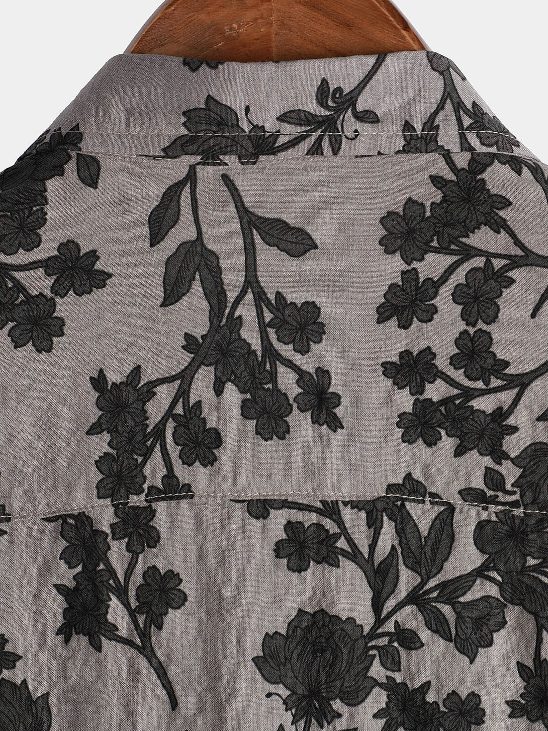 Men's Grey Short-Sleeved Floral Cotton Shirt In Vintage Style With Buttons