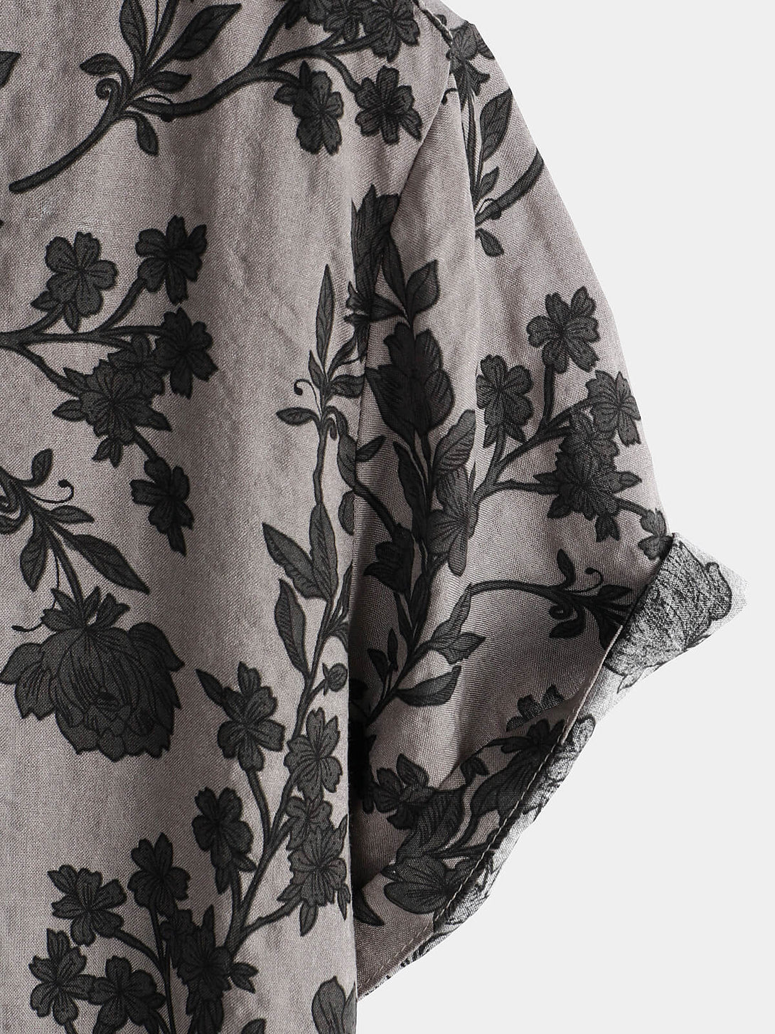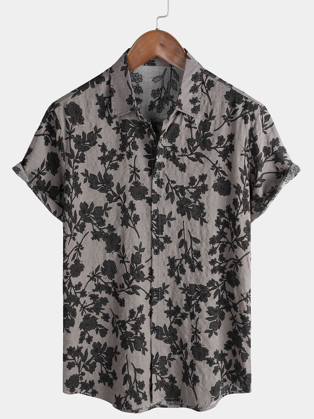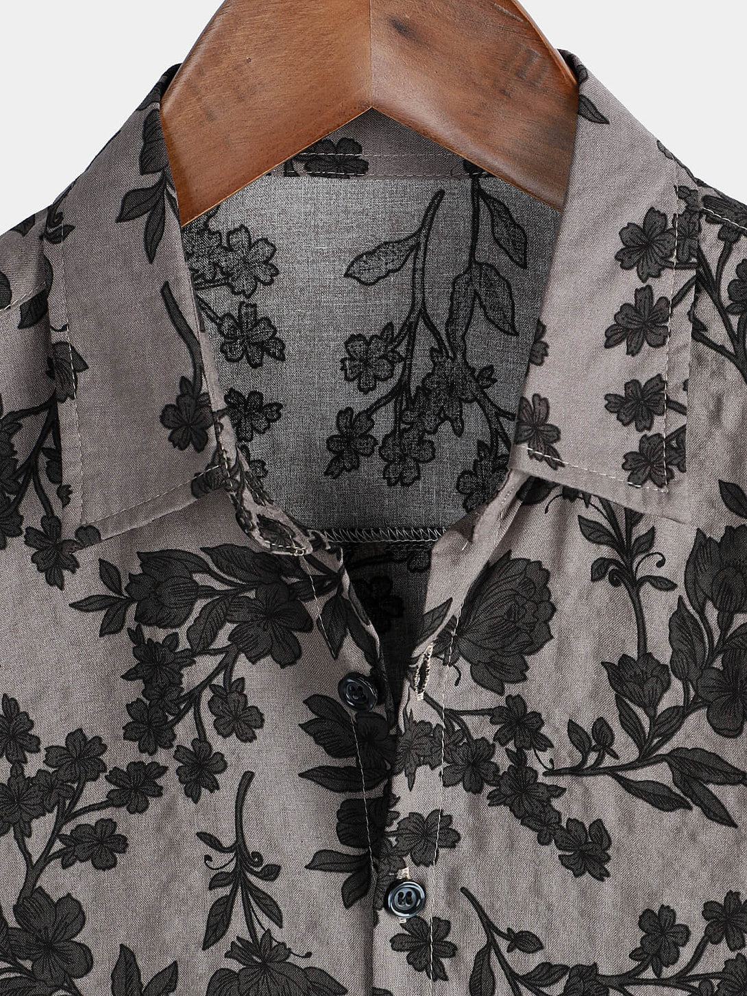 Men's Grey Short-Sleeved Floral Cotton Shirt In Vintage Style With Buttons