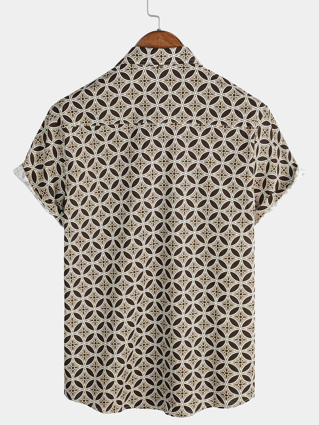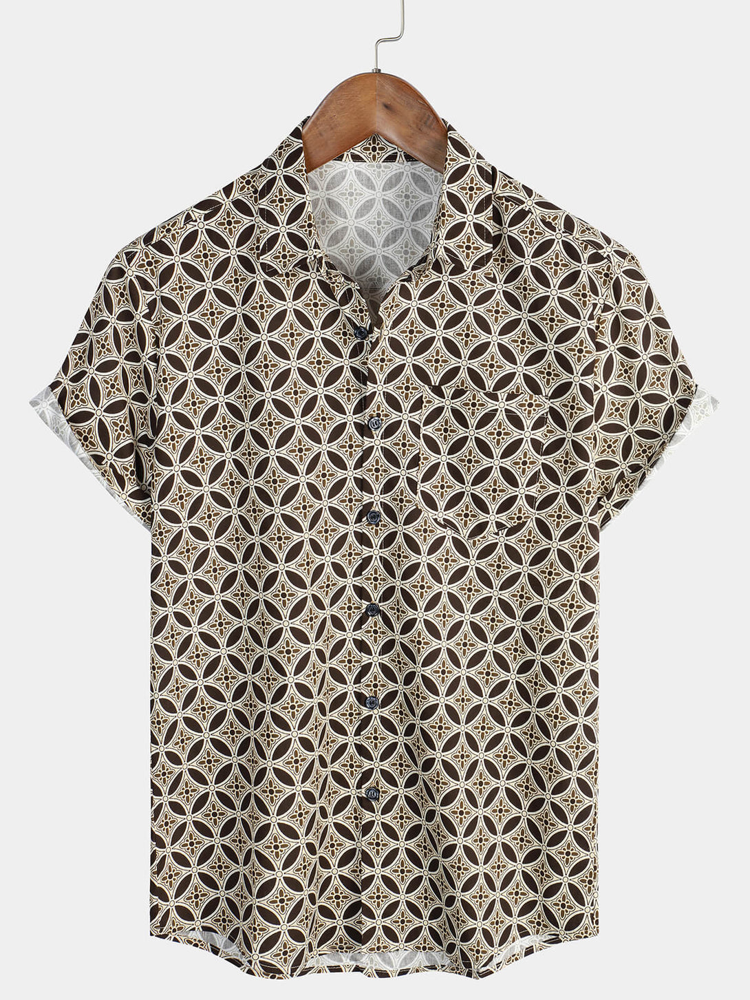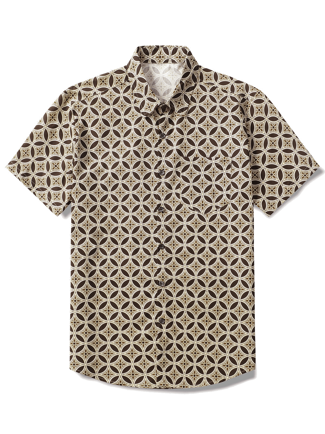 Khaki Short-Sleeved Men's Shirt With Geometric Floral Pattern And Pockets