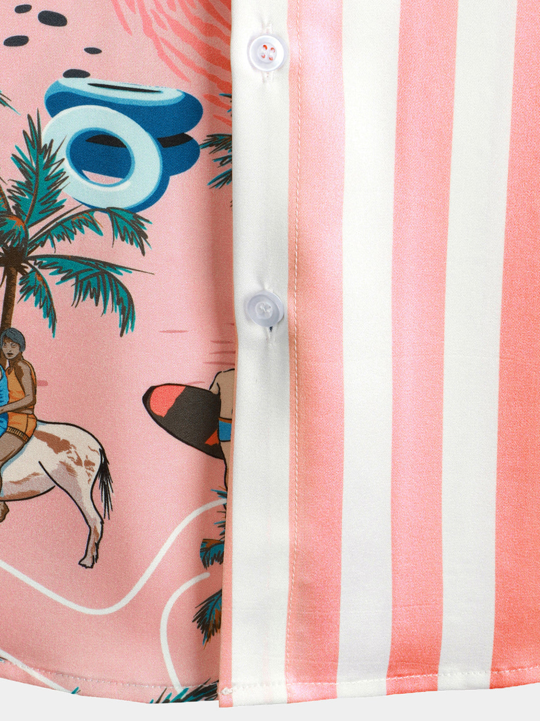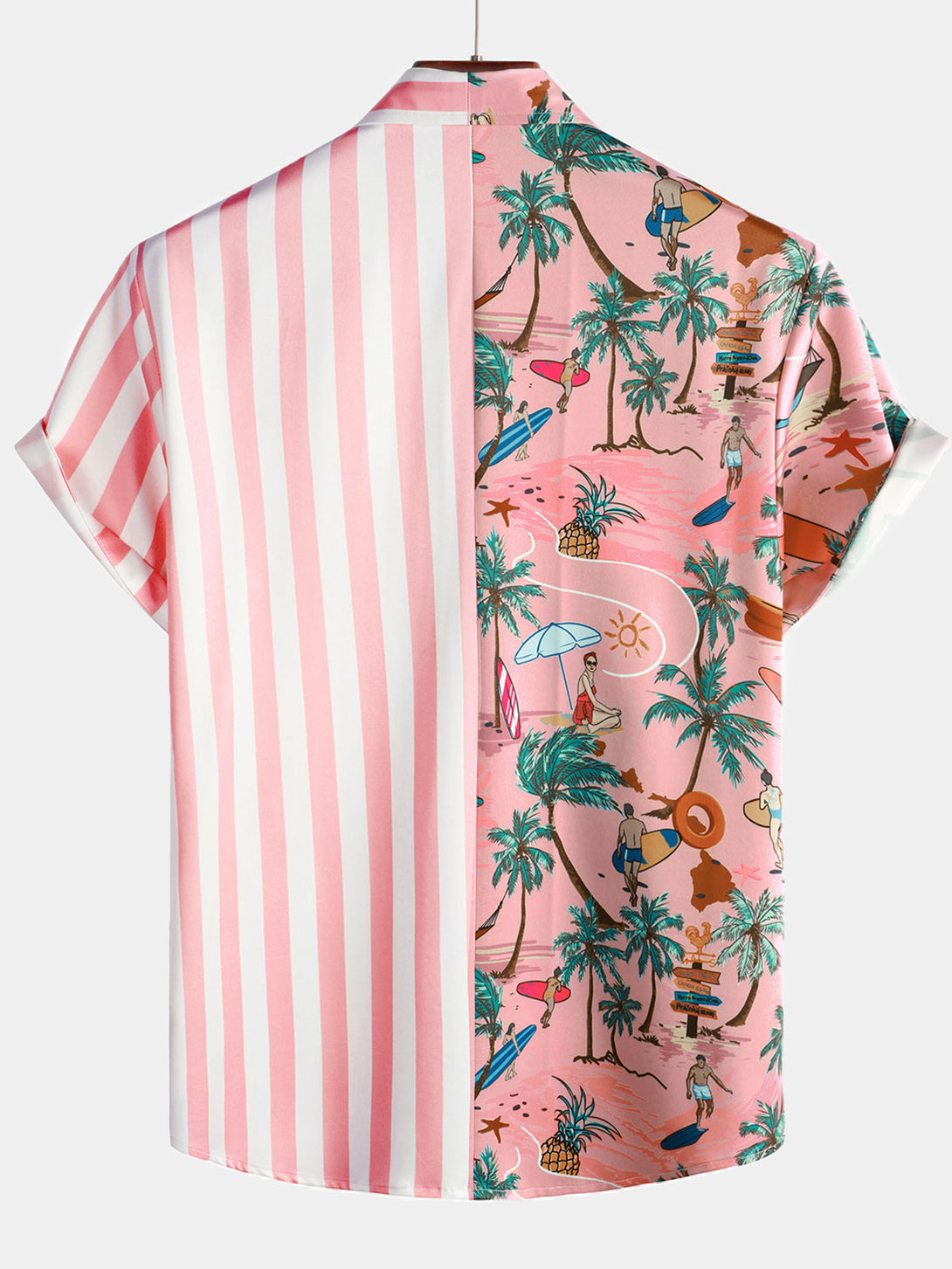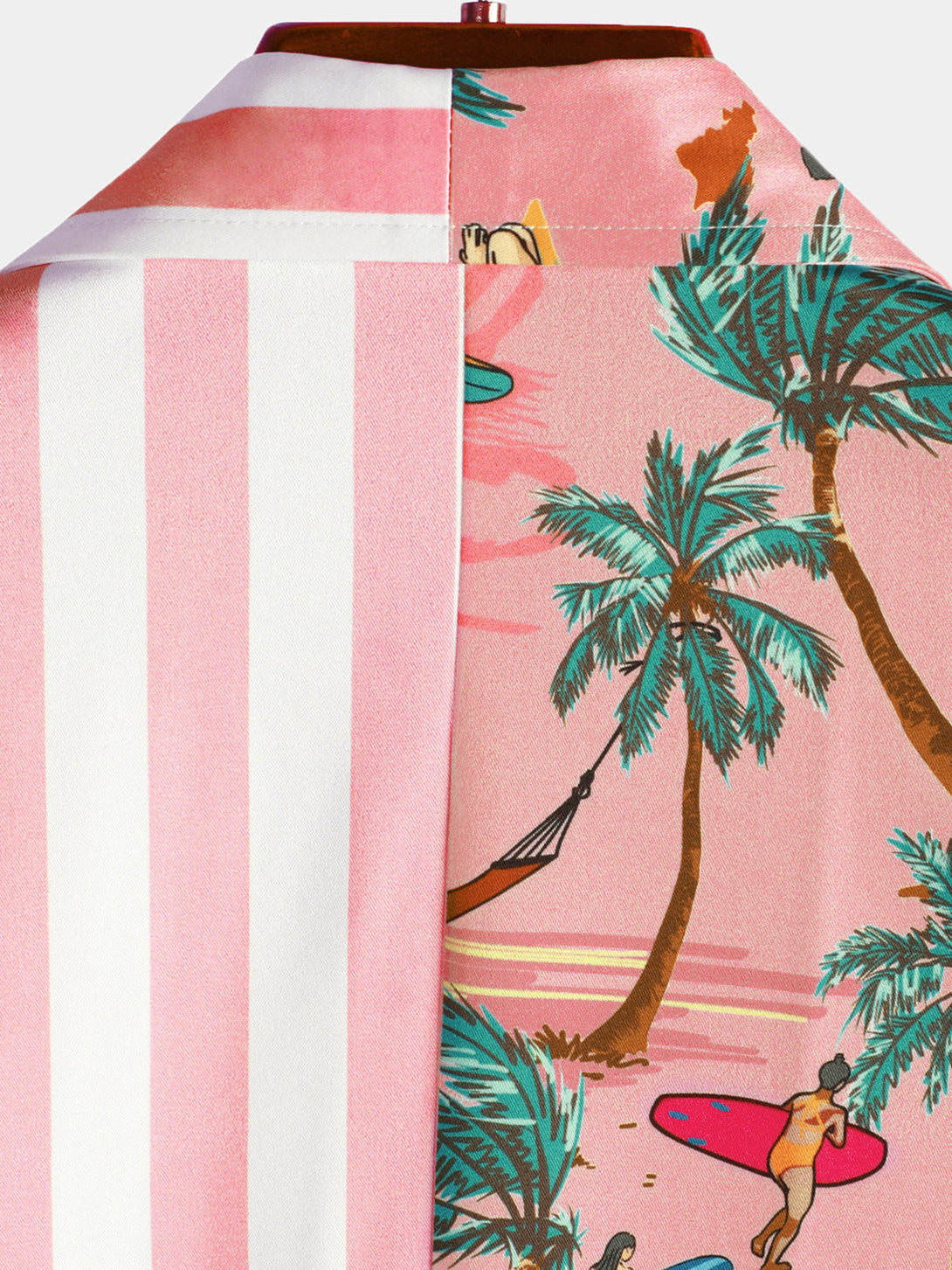 Men's Pink And White Striped Aloha Hawaiian Shirt With Palm Tree Pattern