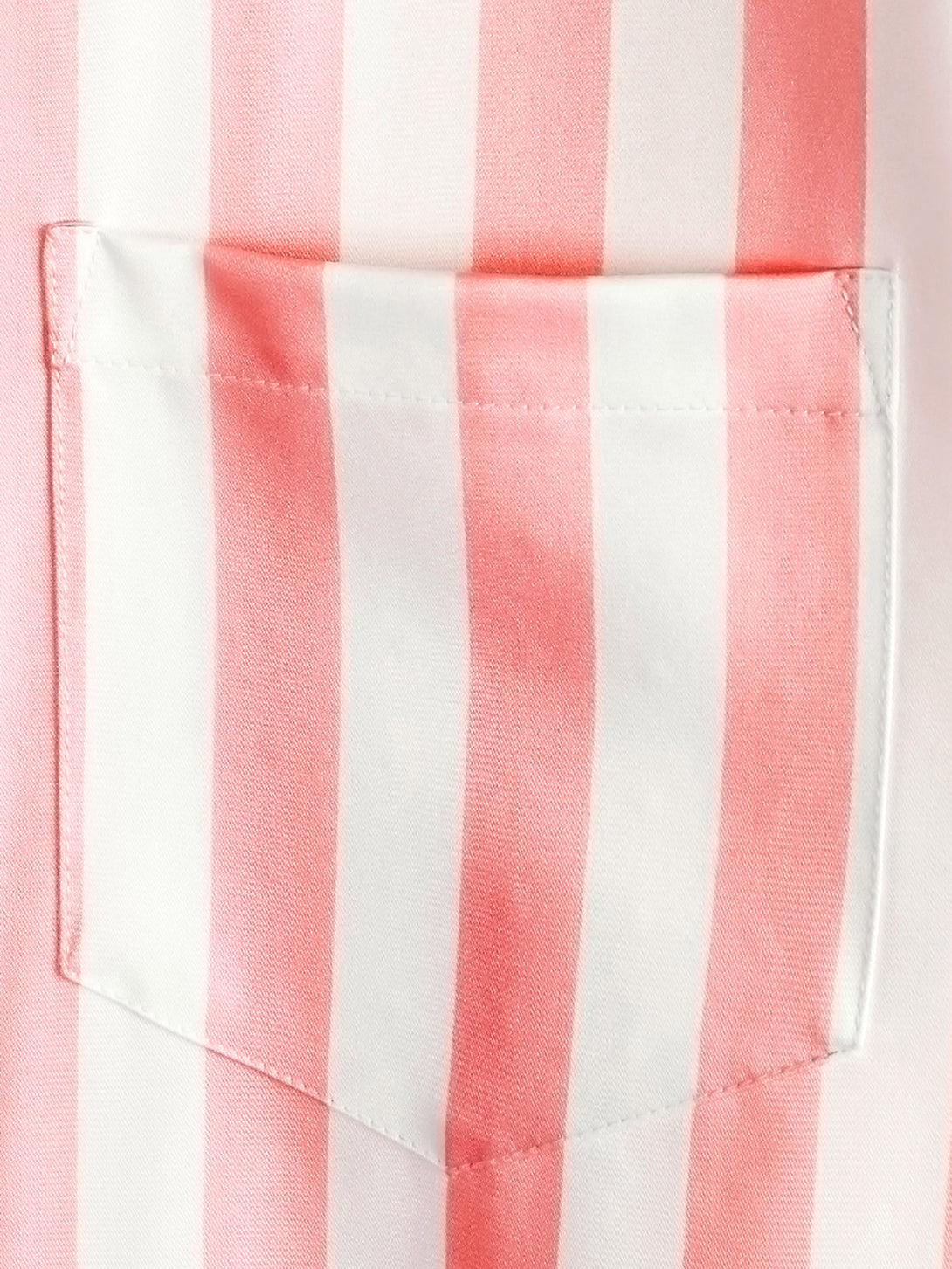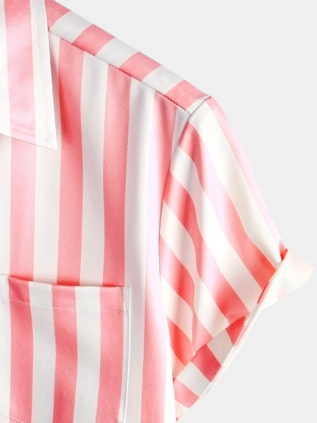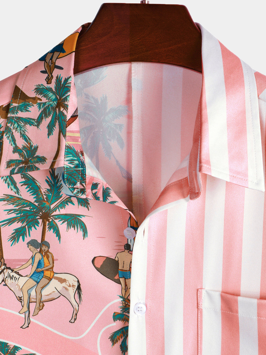 Men's Pink And White Striped Aloha Hawaiian Shirt With Palm Tree Pattern
