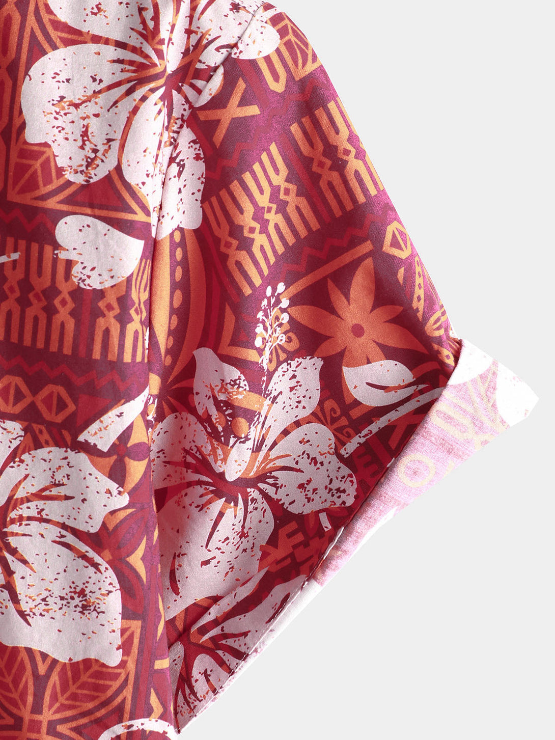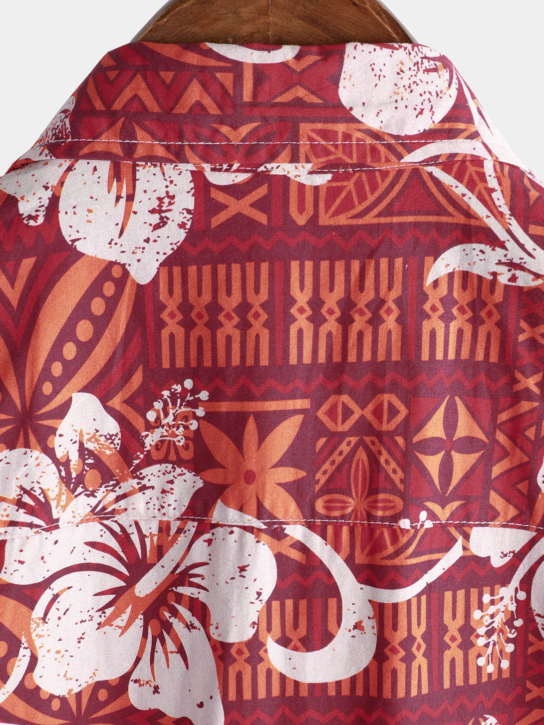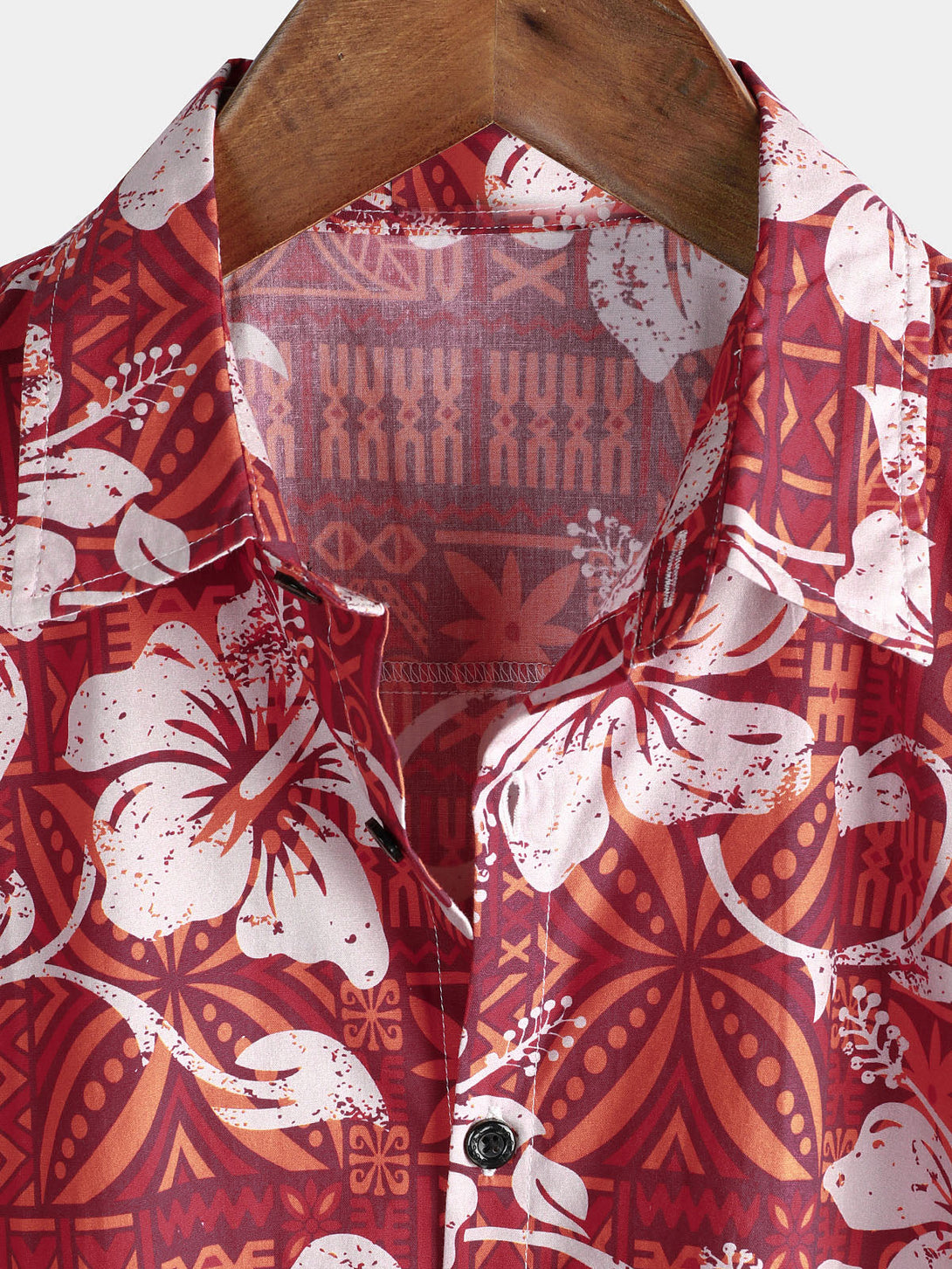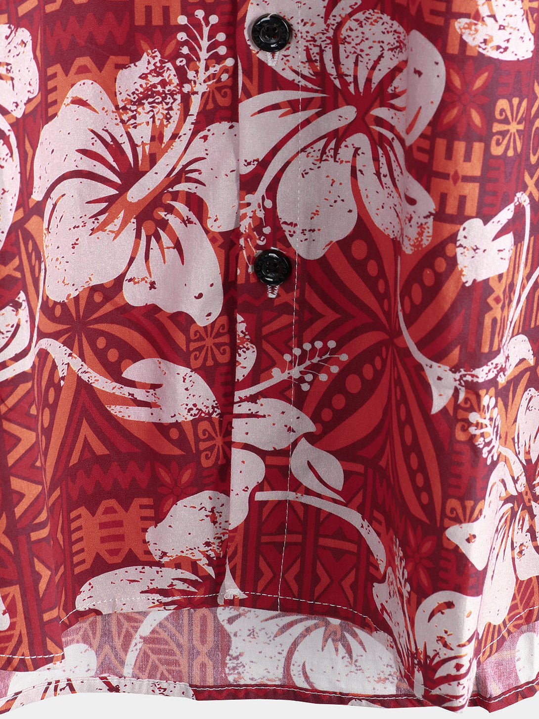 Red Hawaiian Vintage Hibiscus Floral Print Summer Beach Vacation Button Down Shirt For Men