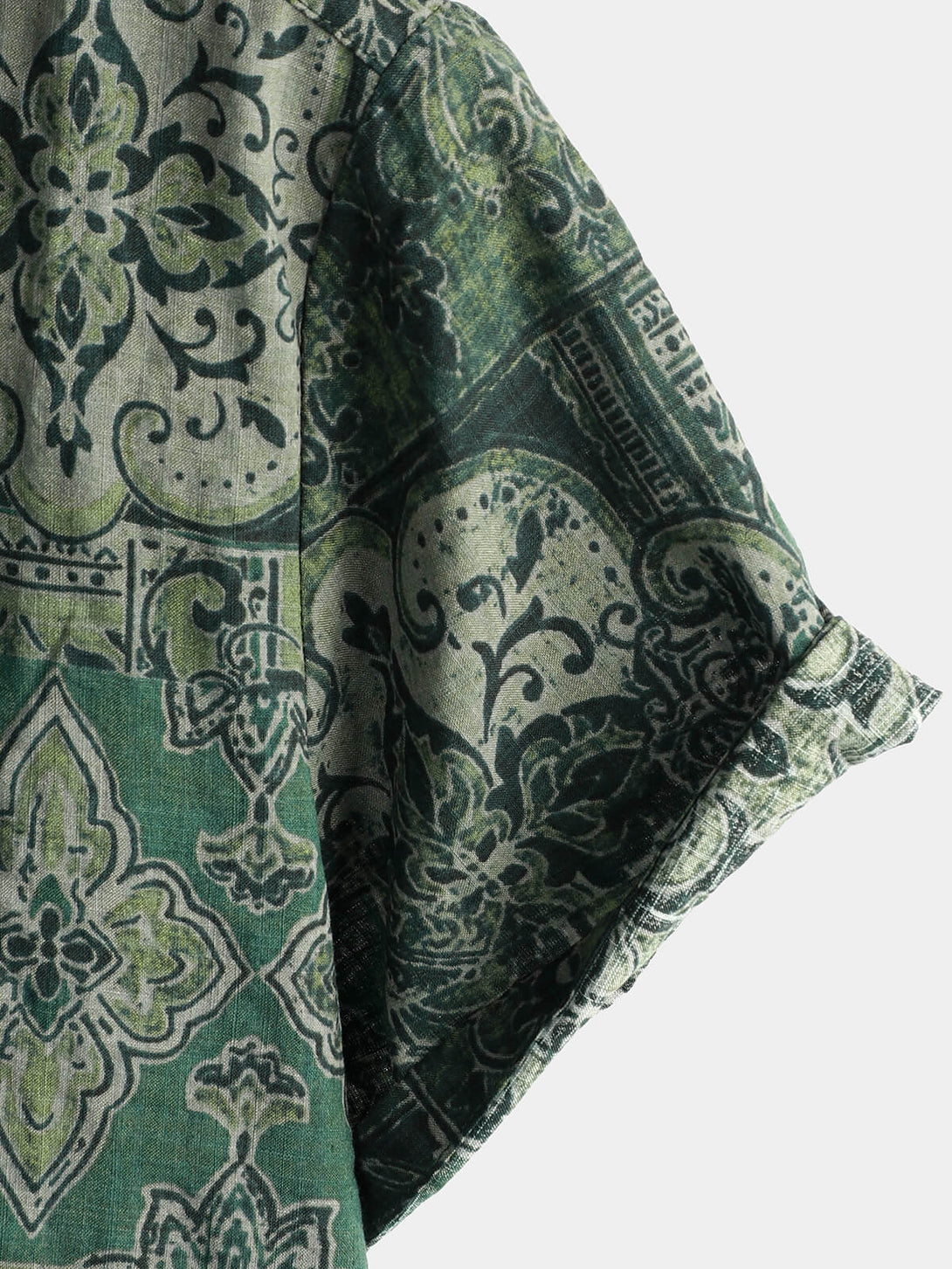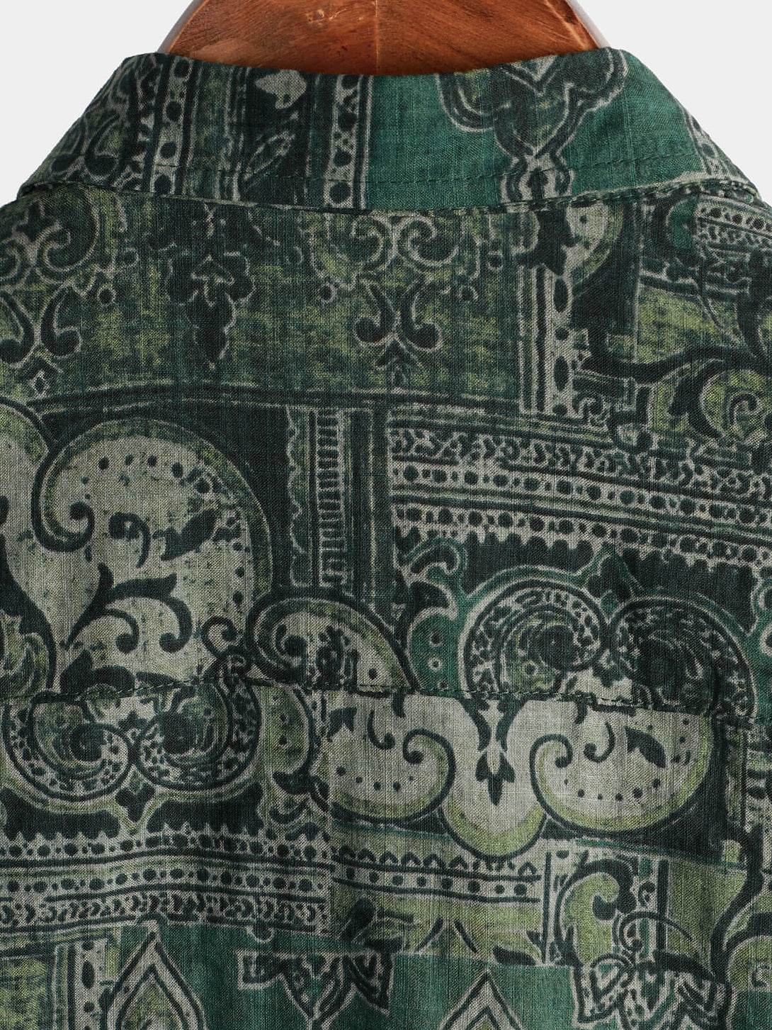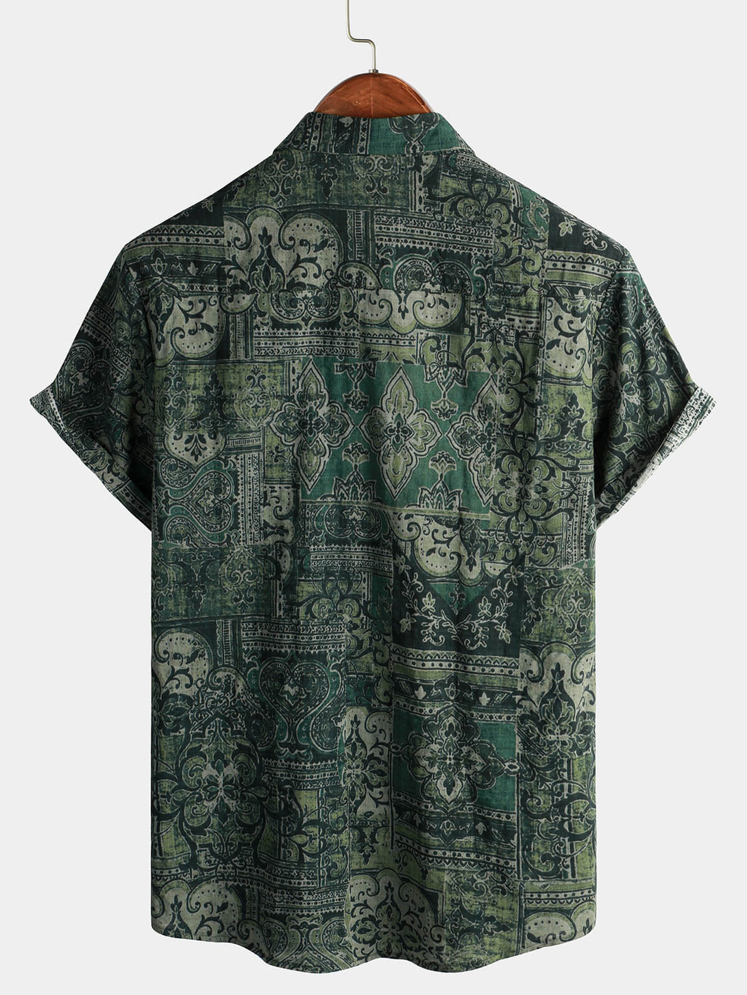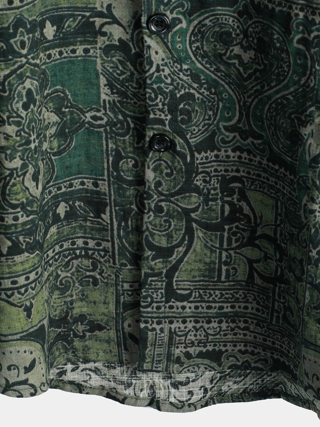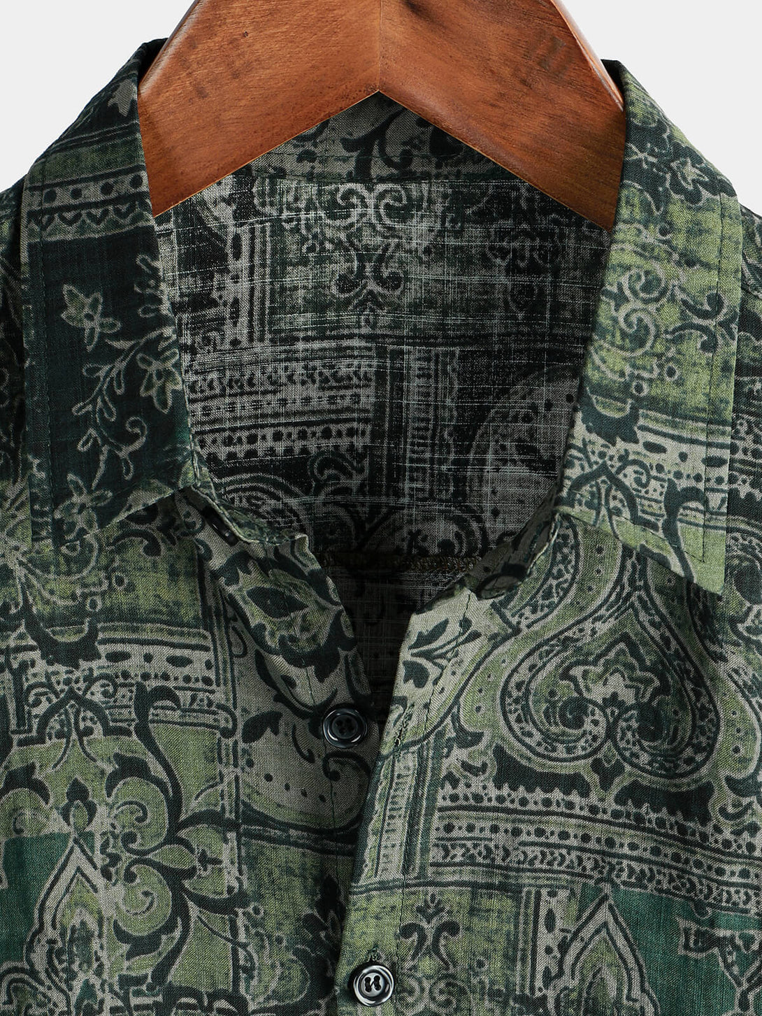 Men's Retro Floral Paisley Print Cotton Button Down Vintage Style Holiday Western Green Shirt