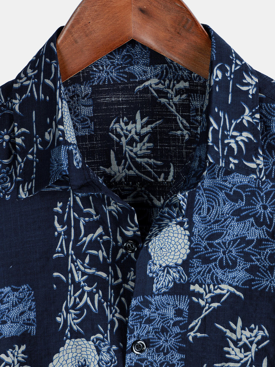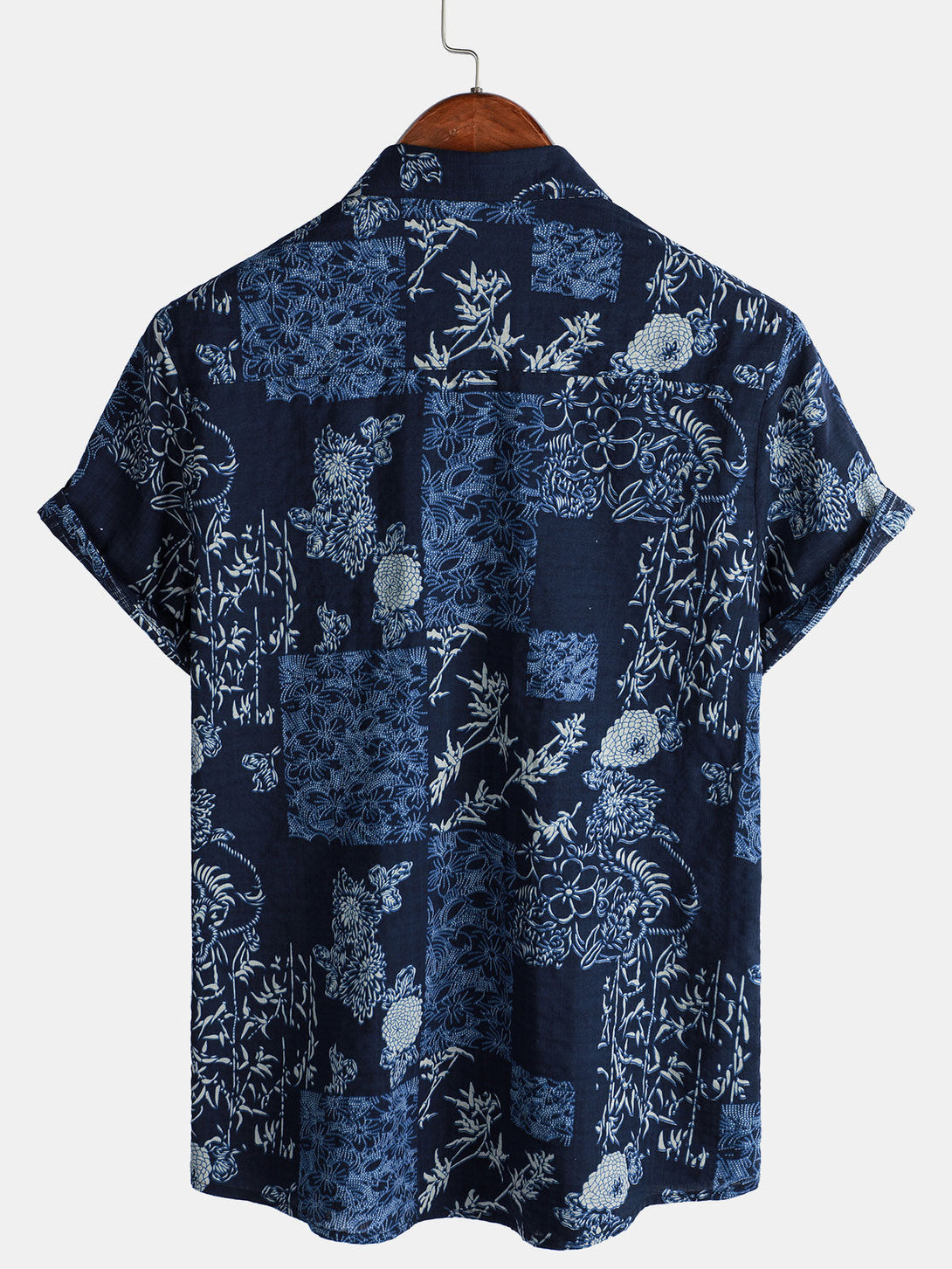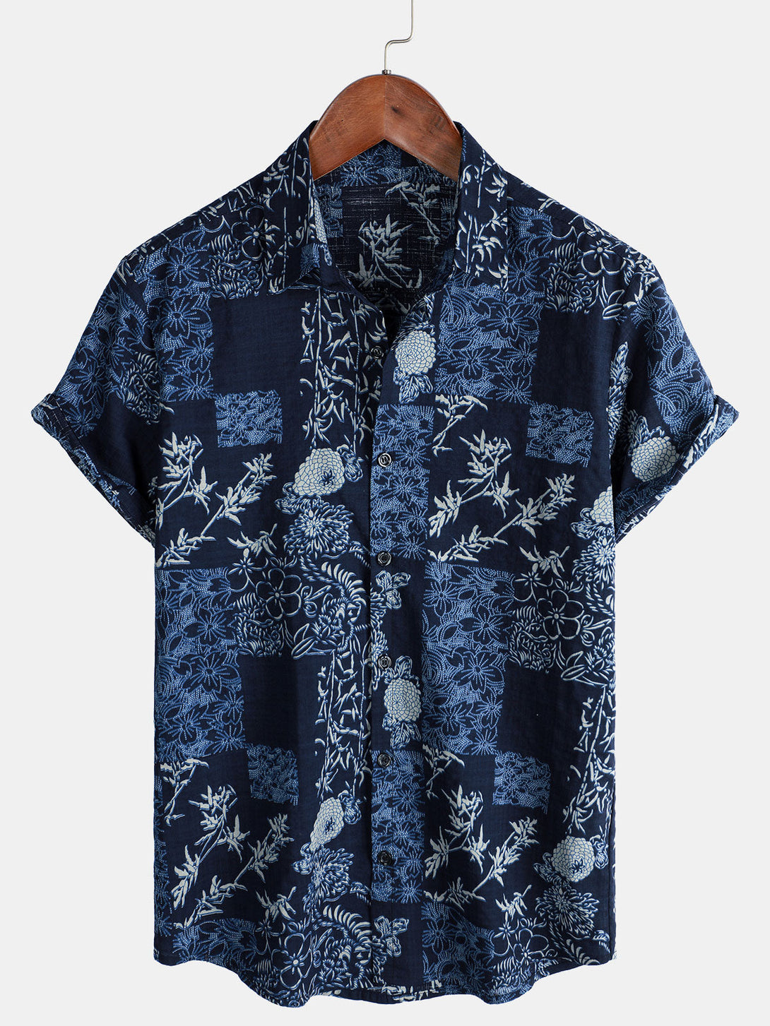 Men's Summer Short-Sleeved Shirt In Retro Style With Floral Pattern In Navy Blue