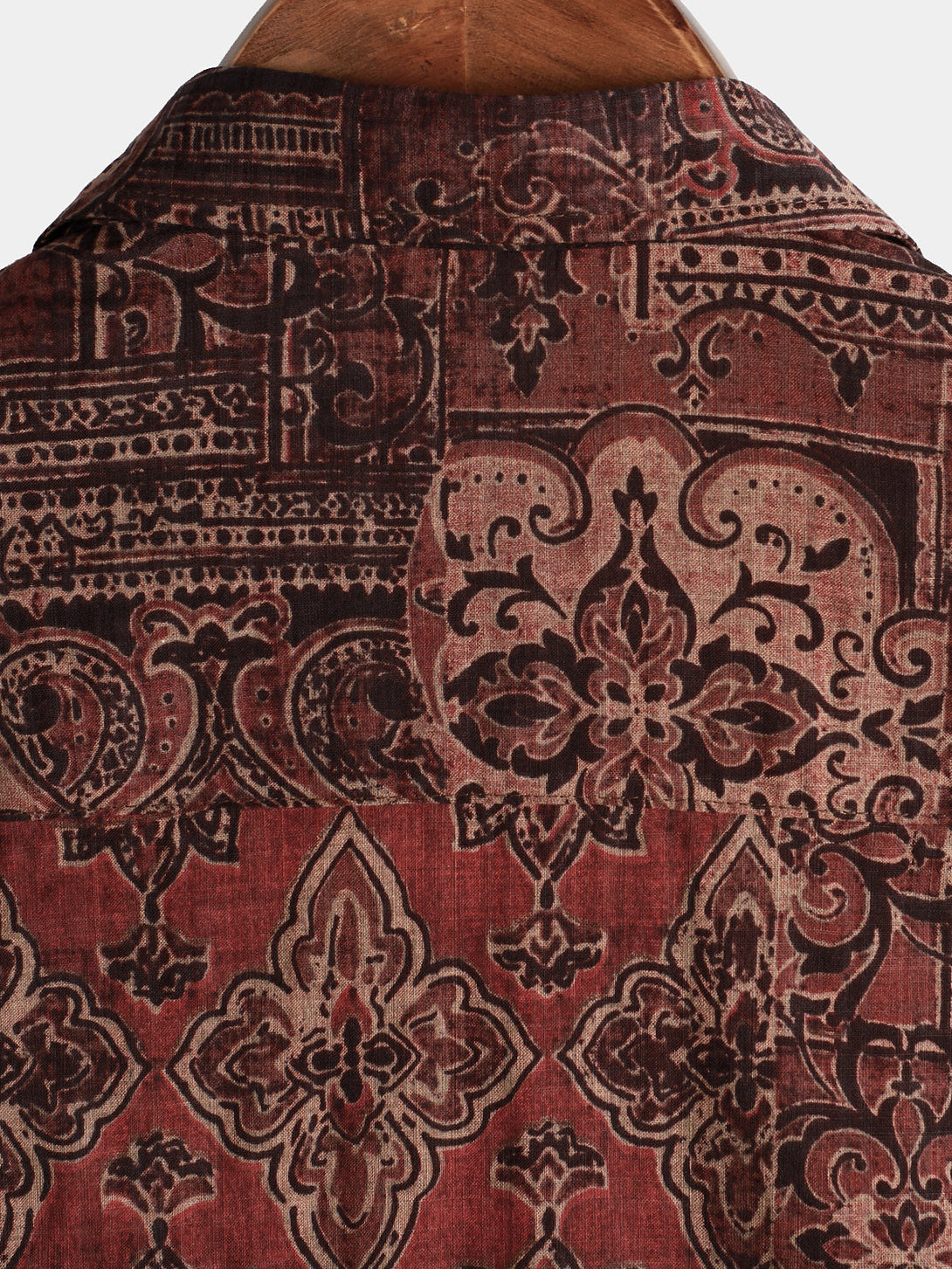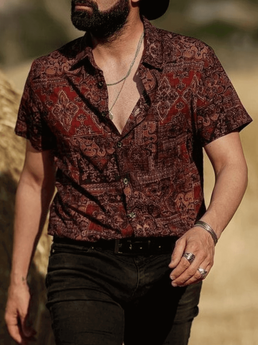 Men's Short-Sleeved Cotton Shirt With Retro Paisley Floral Print And Vintage Holiday Western Pattern