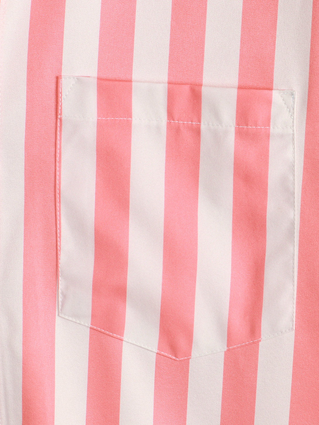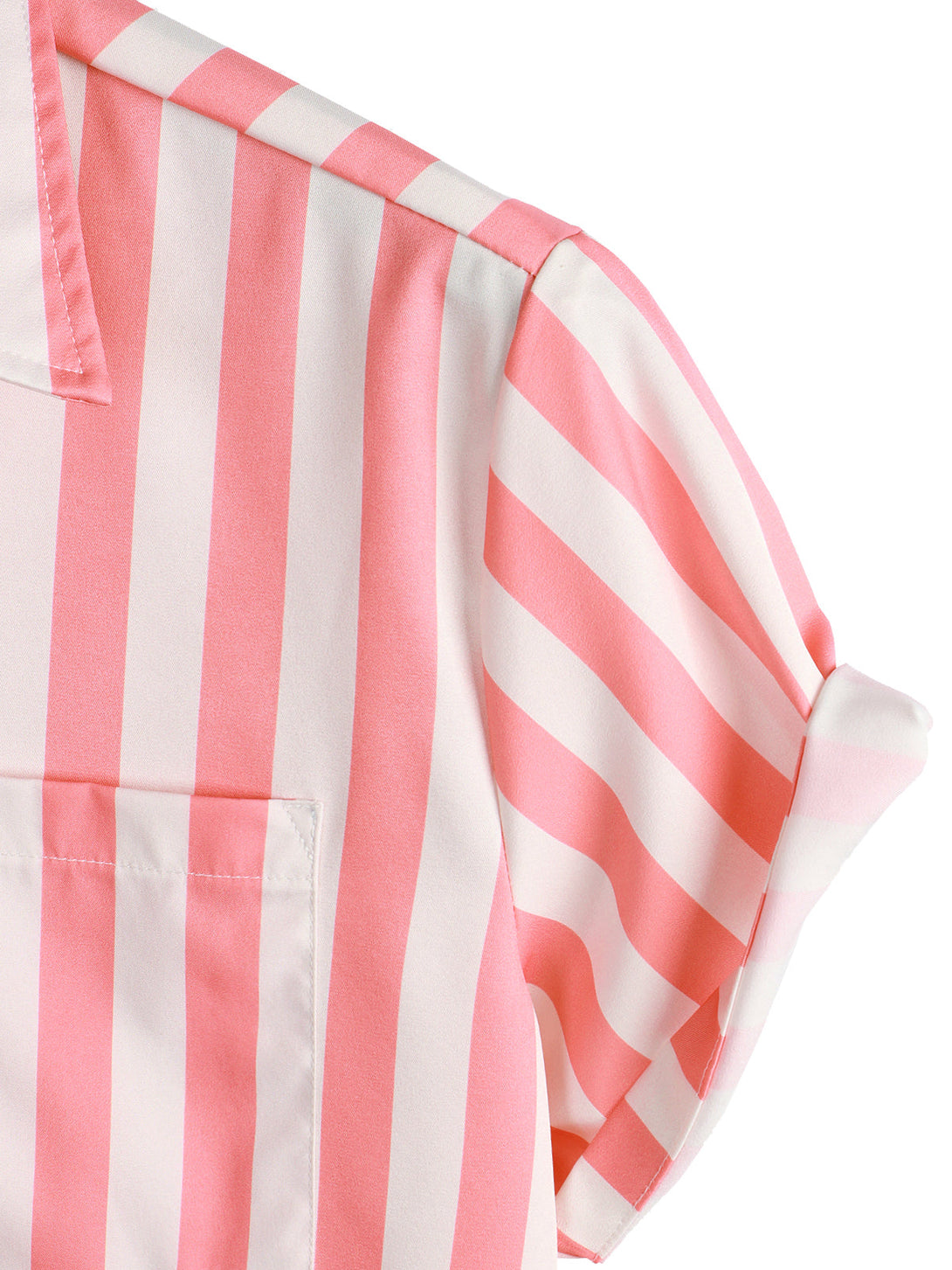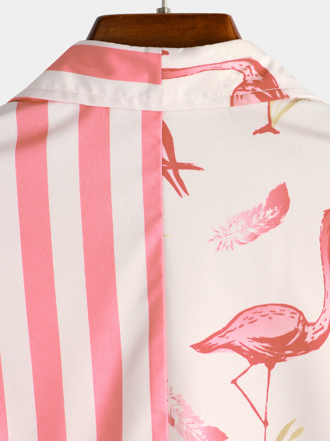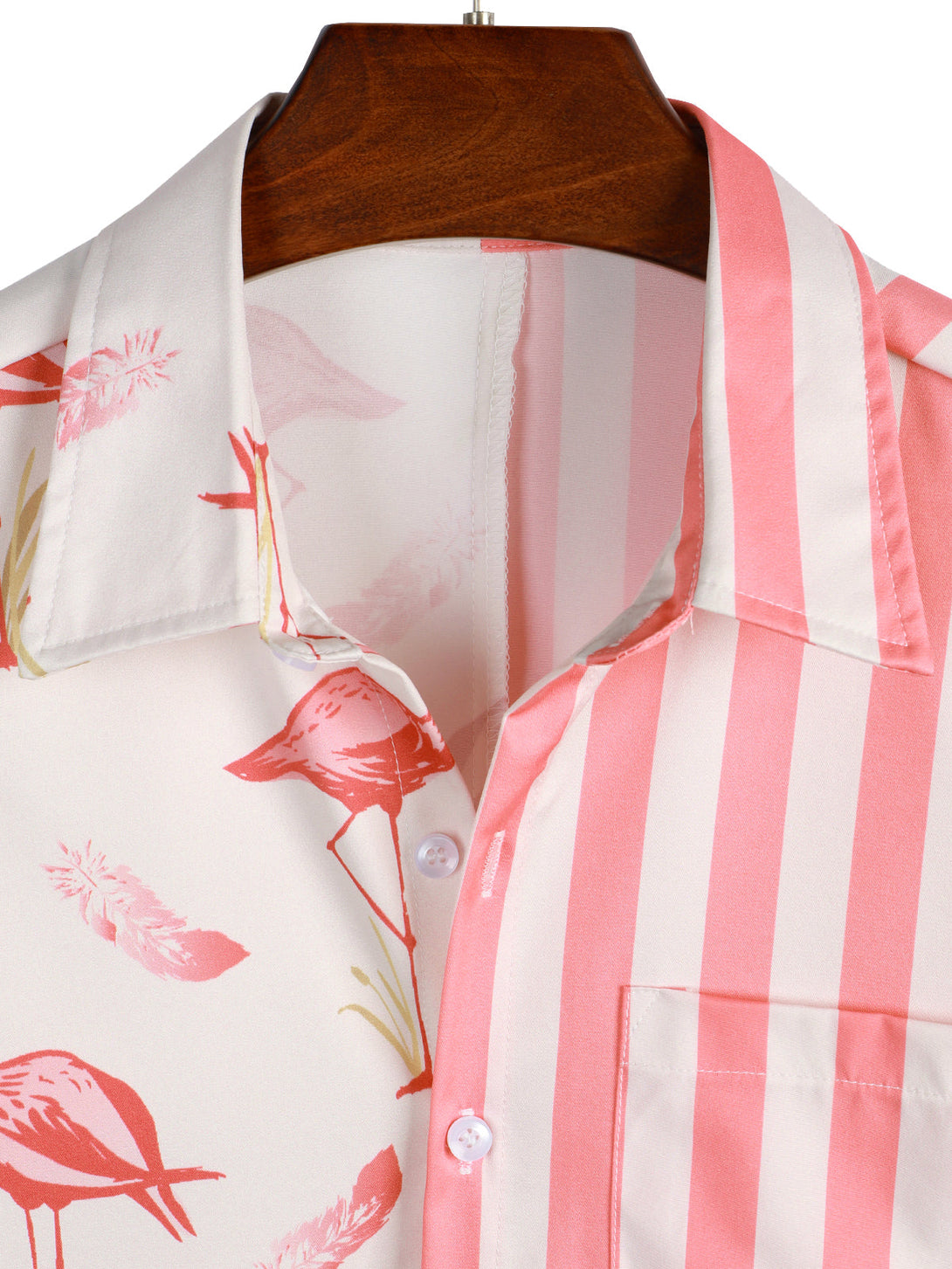 Men's Short-Sleeved Shirt With Pink Flamingo And Stripe Pattern And Holiday Pocket