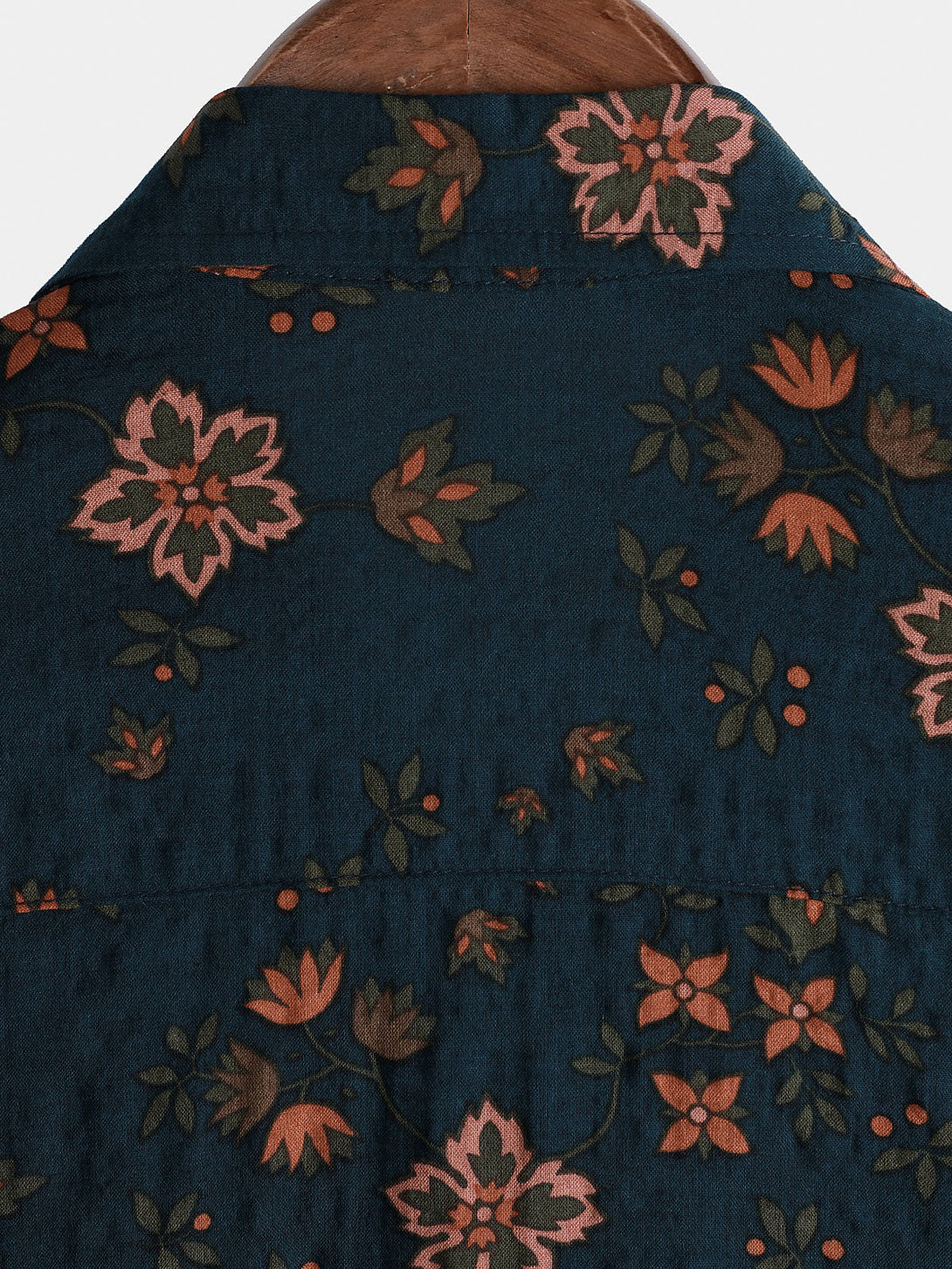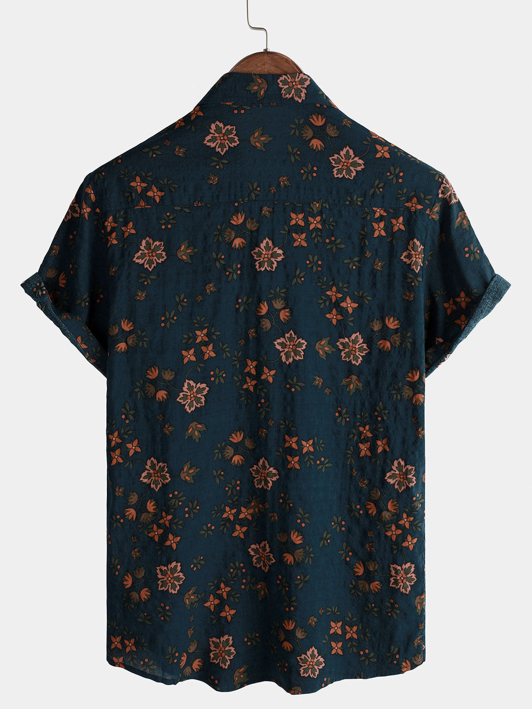 Men's Navy Blue Short-Sleeved Cotton Shirt With Summer Floral Print