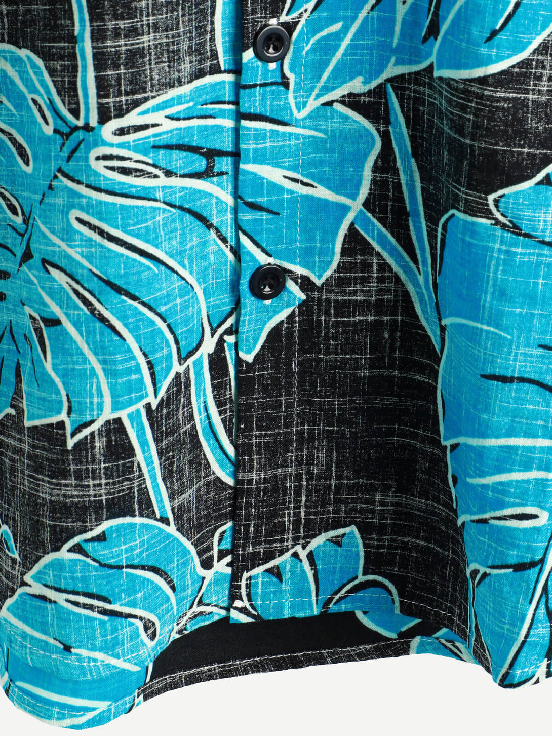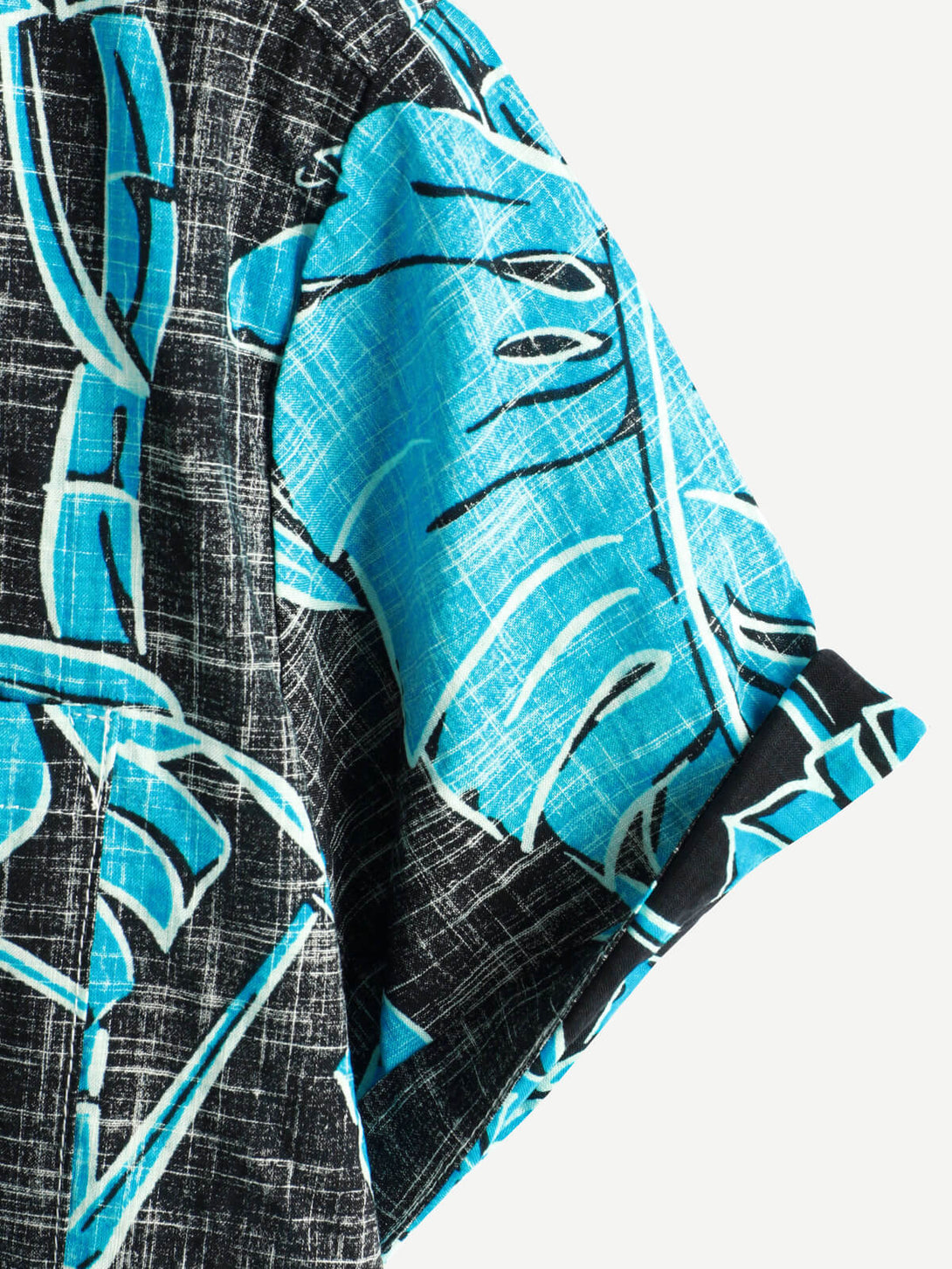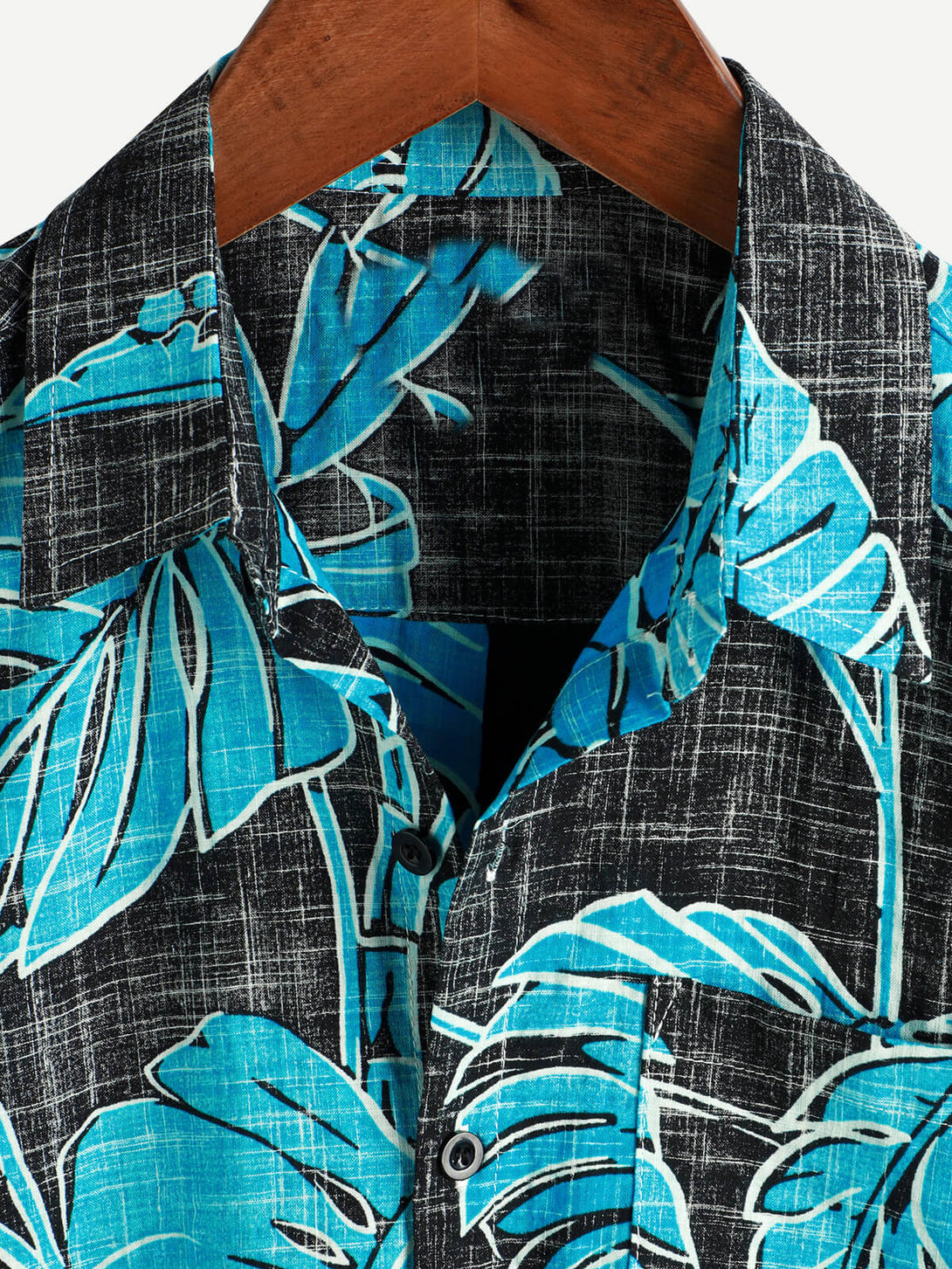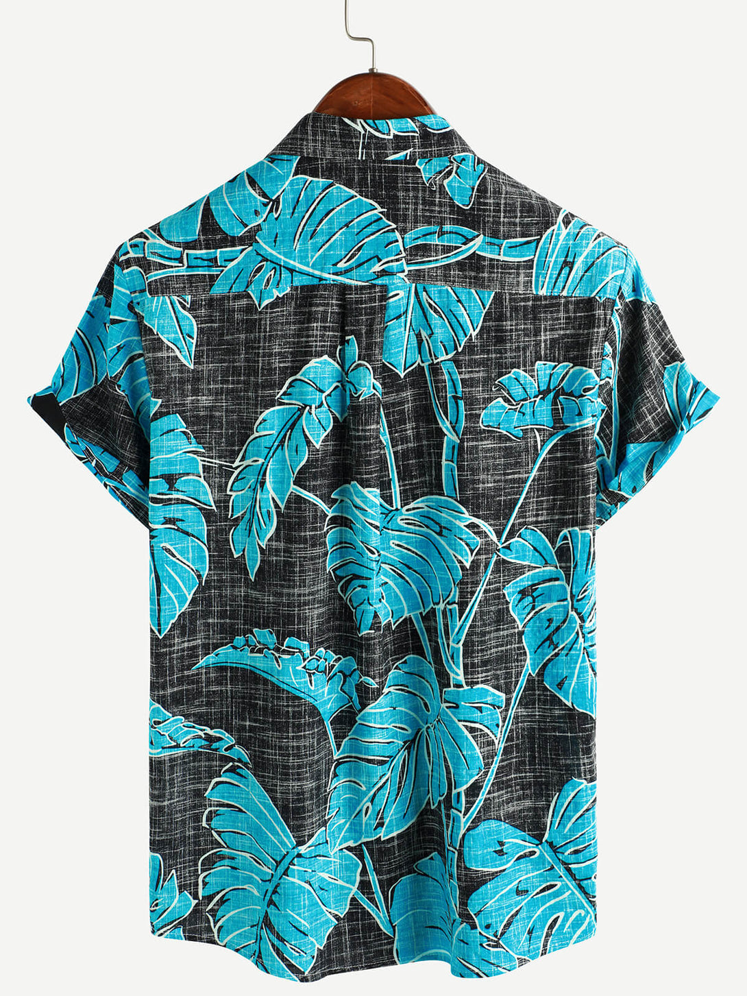 Men's Summer Shirt With Tropical Print And Pocket, Cool Black Hawaiian Beach Shirt With Short Sleeves And Buttons