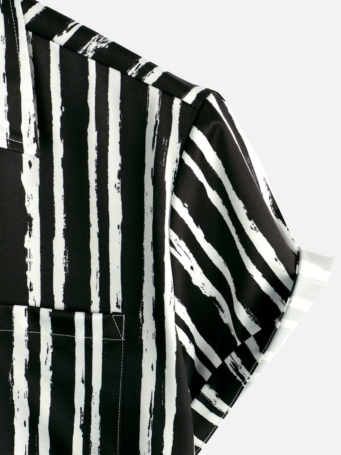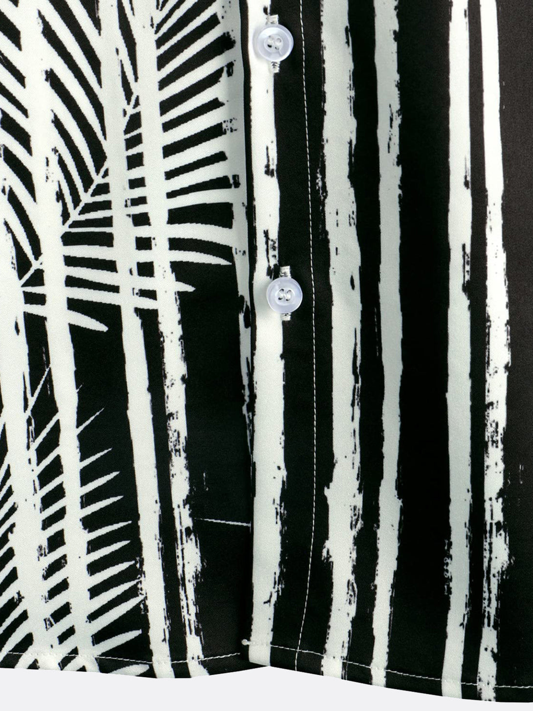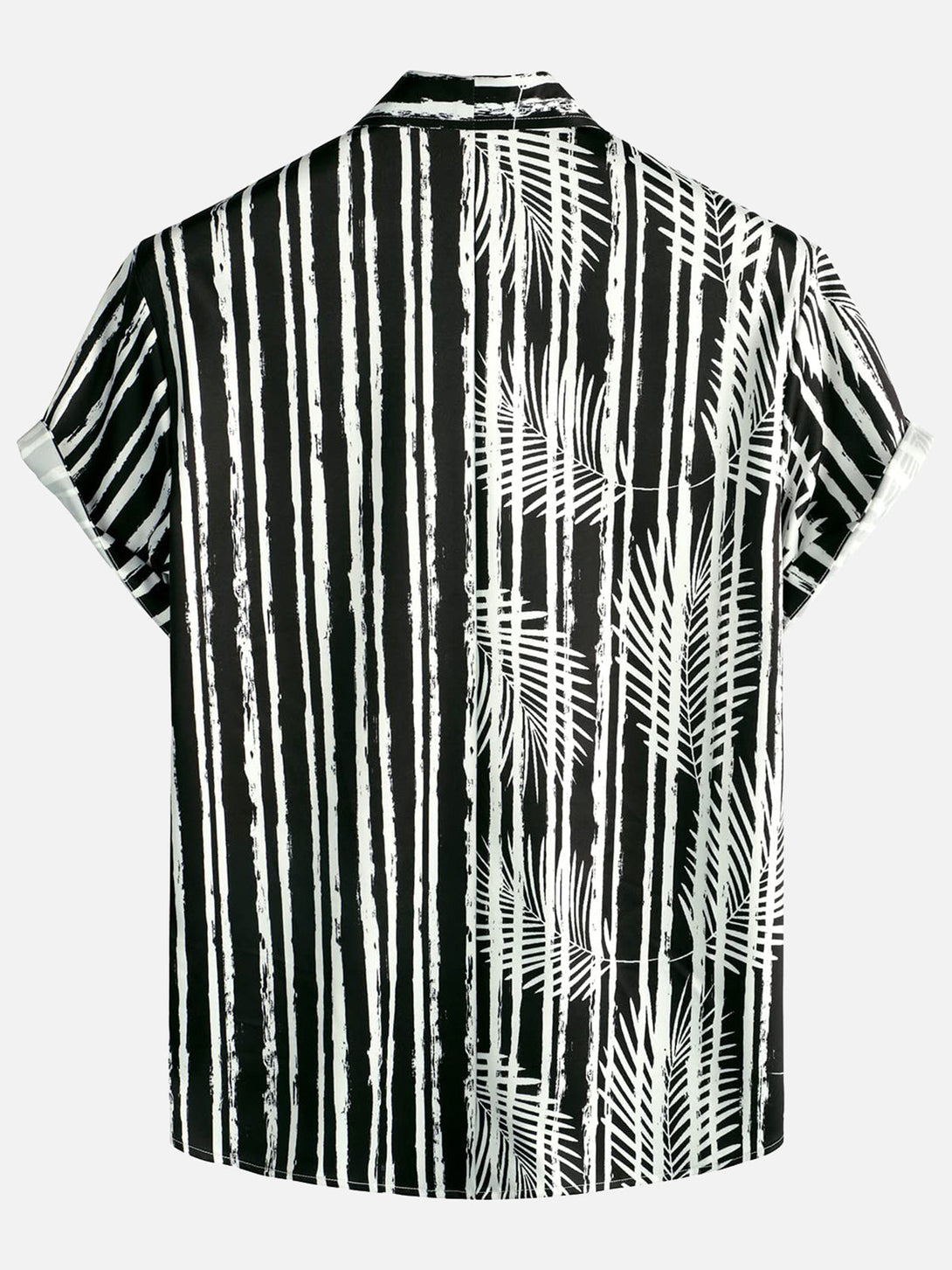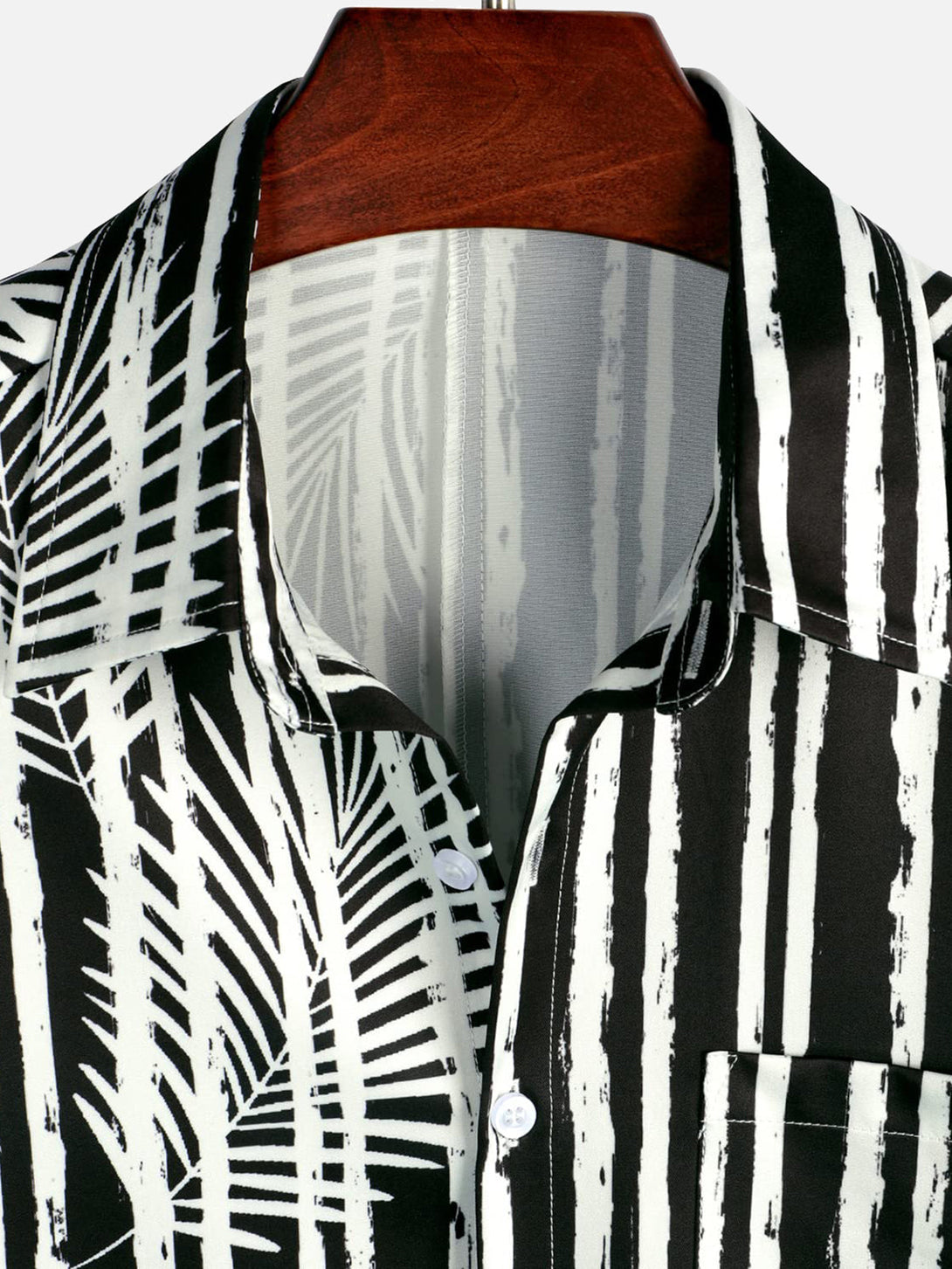 Men's Hawaiian Shirt With Tropical Plant Stripe Print, Pocket, Black, Short Sleeve