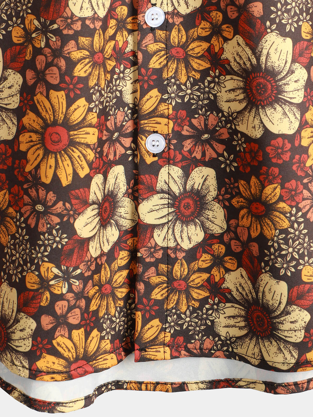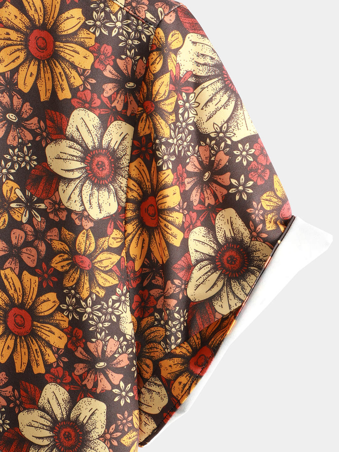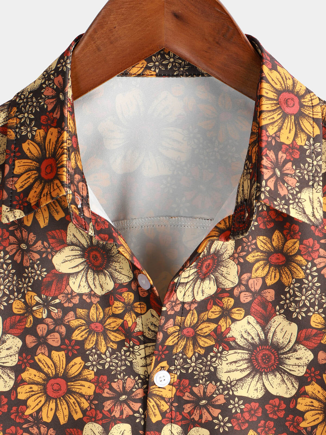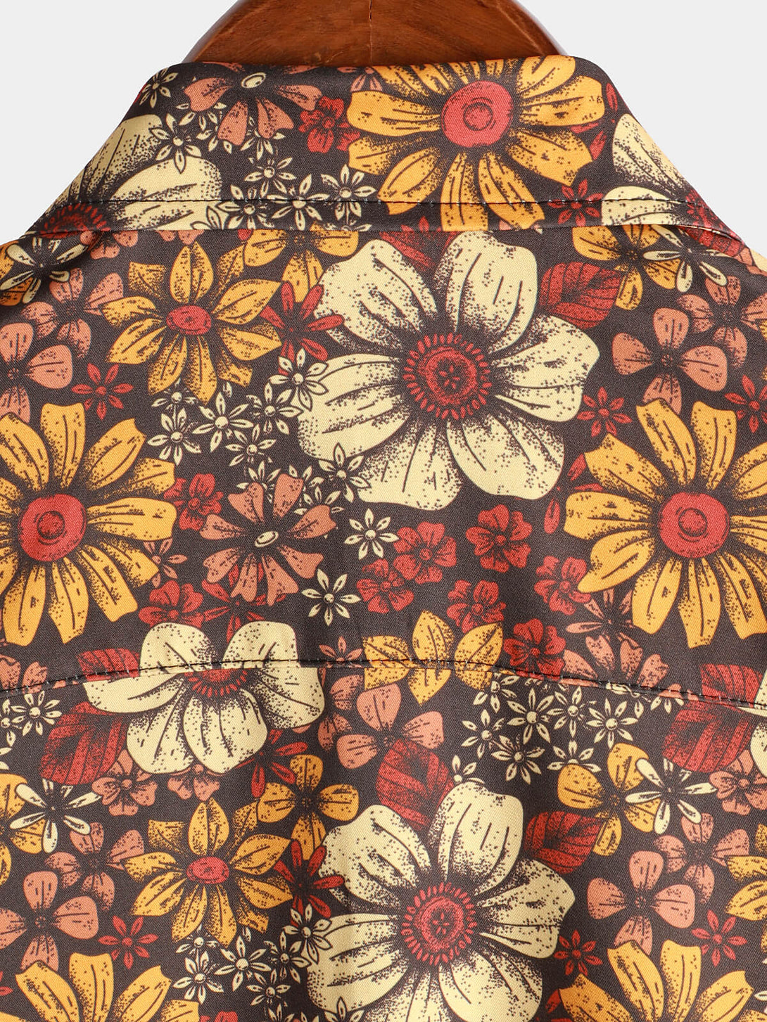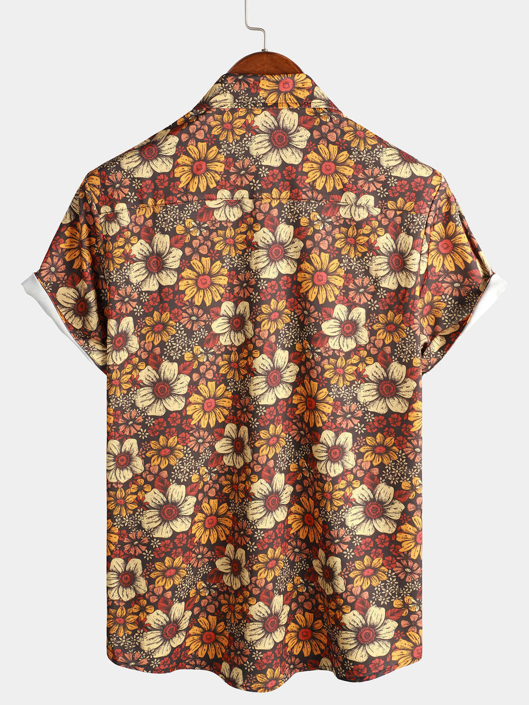 Men's Vintage Floral Button Up 70S Short Sleeve Beach Summer Retro Brown Hawaiian Shirt