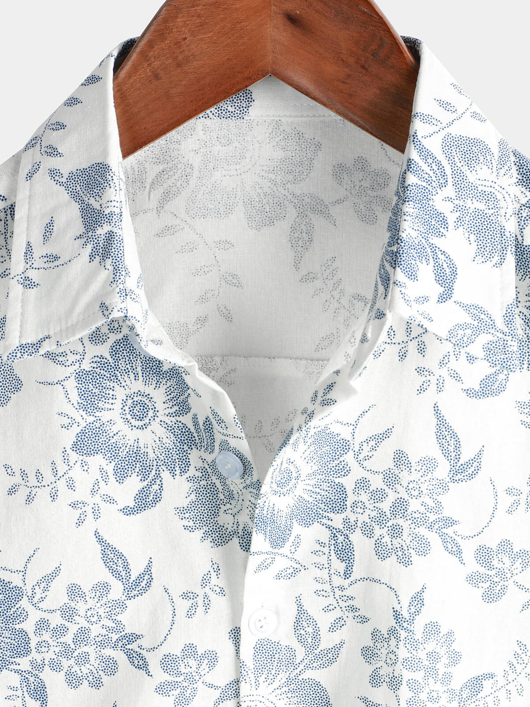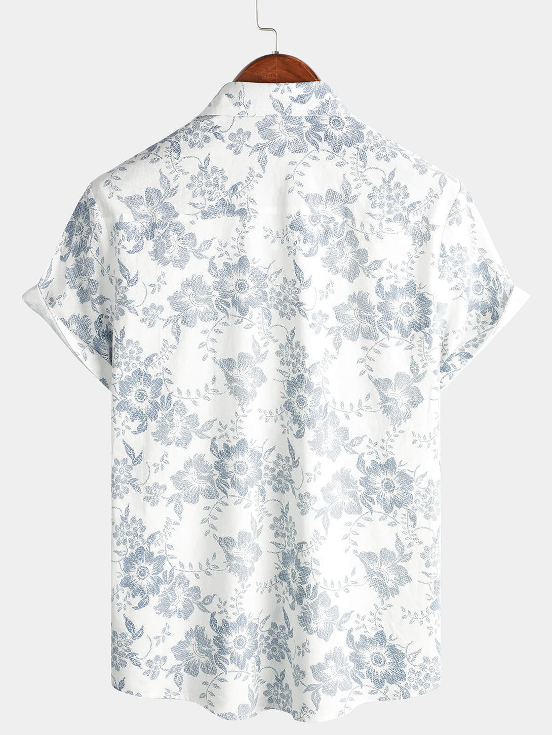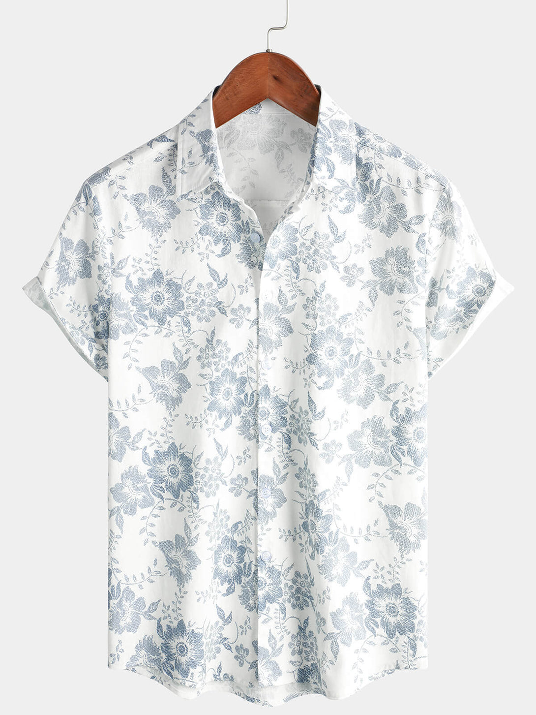 Men's Vintage Floral Print Shirt Floral Vacation Cotton Linen Breathable Short Sleeve Button Down White Hawaiian Summer Shirt