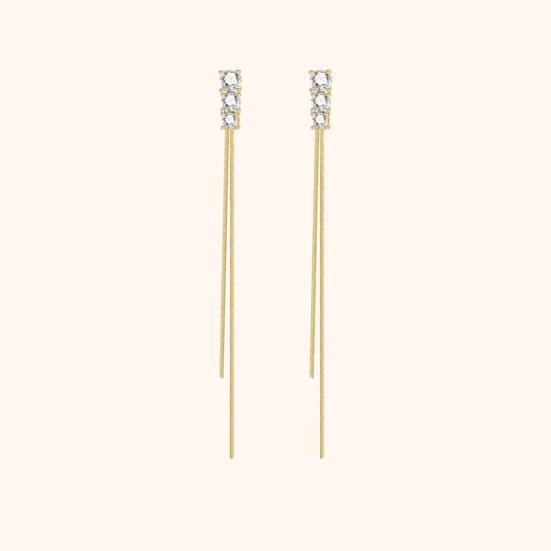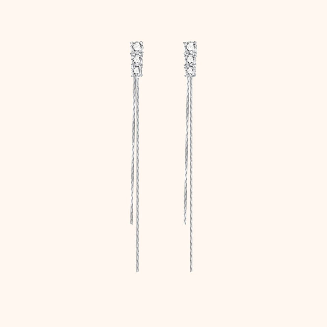 Earrings with a subtle elongated double line design and three decorative zircons at the top, made of sterling silver (S925).