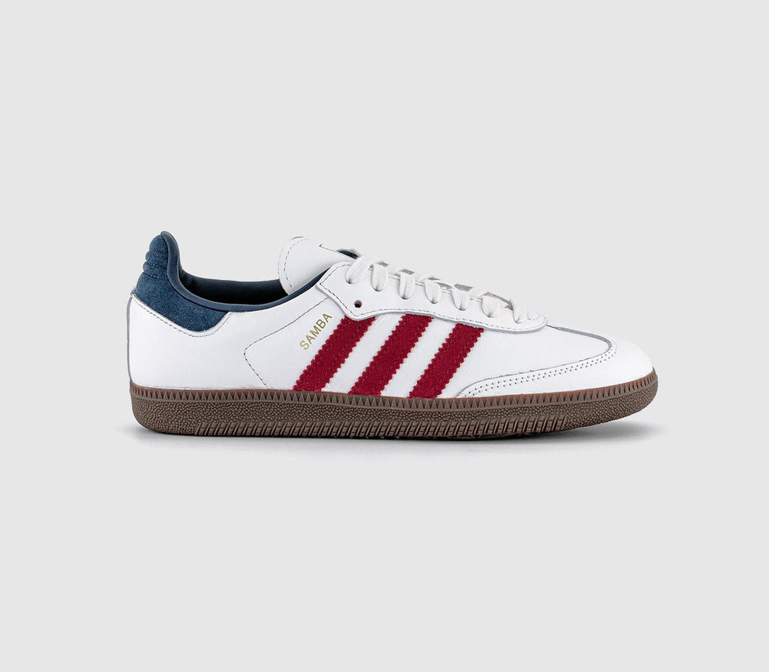 From a pitch necessity to a streetwear essential: The Samba is the icon of the moment. With a textured rubber sole, it stays true to its football heritage. The classic Samba look with gold foil embossing, a fresh white leather Upper Material, bold red 3-Stripes and contrasting navy elements, a classic T-toe design, and a full-grain leather Upper Material.