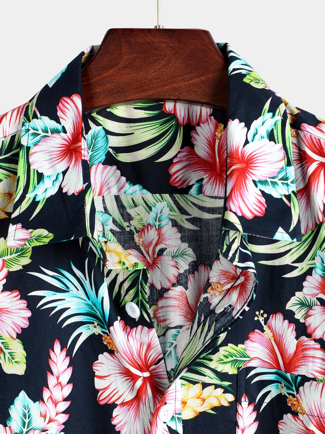 • Button-front shirt with a wide collar and short sleeves.