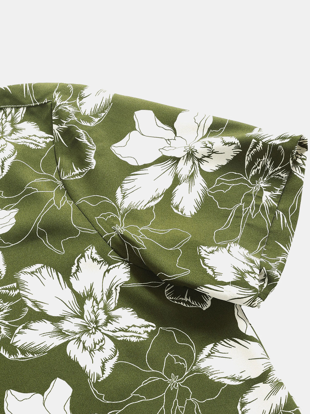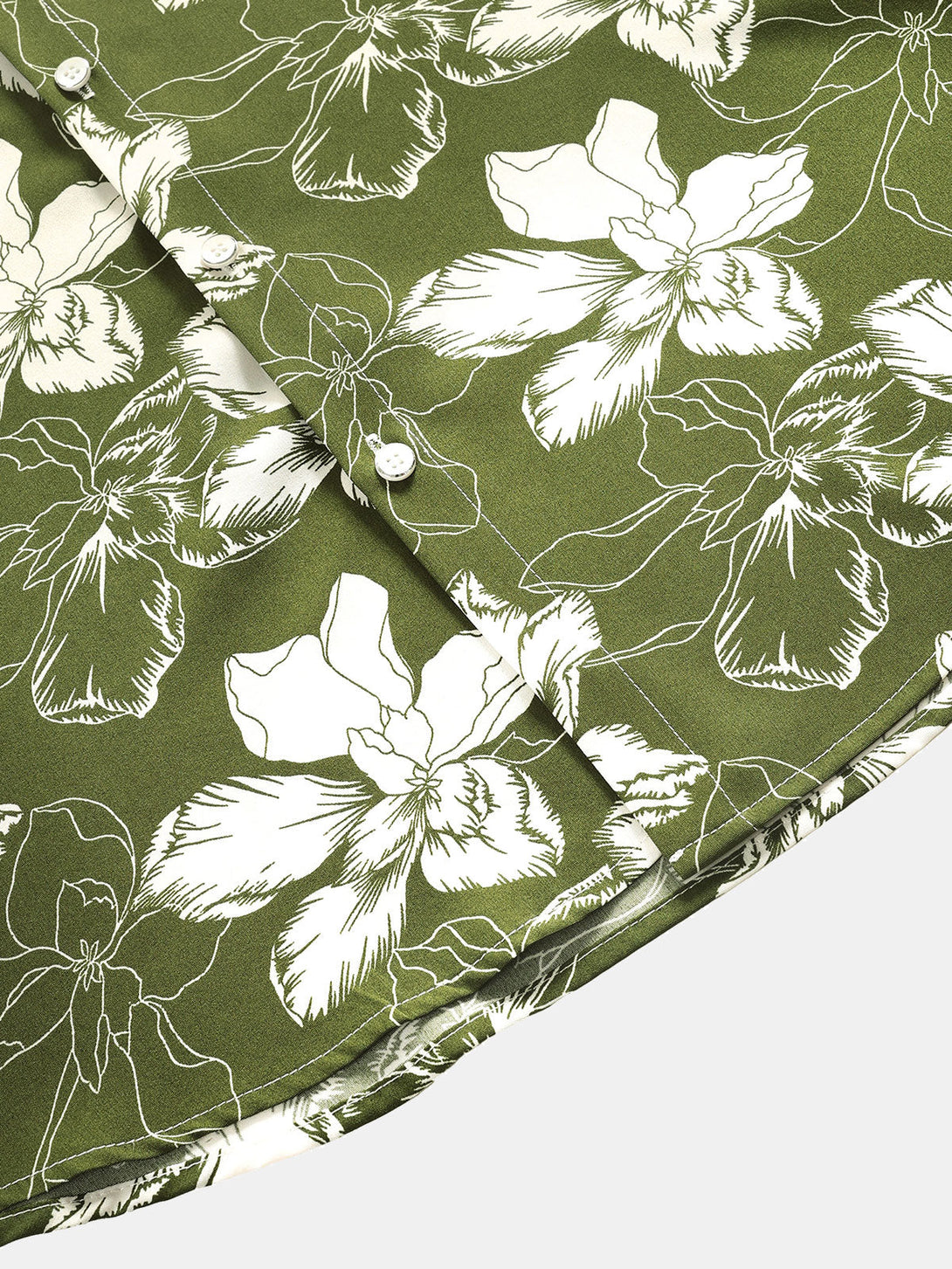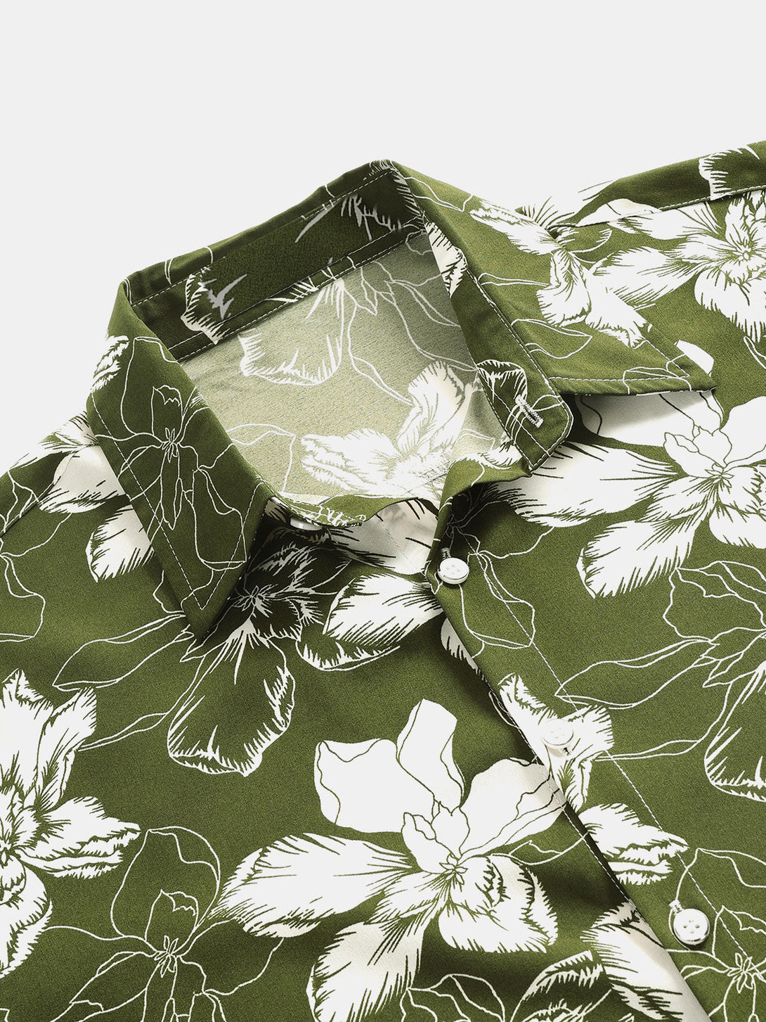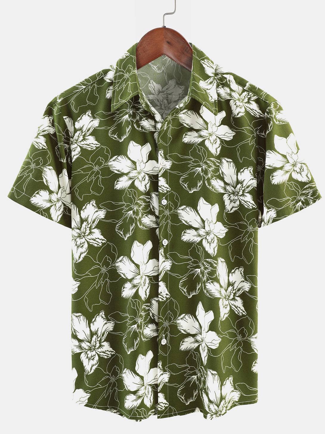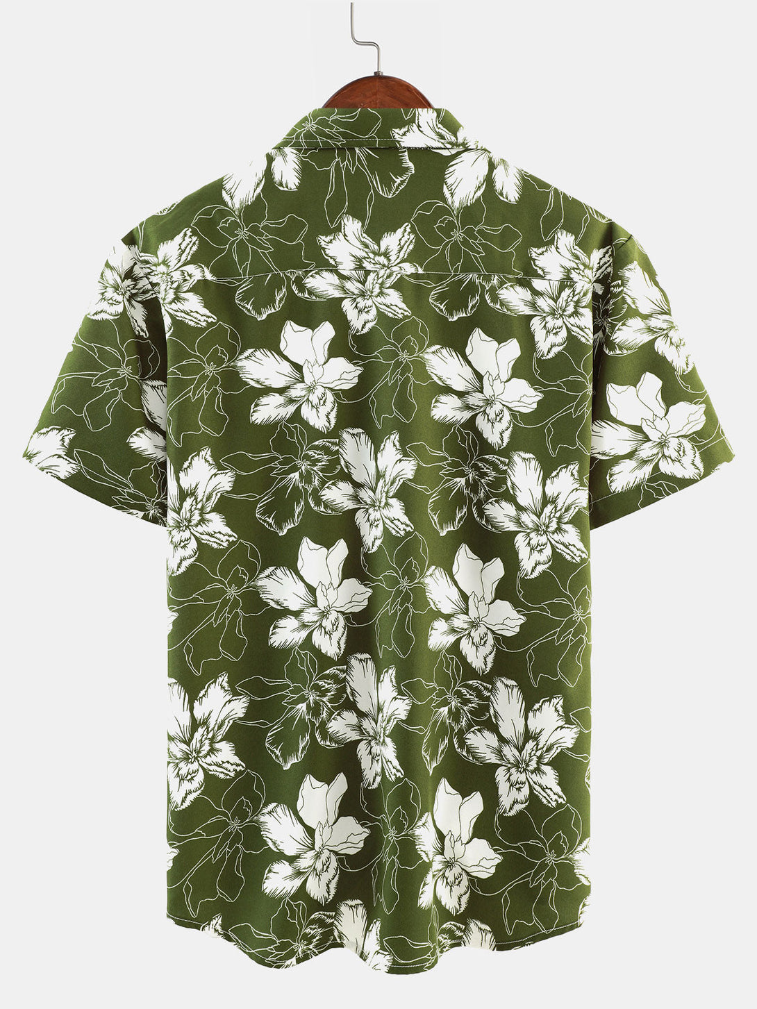 Men's Hawaiian Shirt With Floral Pattern, Summer And Beach Green, Short Sleeve