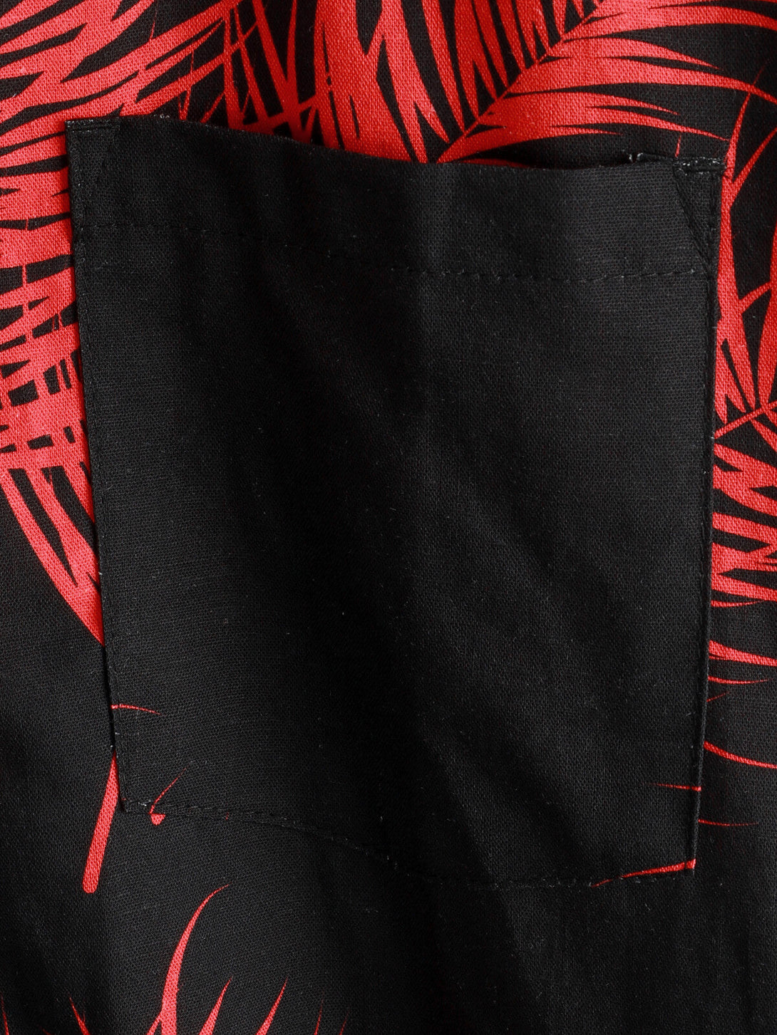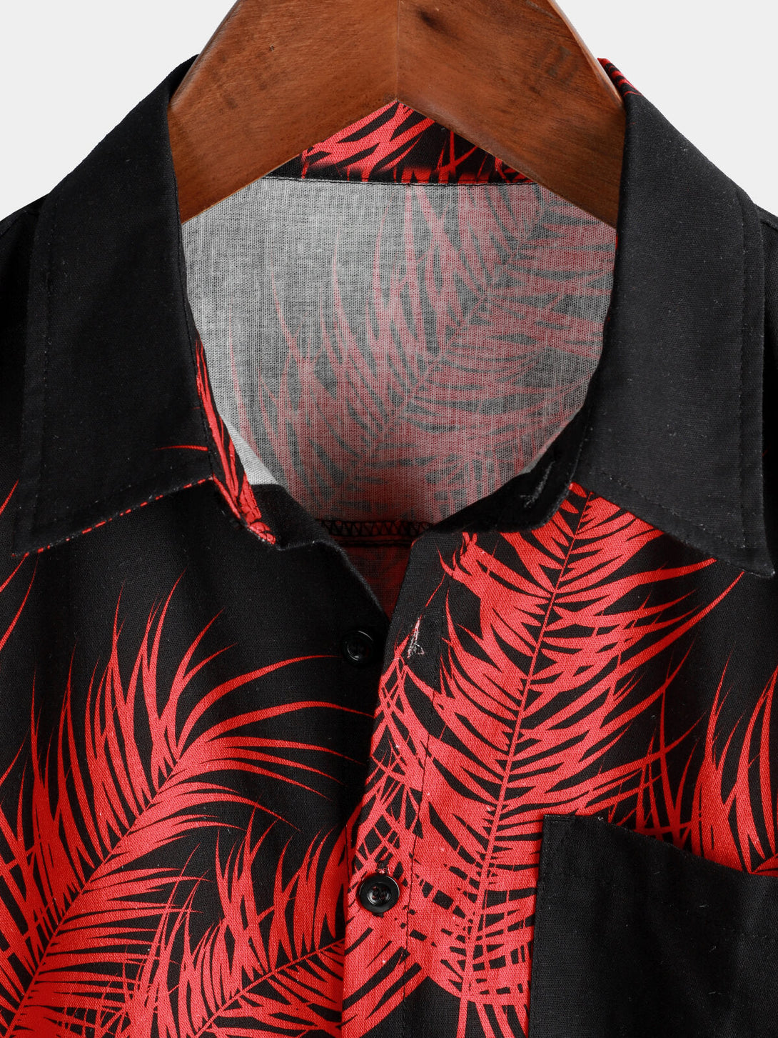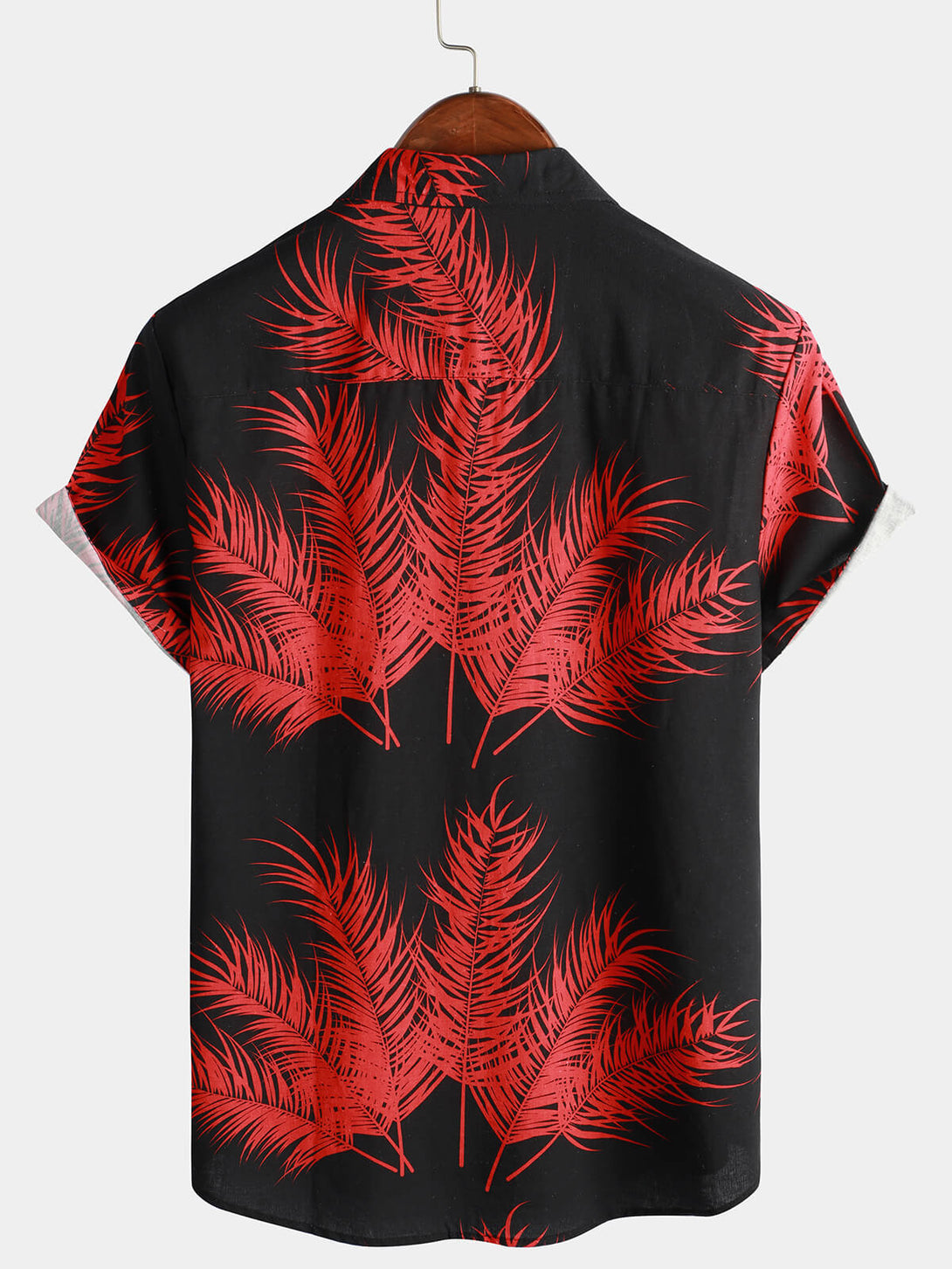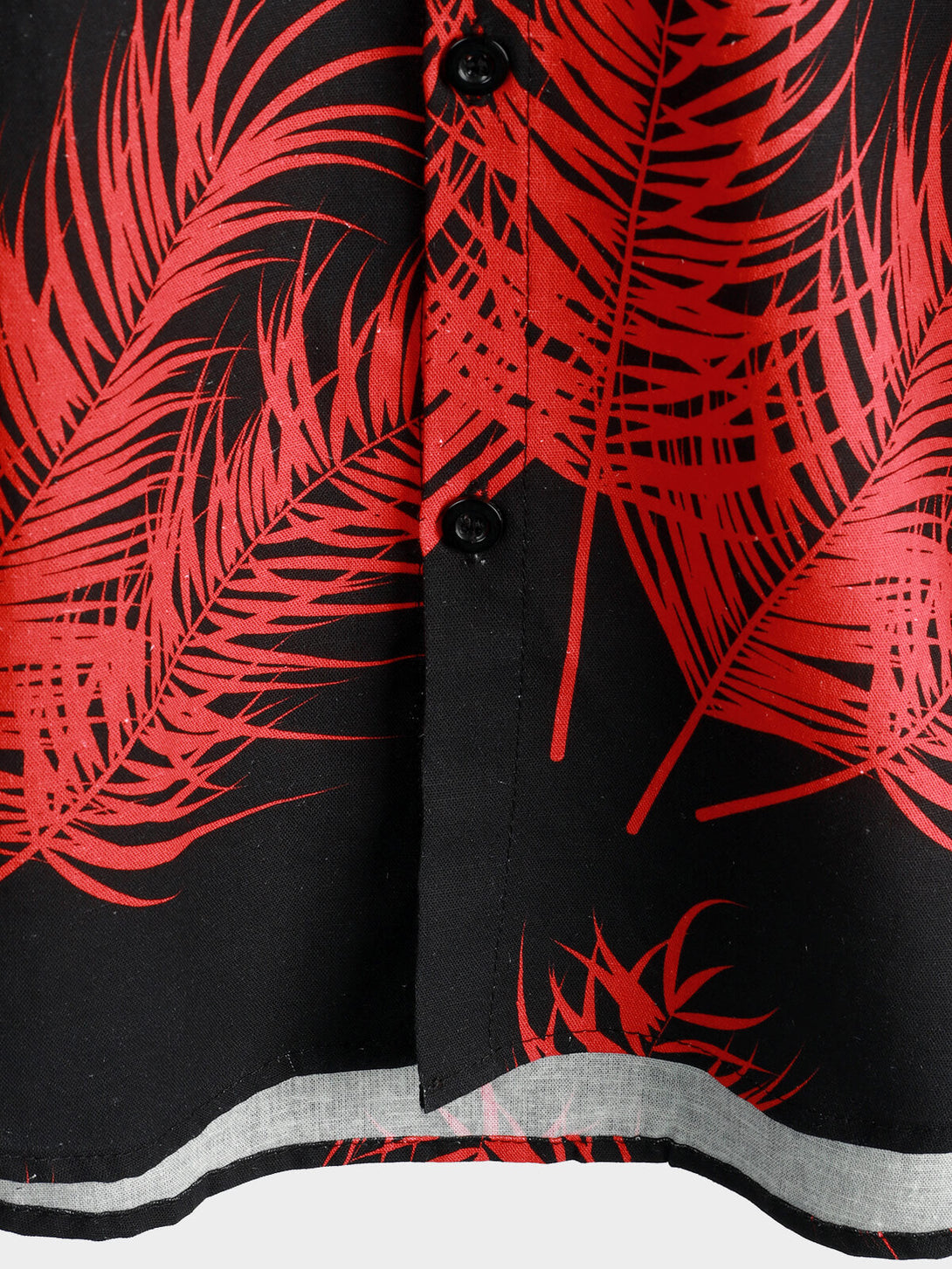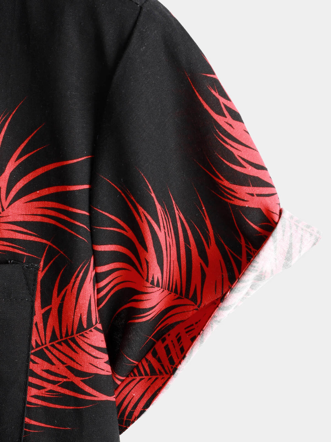 Men's Short-Sleeved Shirt With Hawaiian Palm Leaf Print Made Of Cotton Linen With Button Placket