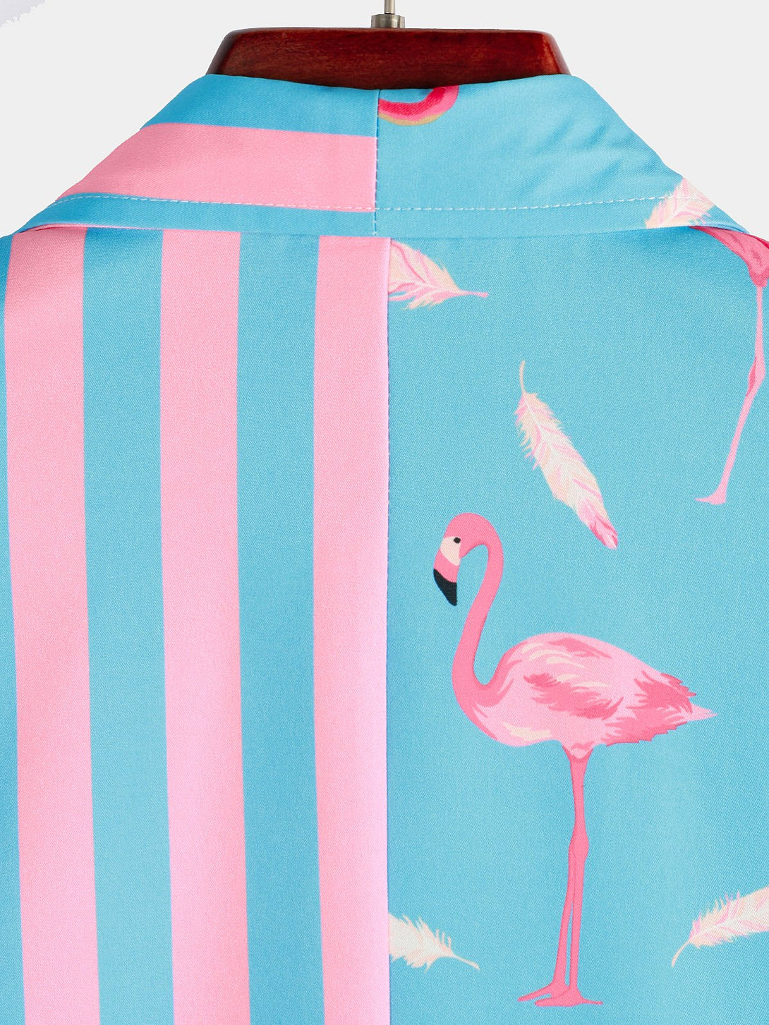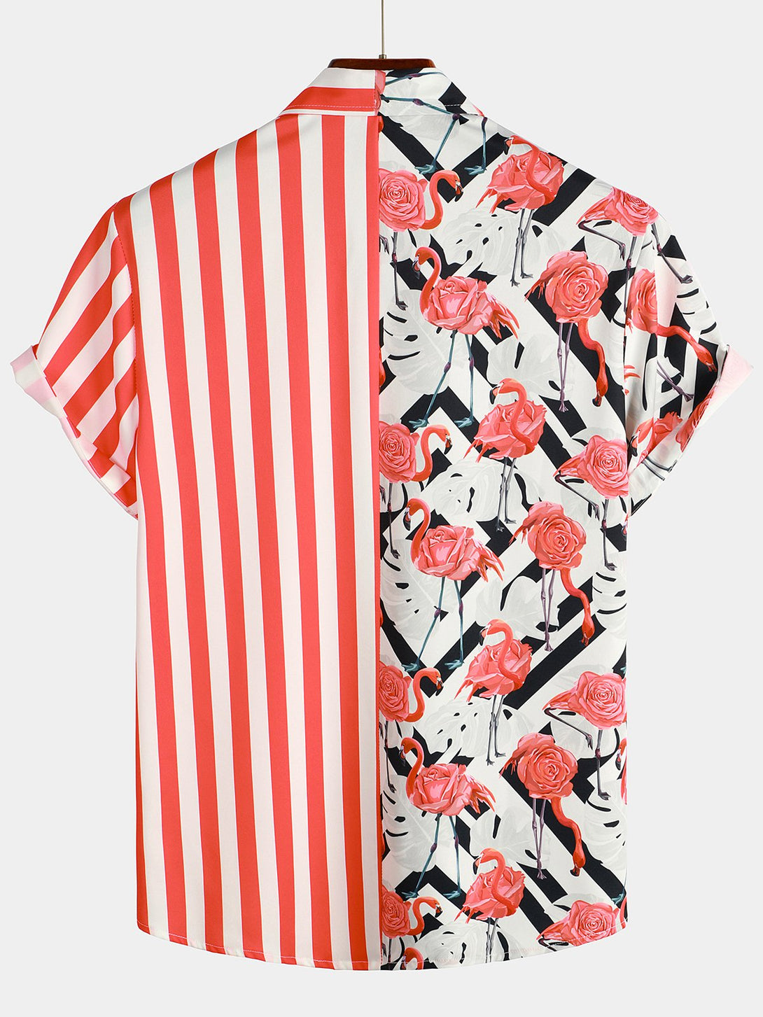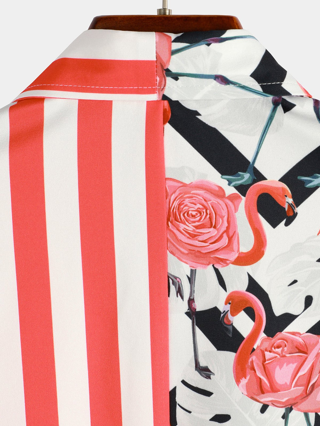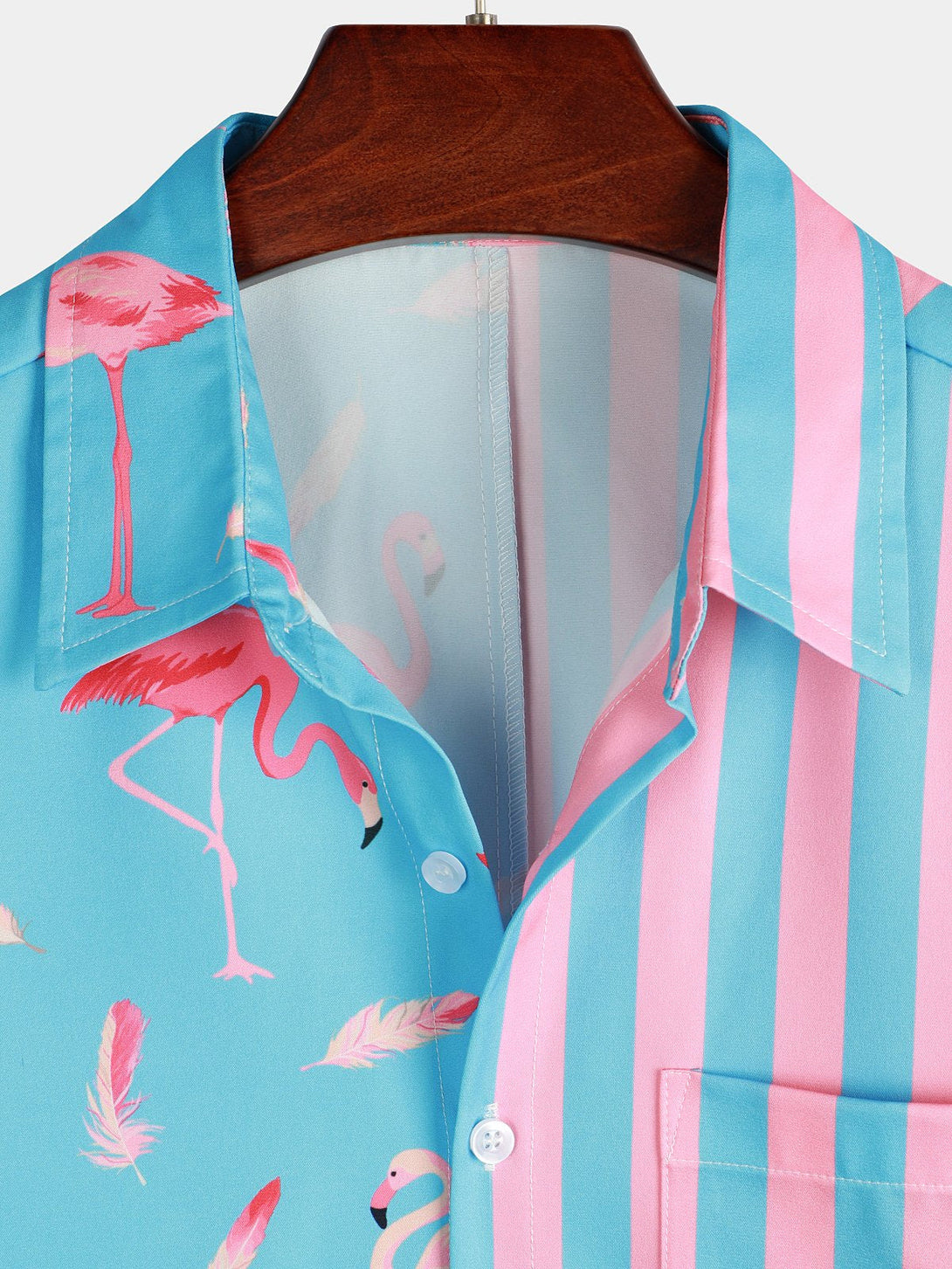 Men's Casual Shirt With Flamingo And Stripe Patchwork Pockets
